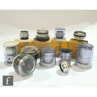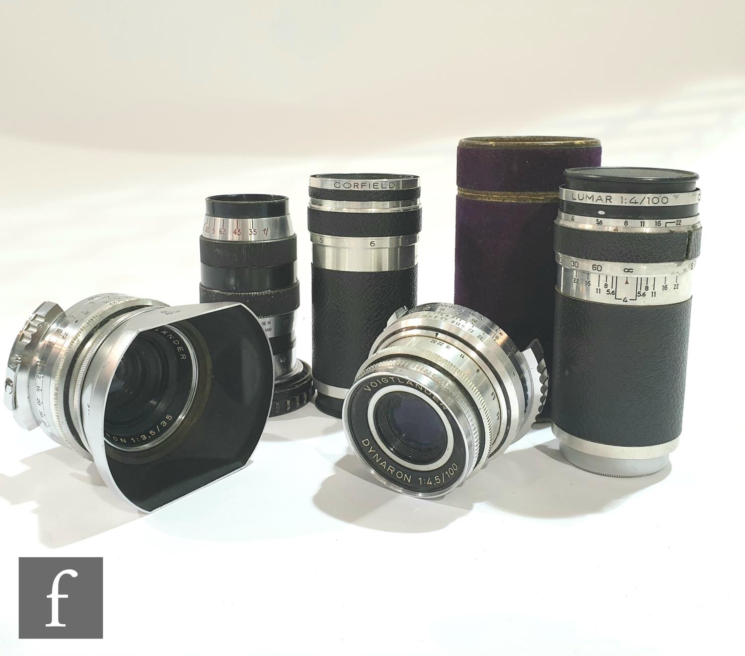 A collection of Voigtländer, Ross and Corfield lenses, to include a Voigtländer Dynaron 1:4.5/100 serial number 3742668 and a Skoparon 1:3.5/35mm lens, serial number 310/49, a Ross London Tralux f.3.5 serial number 205272 and two Corfield lenses, Lumar 1:4/100, serial numbers L0915528 and 816268. (qty)