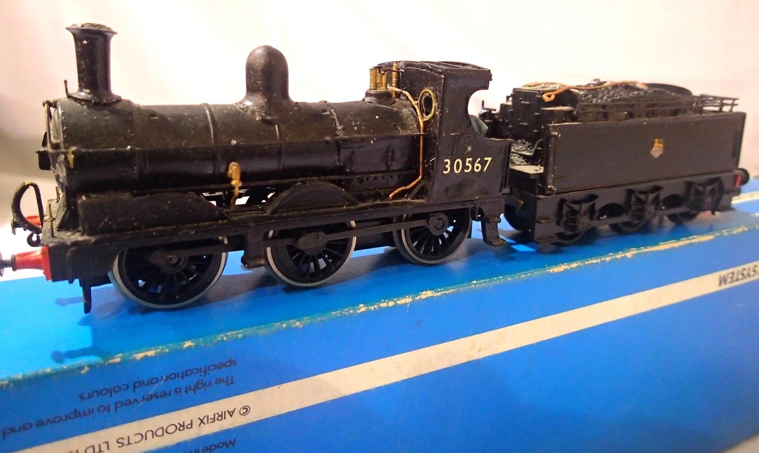 Kit built 0.6.0. locomotive 30567 with Hornby tender drive, Black, Early Crest, detailed in fair condition, body loose, wrong box. P&P Group 1 (£14+VAT for the first lot and £1+VAT for subsequent lots)