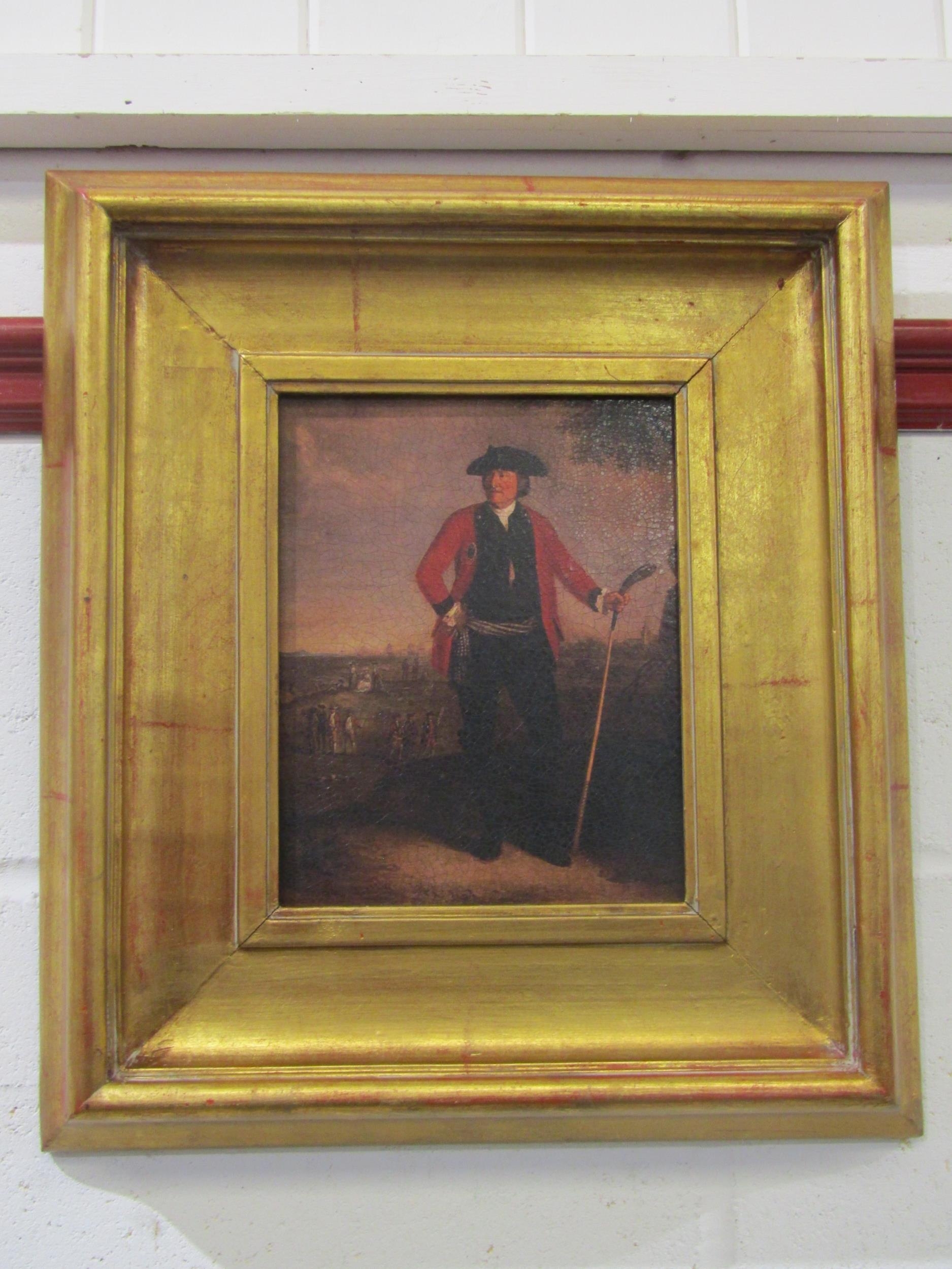 An oleograph of William Inglis playing golf, after David Allan, gilt framed, 24cm x 19cm image size