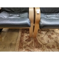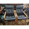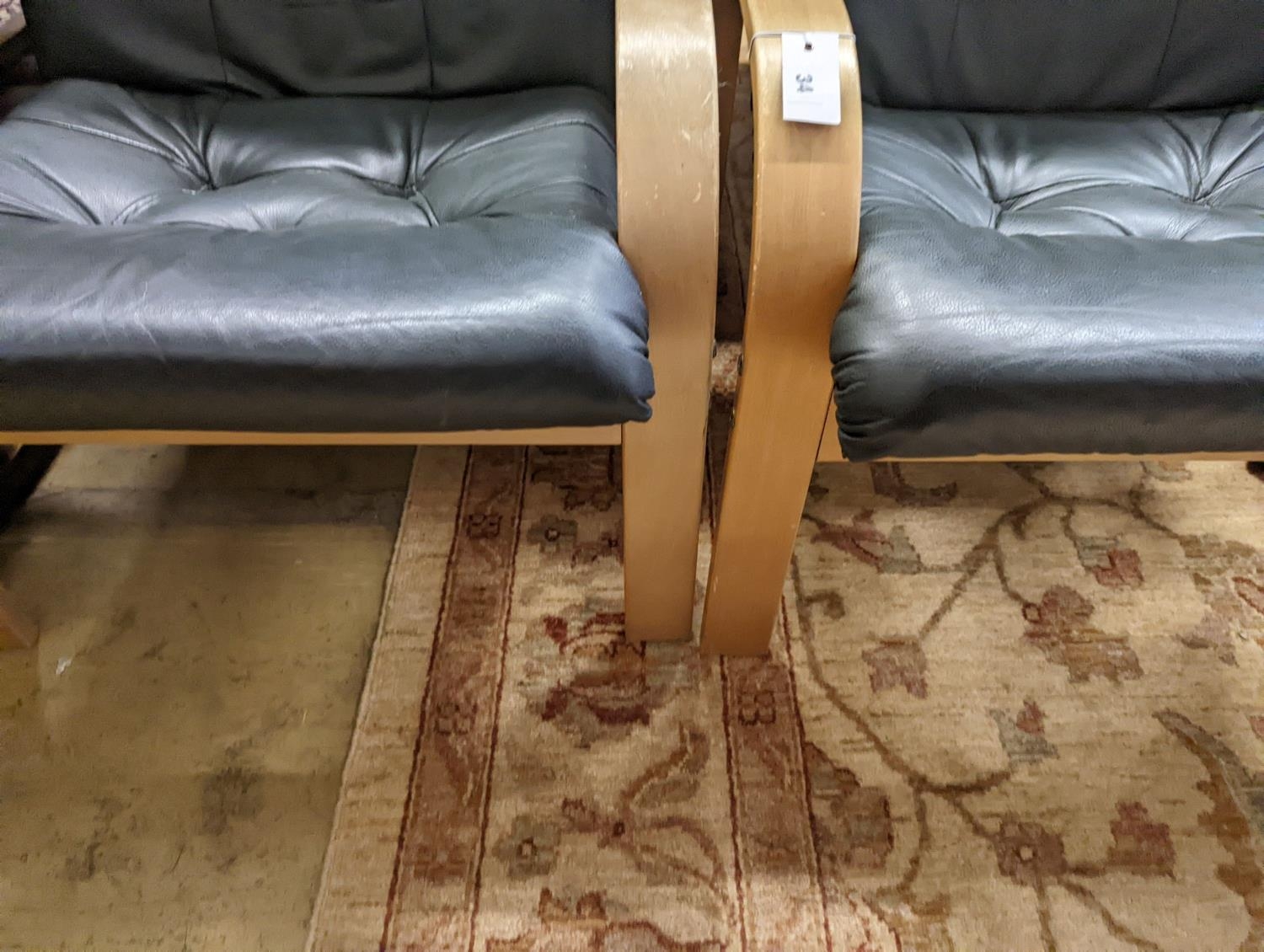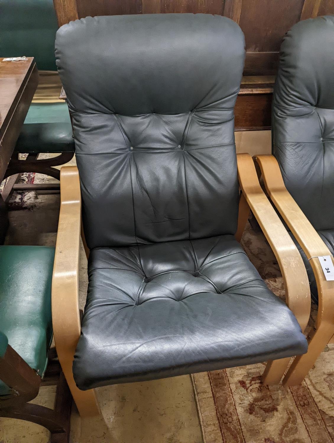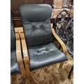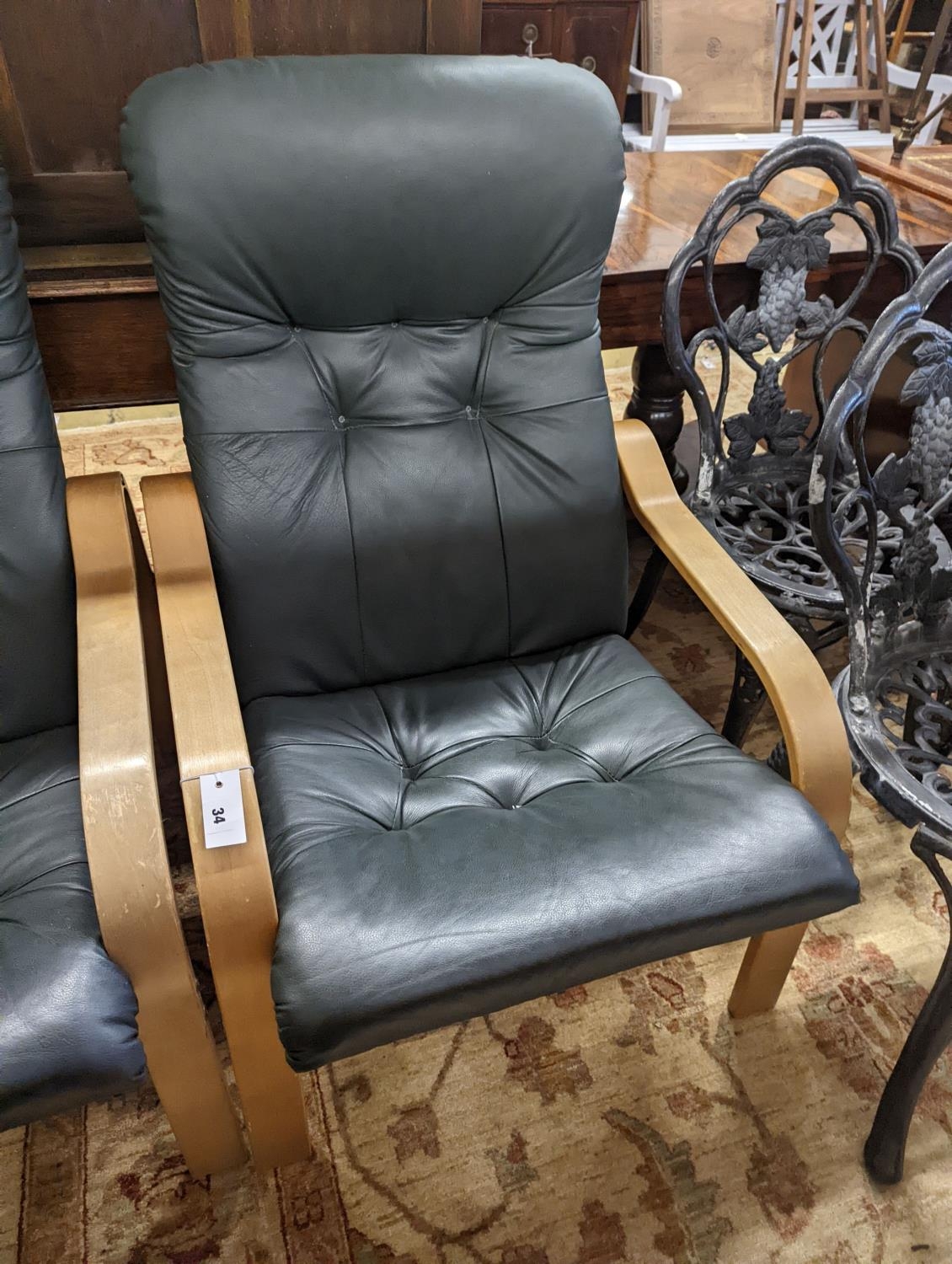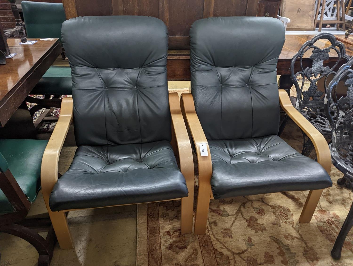 A pair of mid century Norwegian green leather and bent ply armchairs, width 68cm, depth 80cm, height 96cm