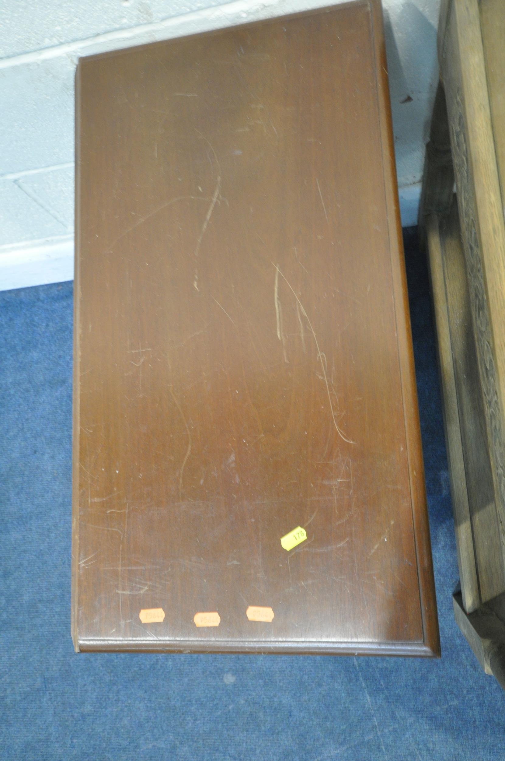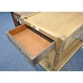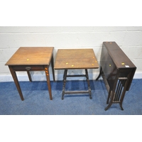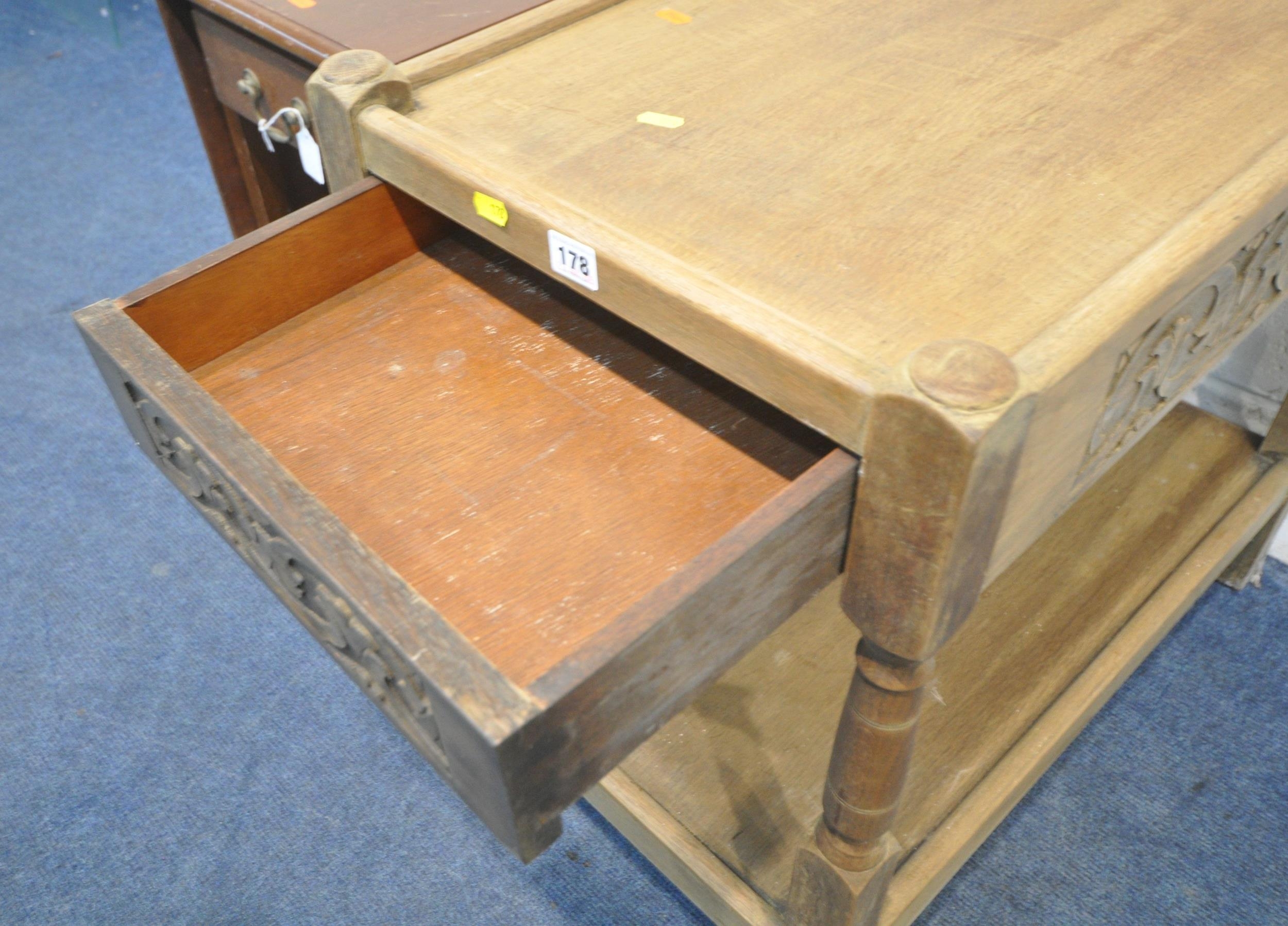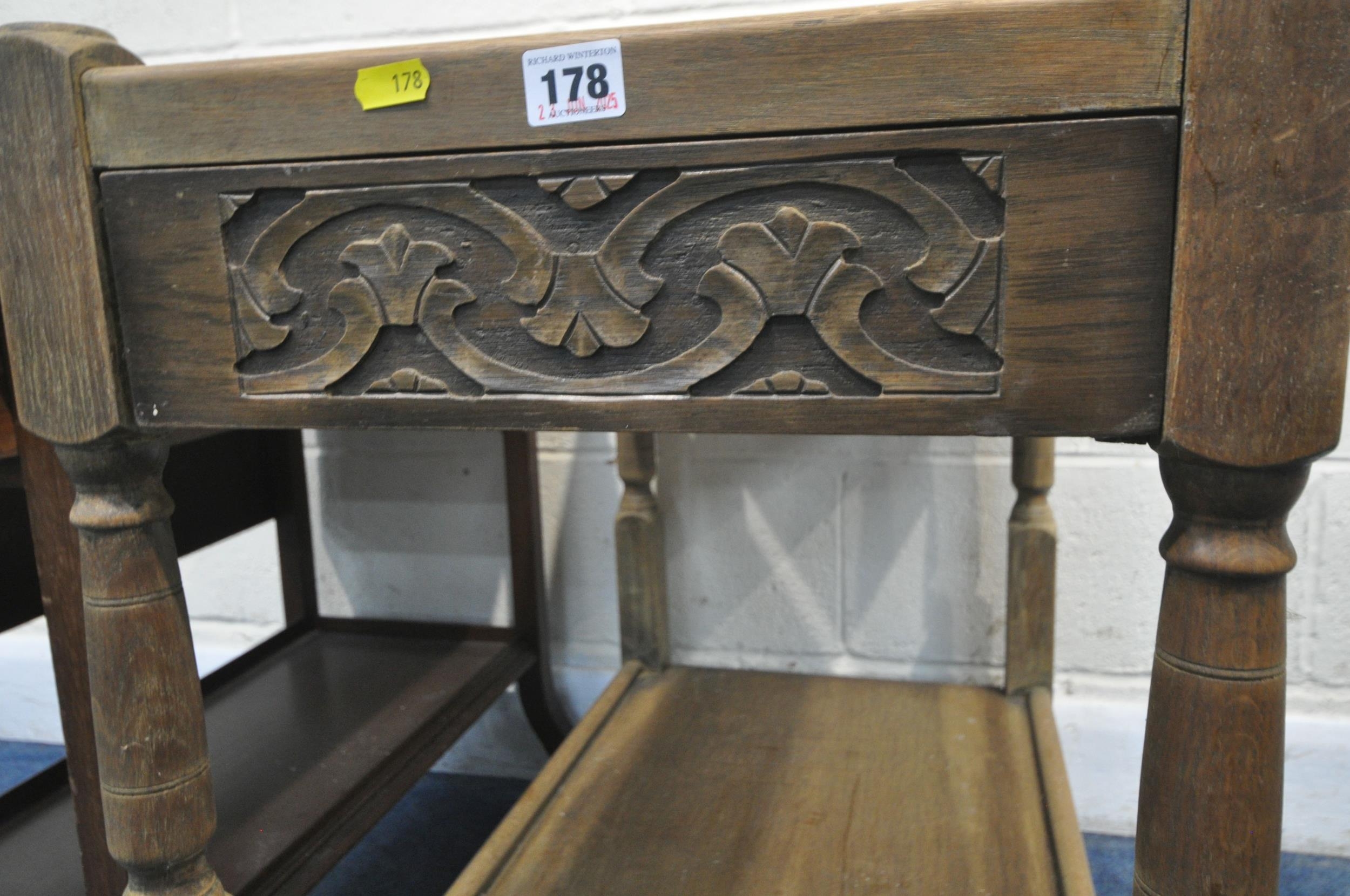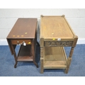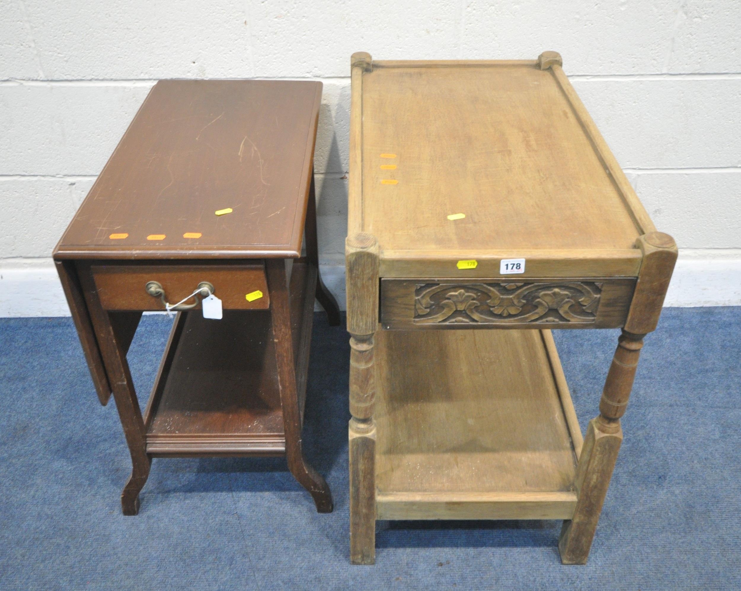 A LATE 20TH CENTURY OAK TWO TIER TABLE with a drawer to each end, width 76cm x depth 43cm x height 71cm, along with another two tier table, with a single drawer, and one drop leaf, condition report: both with imperfections, such as marks, scuffs, scratches, discolouration, other wear and usage (2)