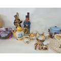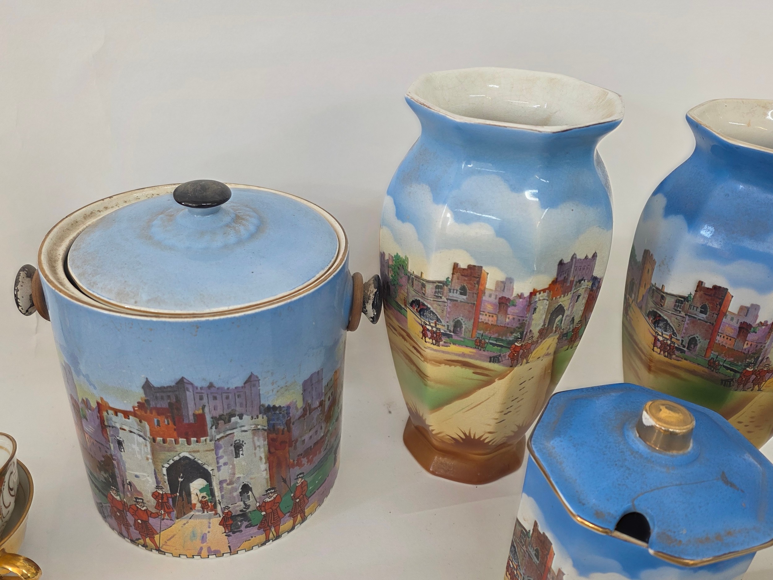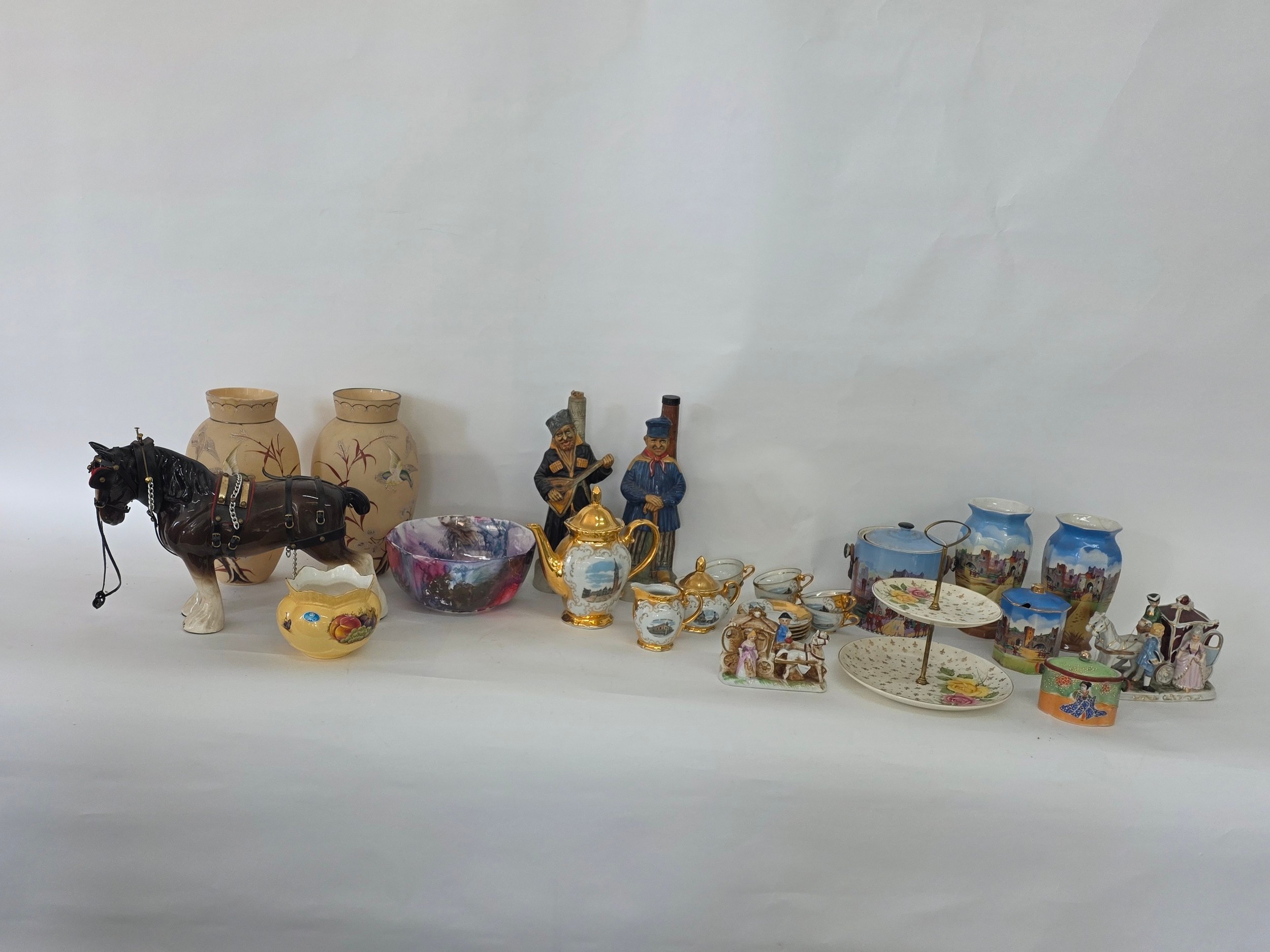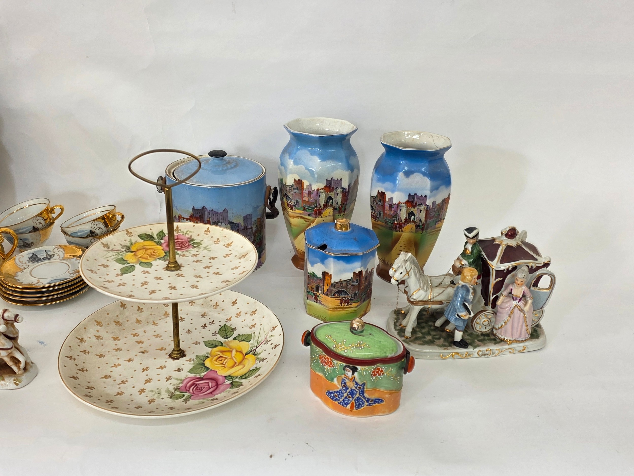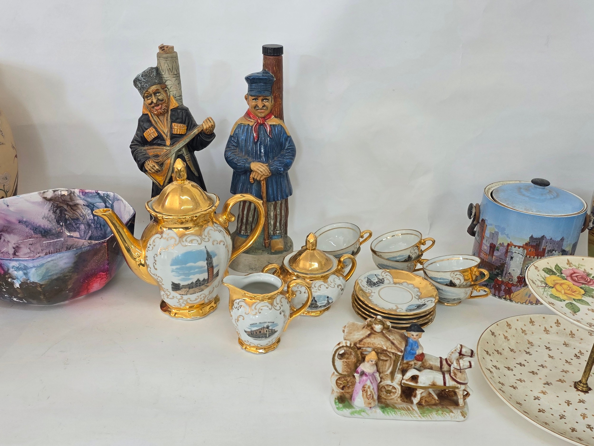 A good mixed lot of ceramics to include a Venezia Gold Gilt Porcelain Tea Set, Newhall Hanley Vases and Biscuits Barrels, KLEM Liquor bottle characters, Anysley bowl, cake stand, pair of Chinosserie vases and more