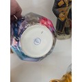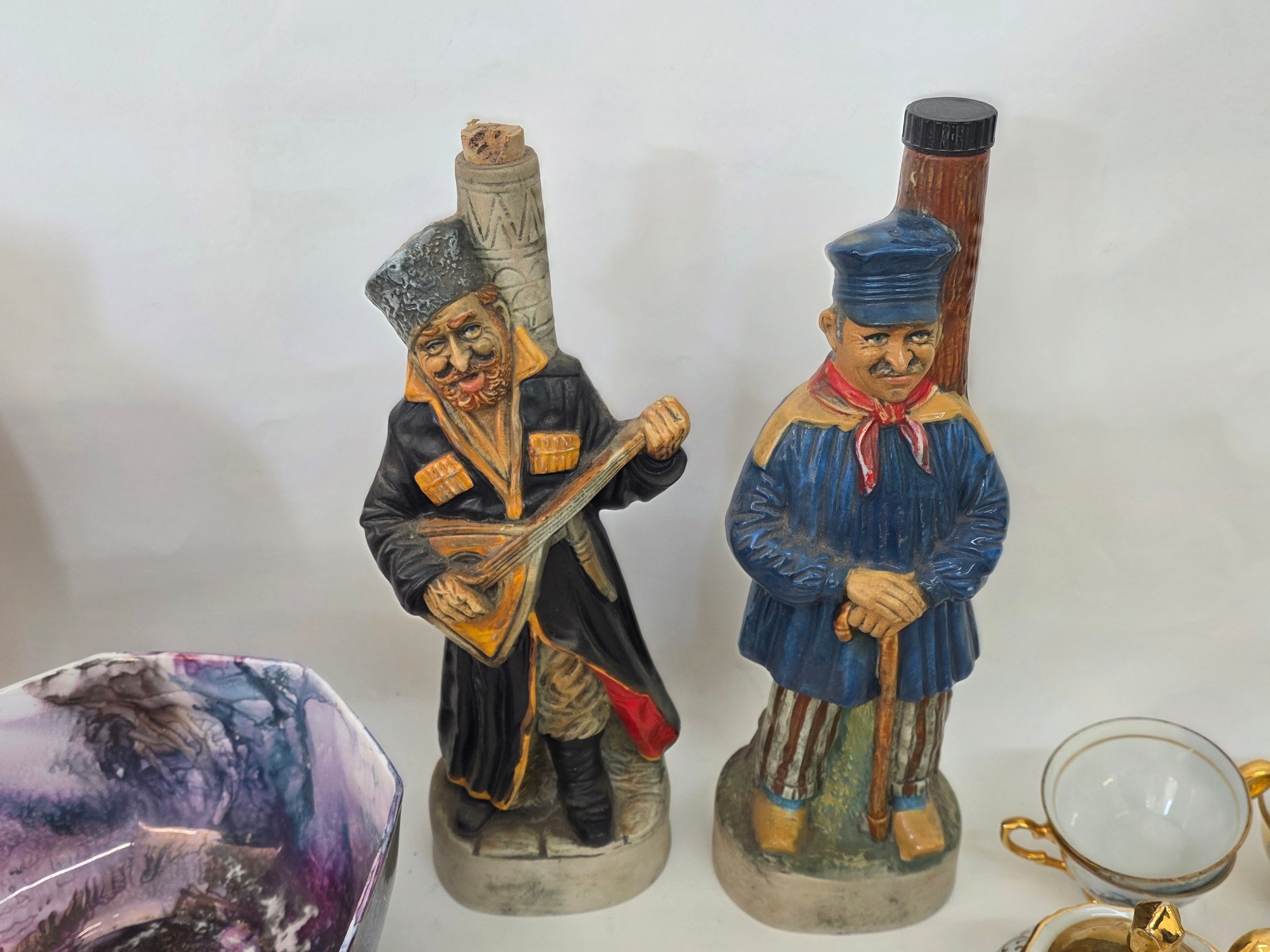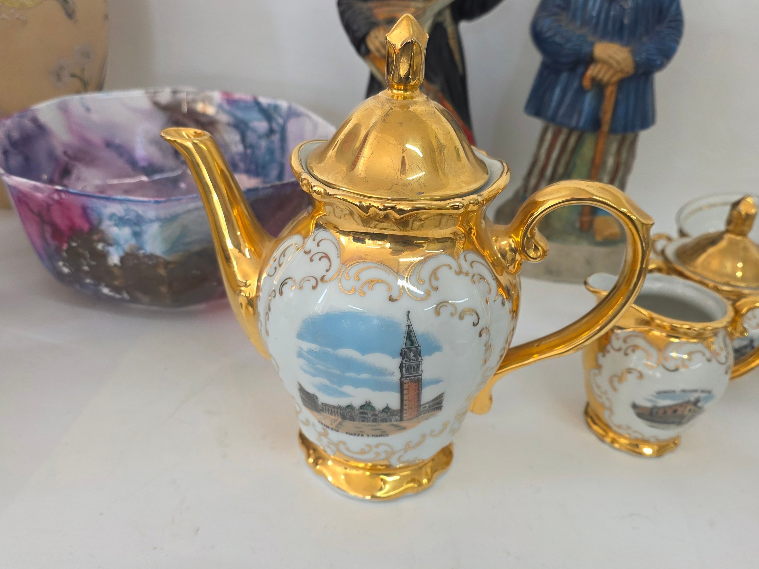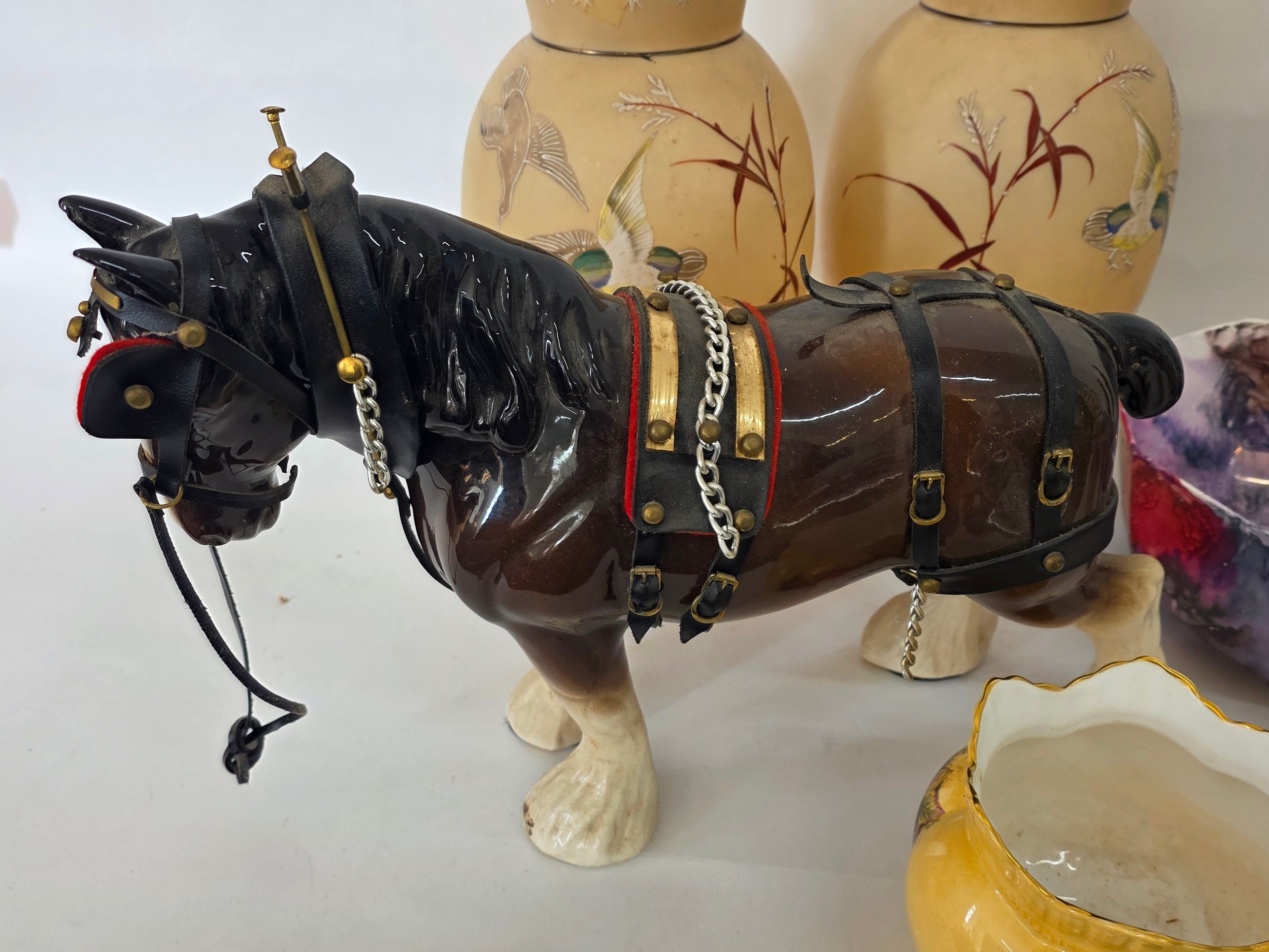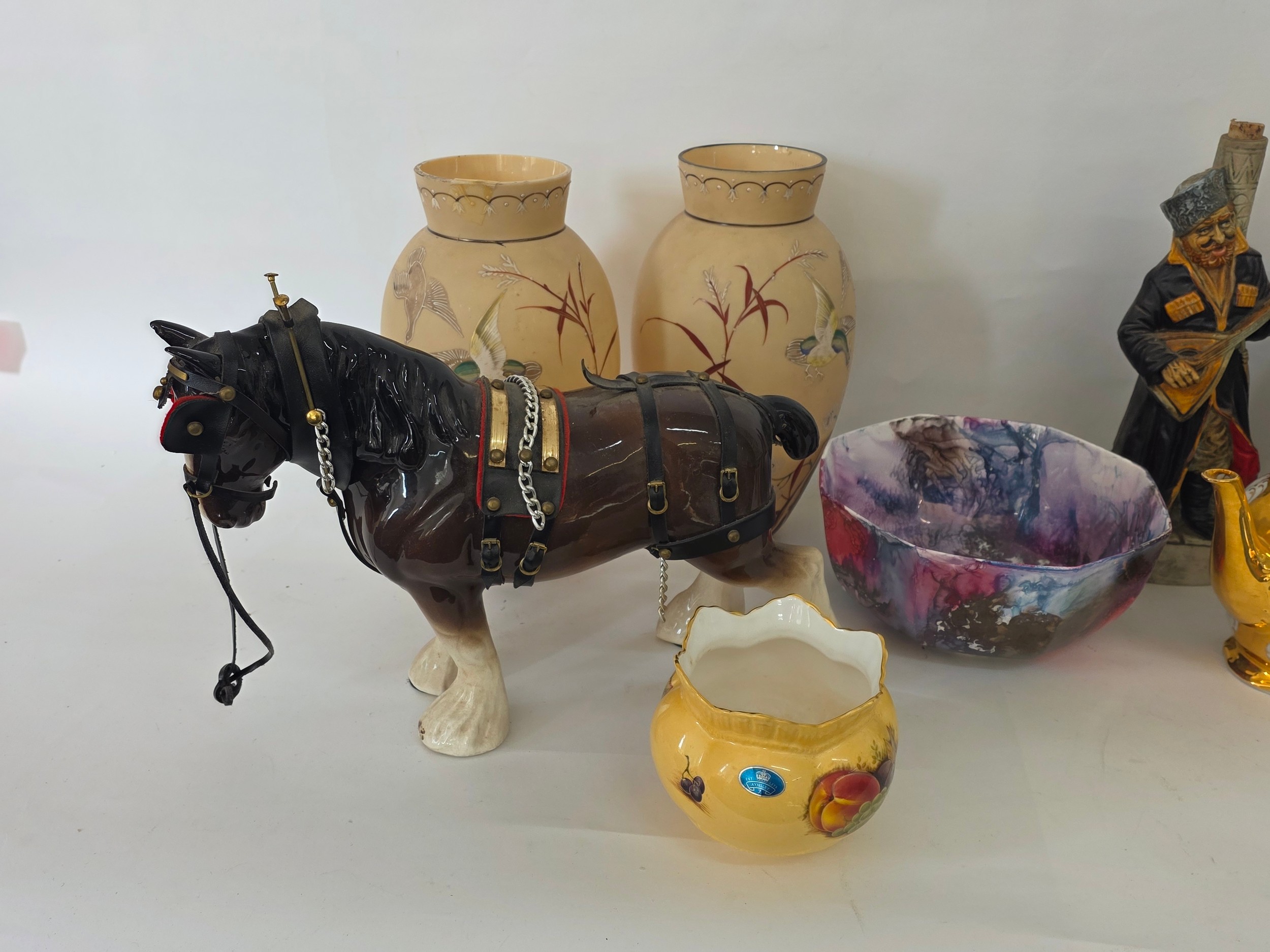 A good mixed lot of ceramics to include a Venezia Gold Gilt Porcelain Tea Set, Newhall Hanley Vases and Biscuits Barrels, KLEM Liquor bottle characters, Anysley bowl, cake stand, pair of Chinosserie vases and more