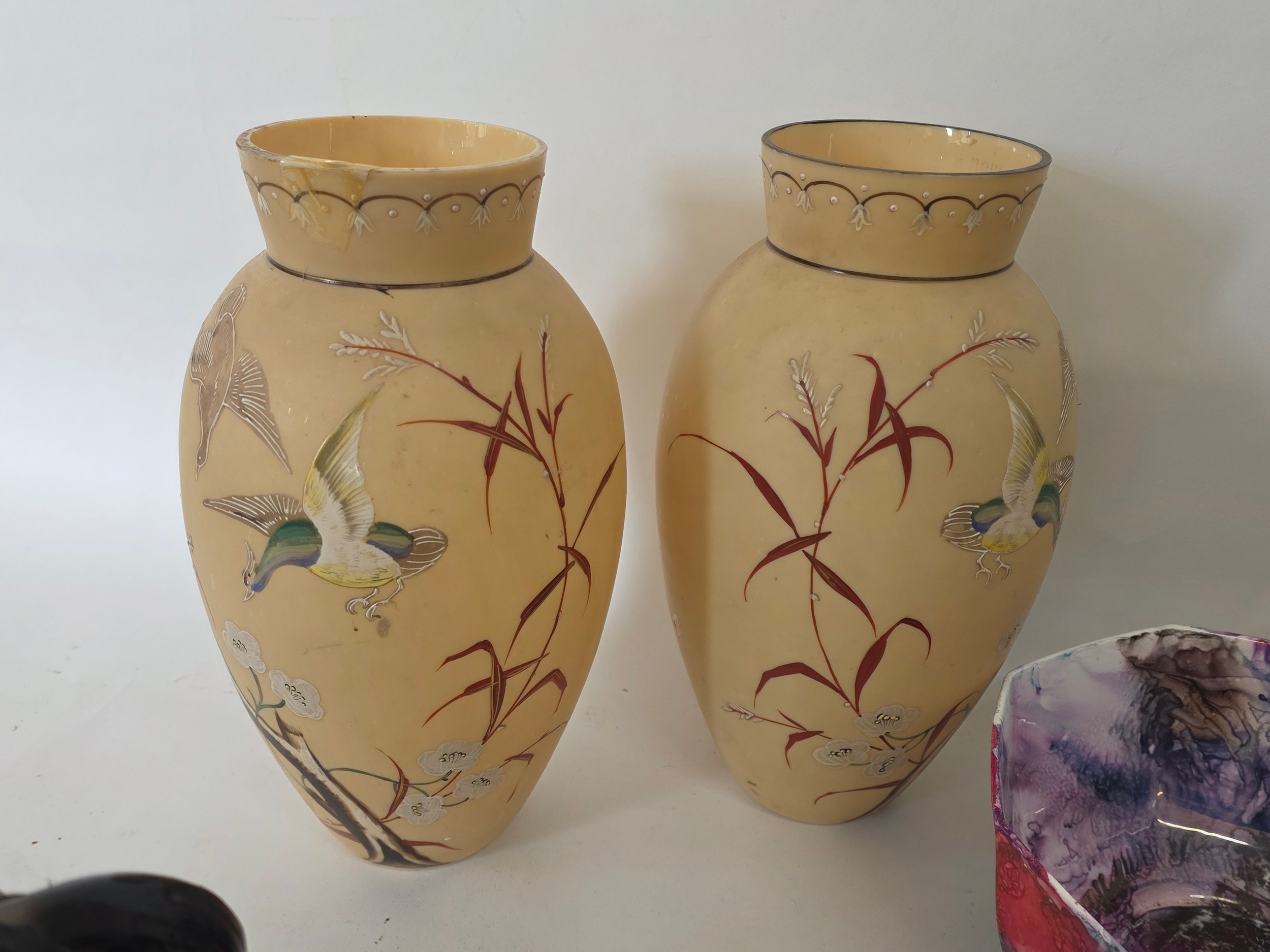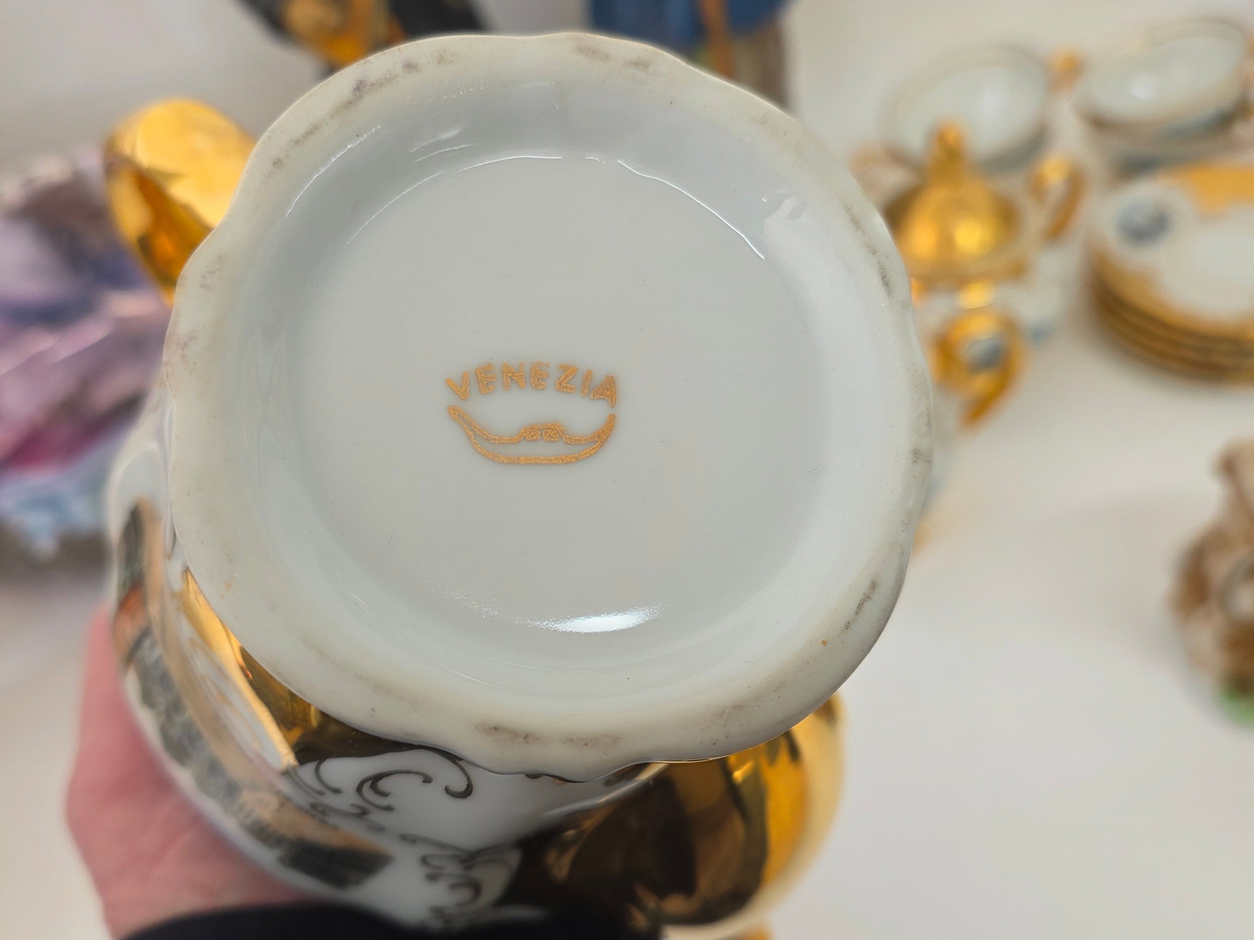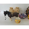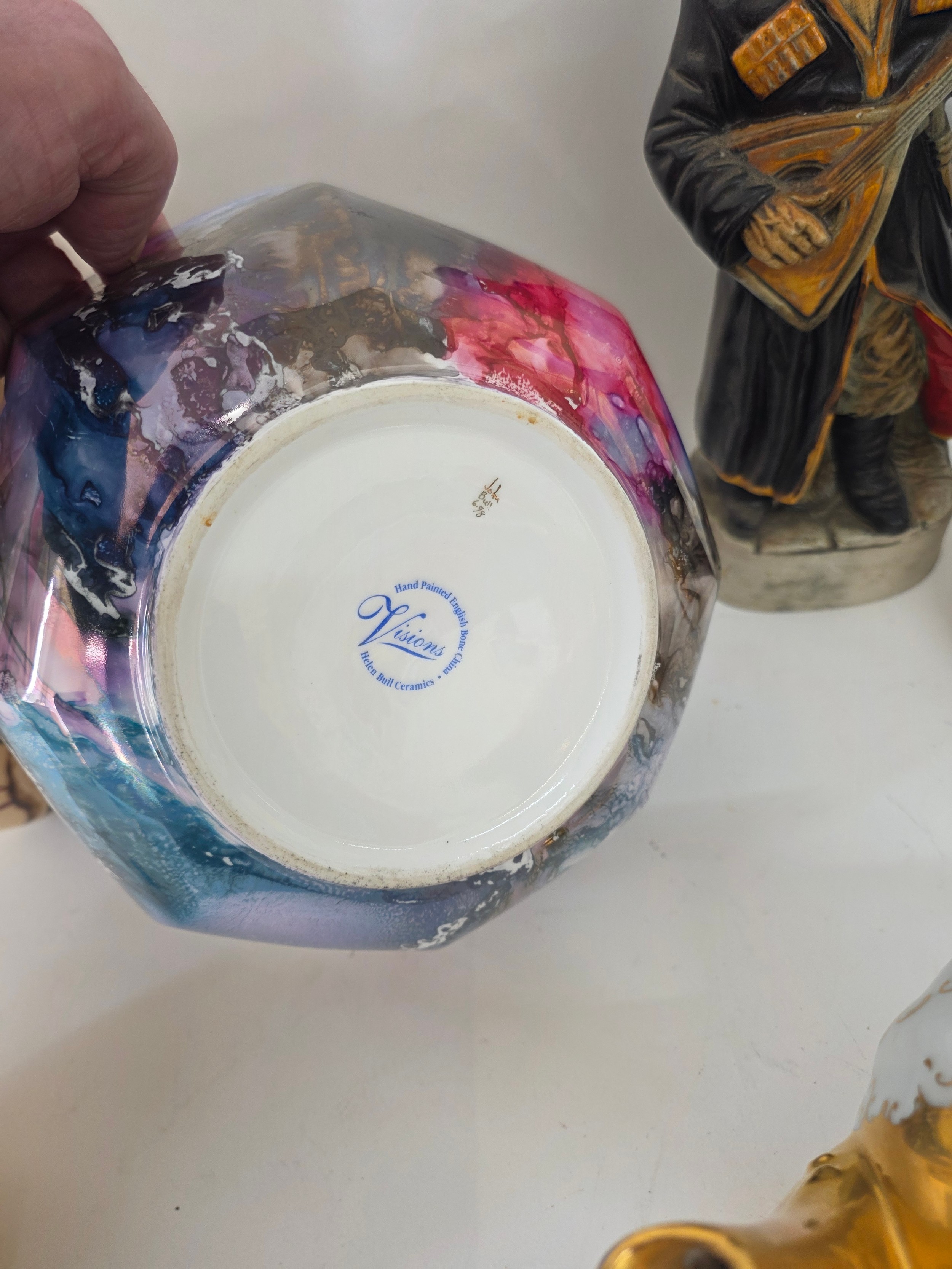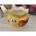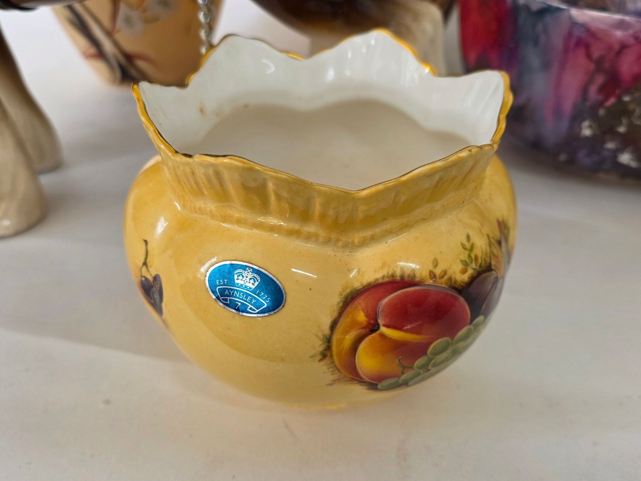A good mixed lot of ceramics to include a Venezia Gold Gilt Porcelain Tea Set, Newhall Hanley Vases and Biscuits Barrels, KLEM Liquor bottle characters, Anysley bowl, cake stand, pair of Chinosserie vases and more
