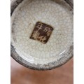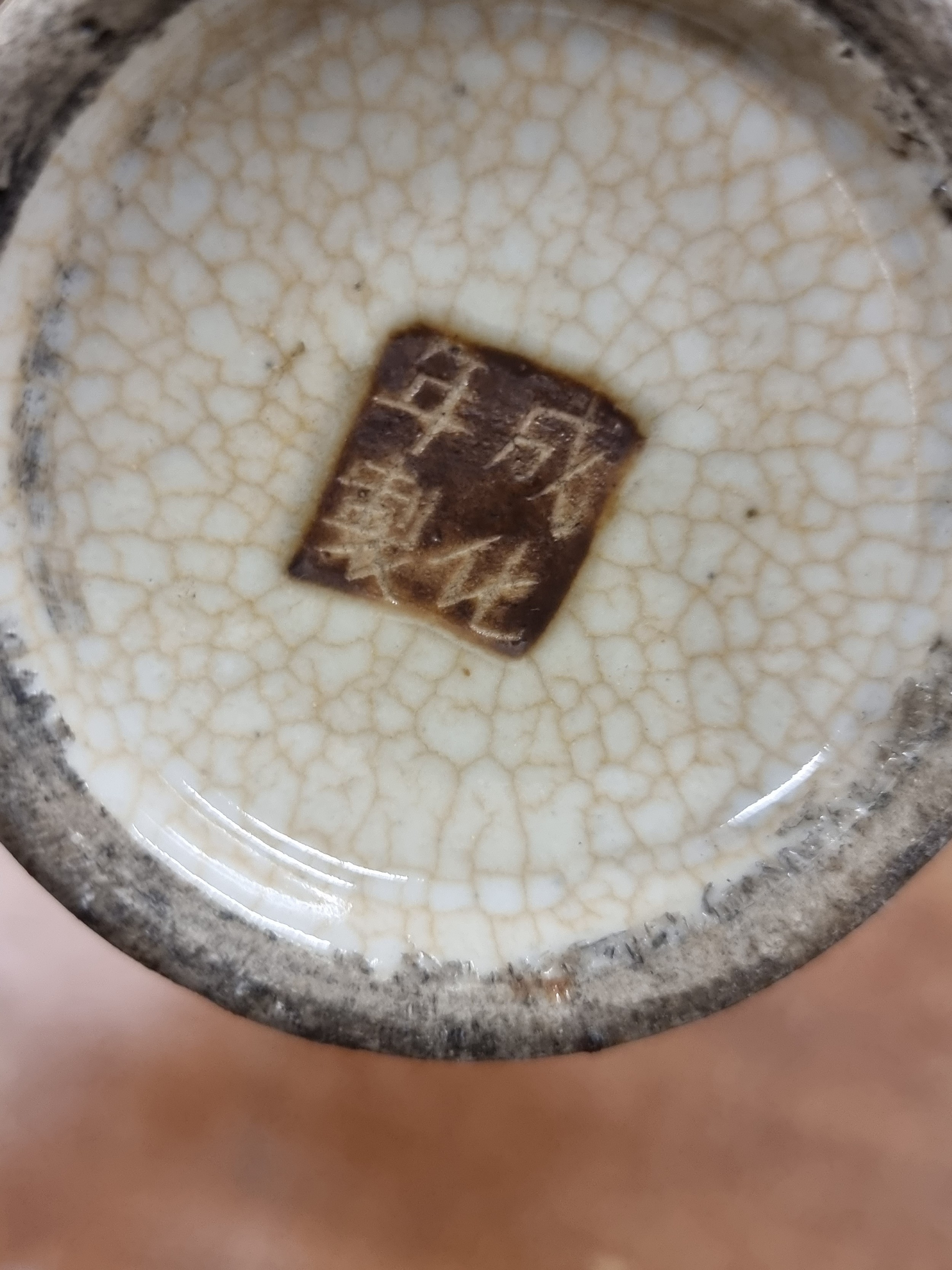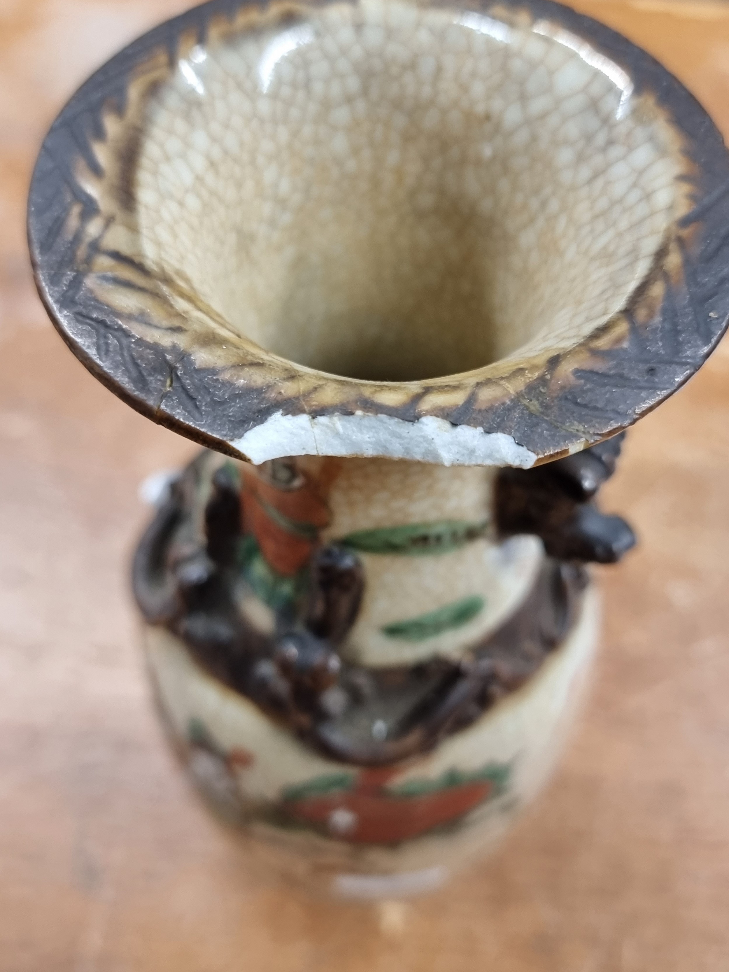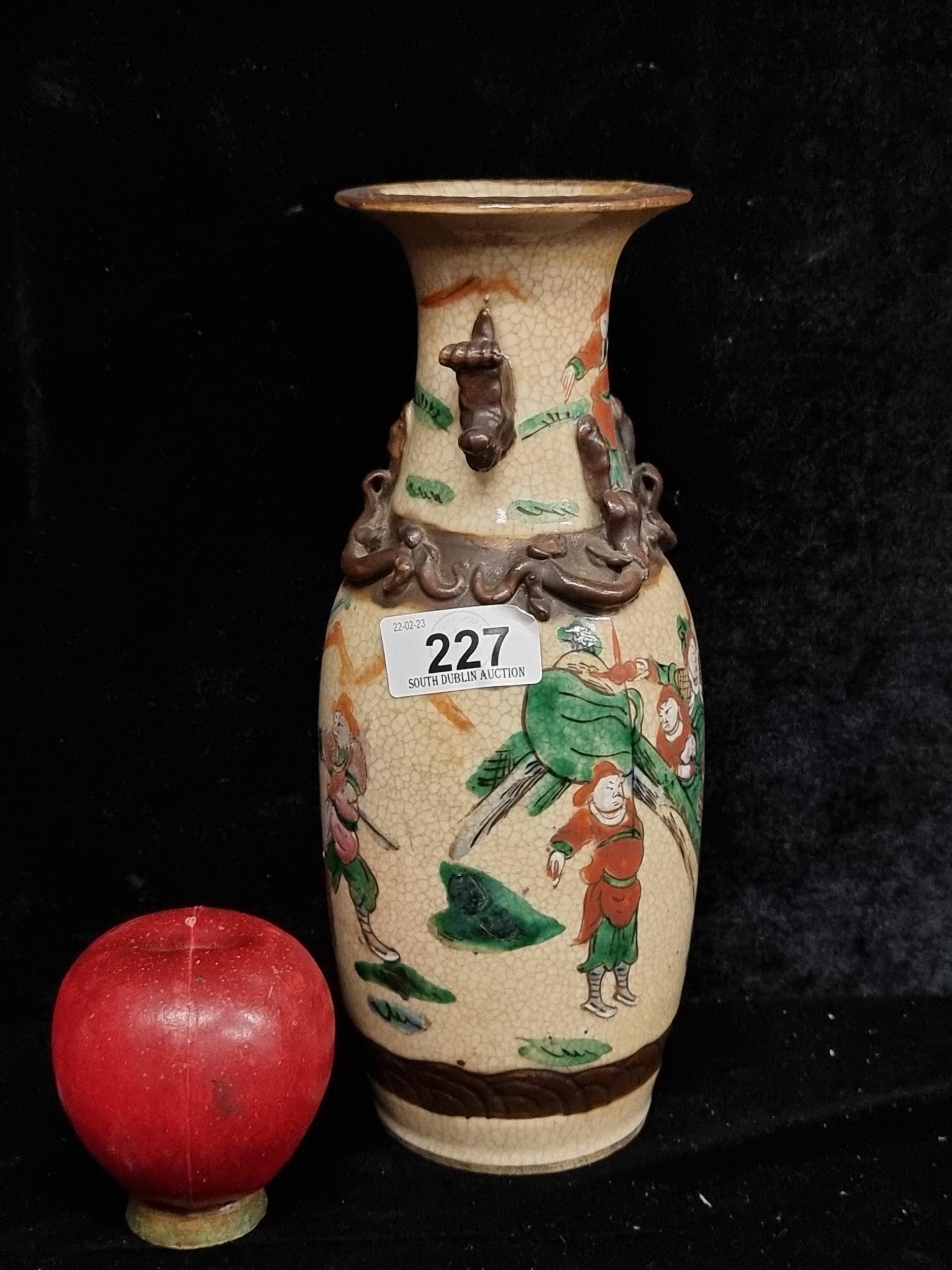 A stunning antique Nanking porcelain craquelure vase. Hand painted with warriors in traditional dress and further enhanced by bull masks to sides and raised serpent motifs. With attractive crazing throughout and stamped to base. tiny damage. Circa late 19th Century.
