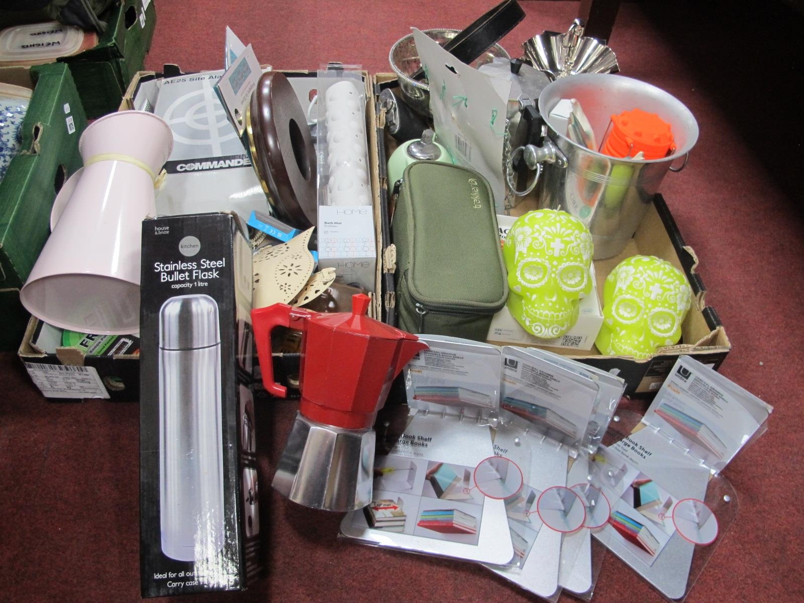 Bullet flask, Picquot sugar bowl, skull candles, invisible bookshelves, etc:- Two Boxes.