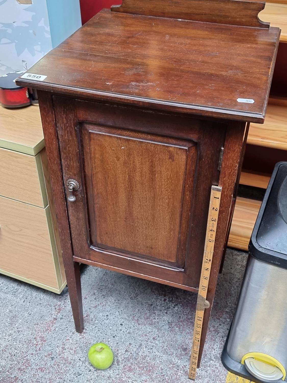A neat sized vintage pot cupboard with drop handle.