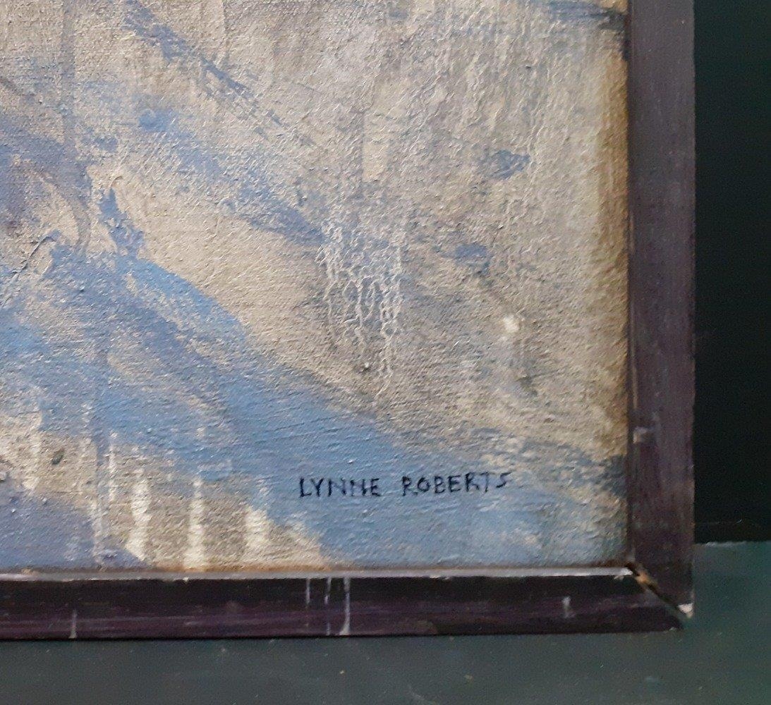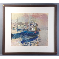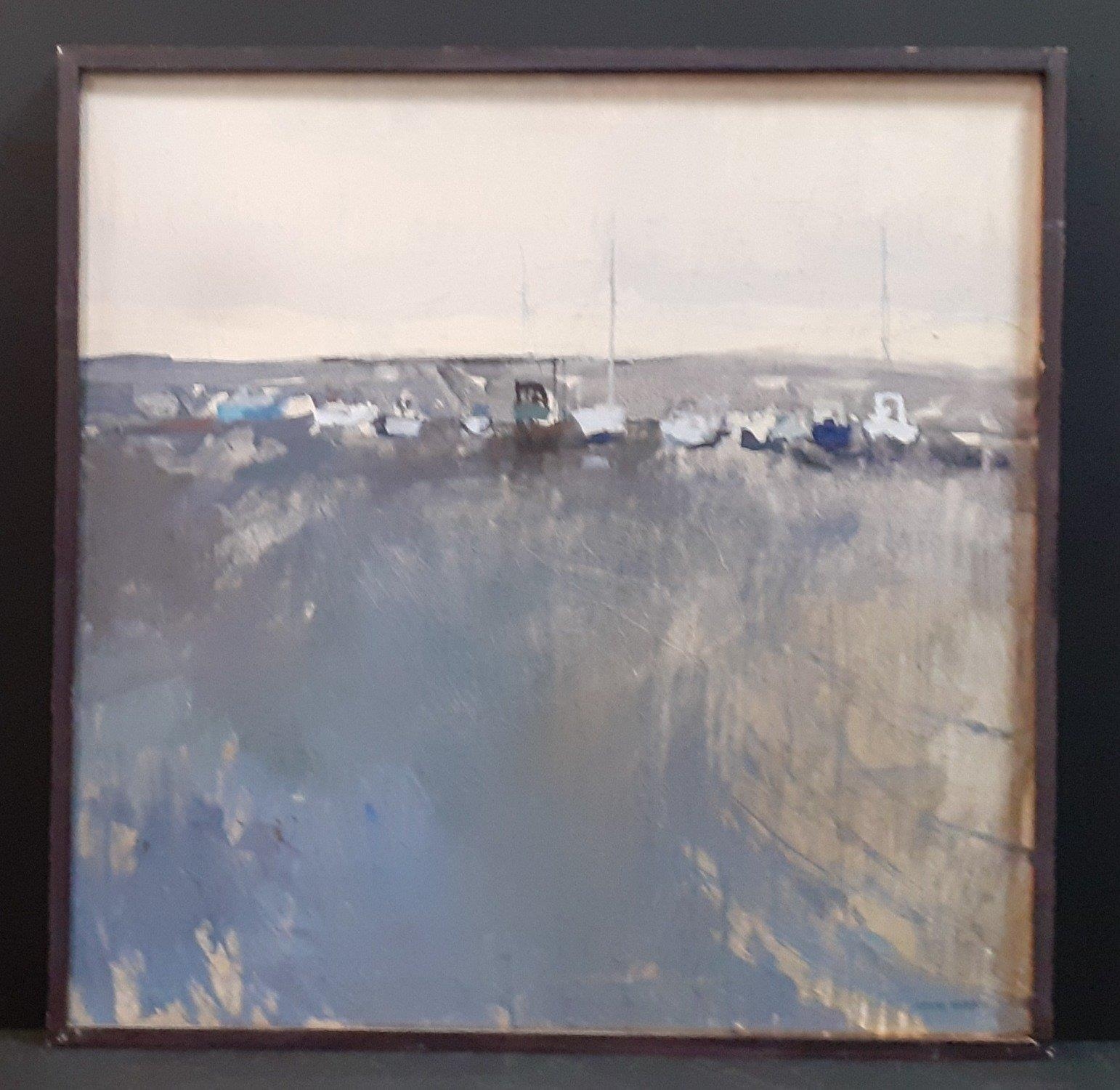 LYNN ROBERTS. Acrylic on canvas. Accomplished Highland Harbour scene. Loose in frame 74cm x 74cm approx