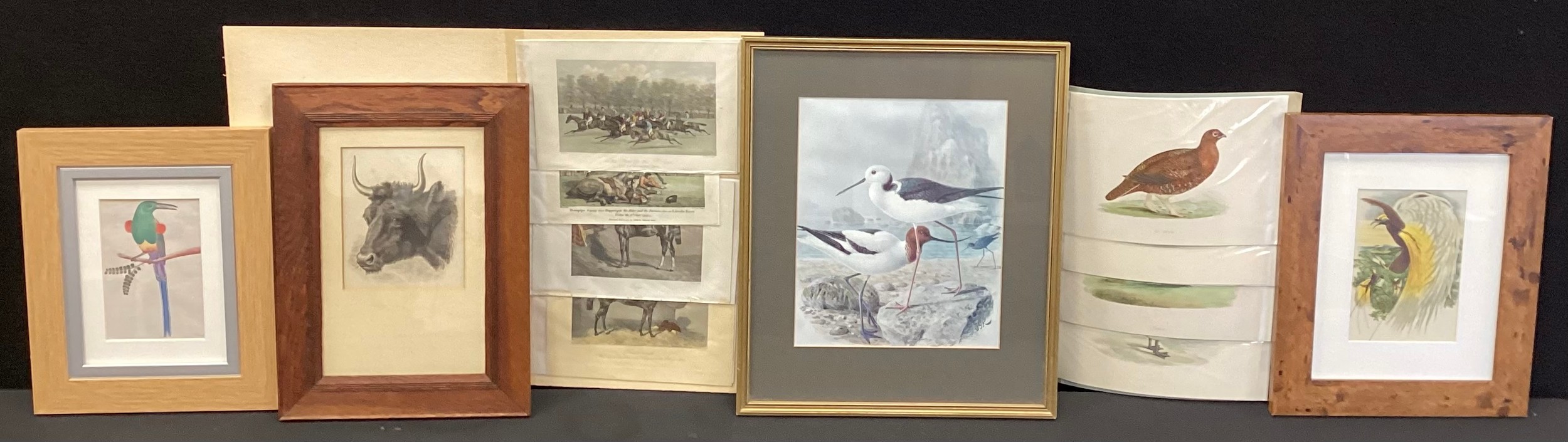 Pictures and prints - A folio of containing 18/19th century hand coloured engravings of Winners of ST.Leger/Lincoln, another folio containing British birds, c.1850; Gouache and ink fanciful bird study, another similar; etc