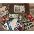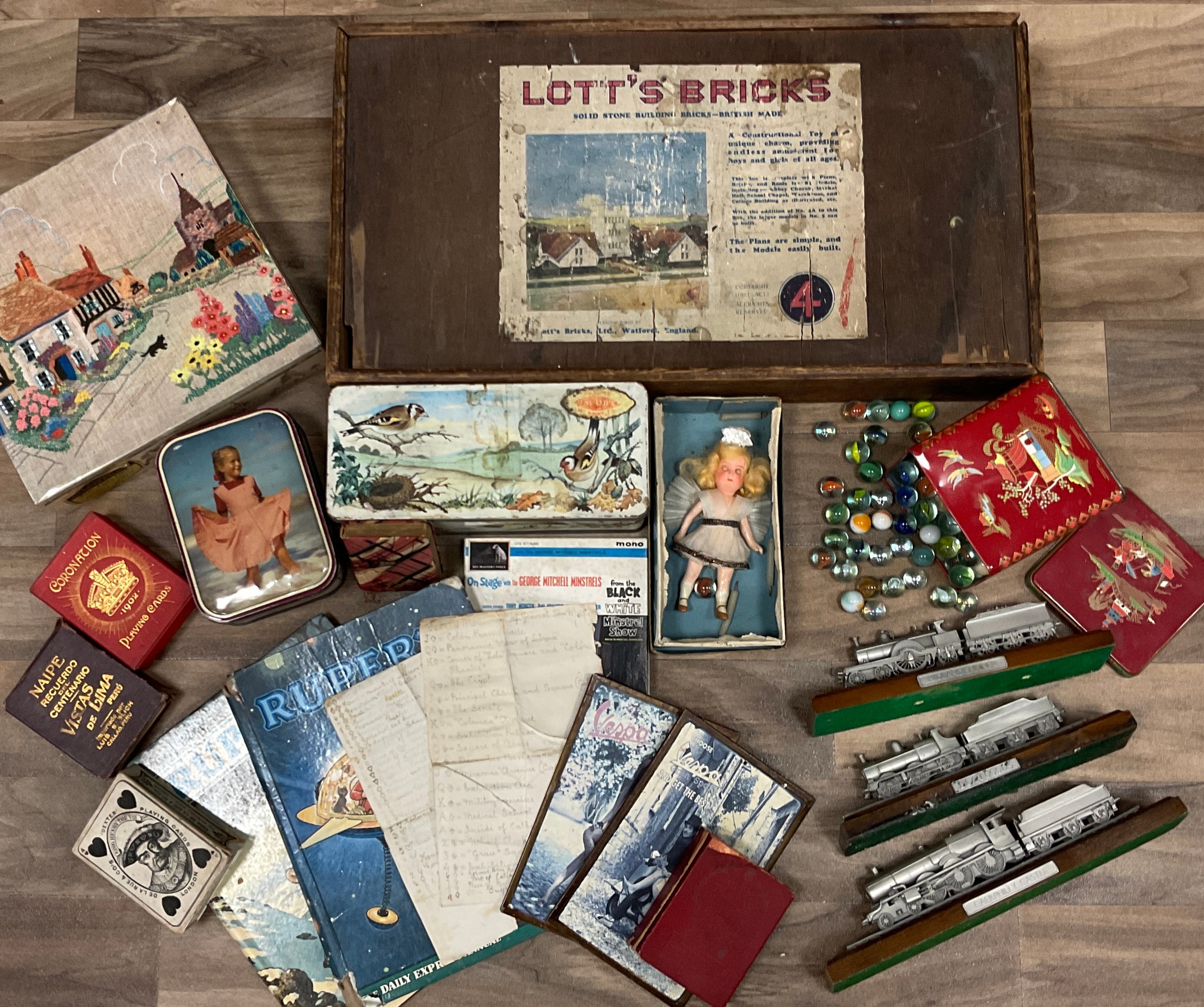 Toys and juvenilia - Lott’s Bricks with solid stone building bricks, various playing cards, Rupert annuals, tins and marbles.