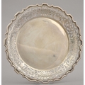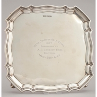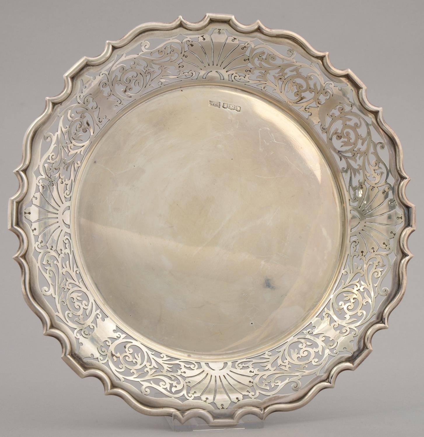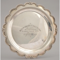 GOLFING INTEREST. A GEORGE V SILVER FRUIT DISH, WITH SAW-PIERCED PALMETTE BORDER AND SHAPED RIM, 25CM DIAM, BY WALKER & HALL LTD., SHEFFIELD 1923, 11OZS 9DWTS