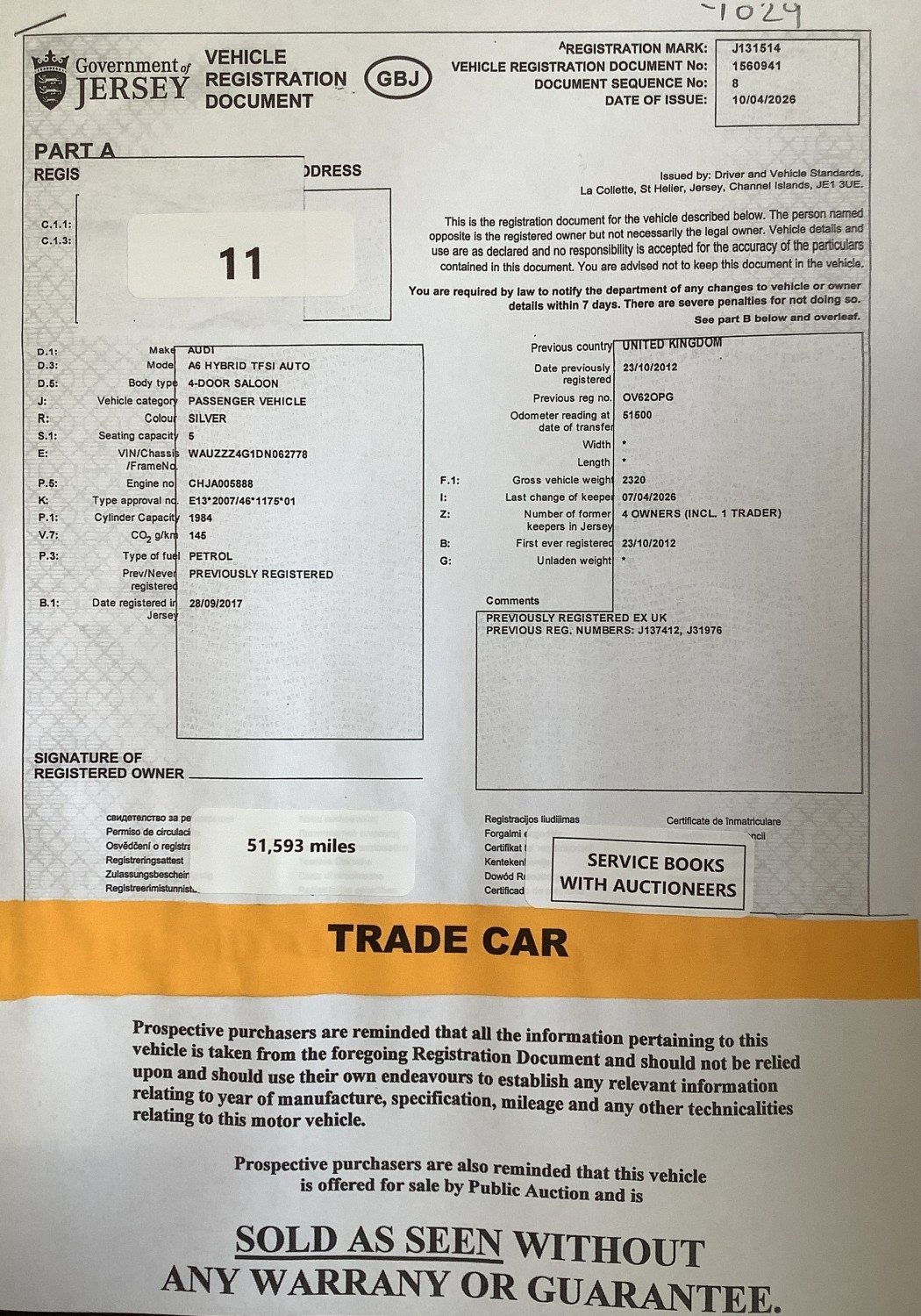 A 2012 Audi A6 Hybrid 2.0 TFSi four door saloon J131514 (hybrid petrol/automatic), odometer reading 51,593 miles - Trade car