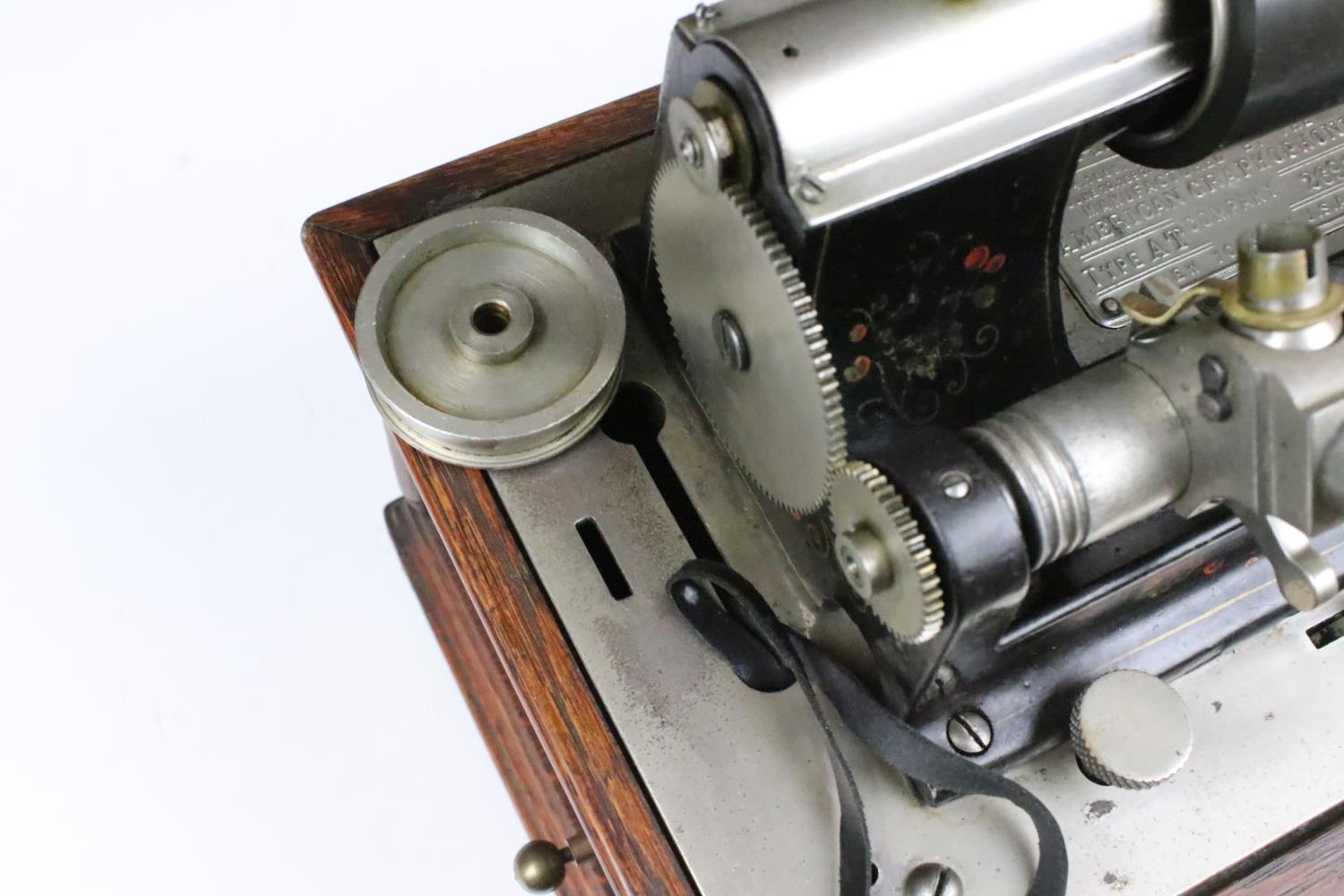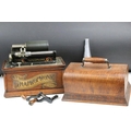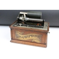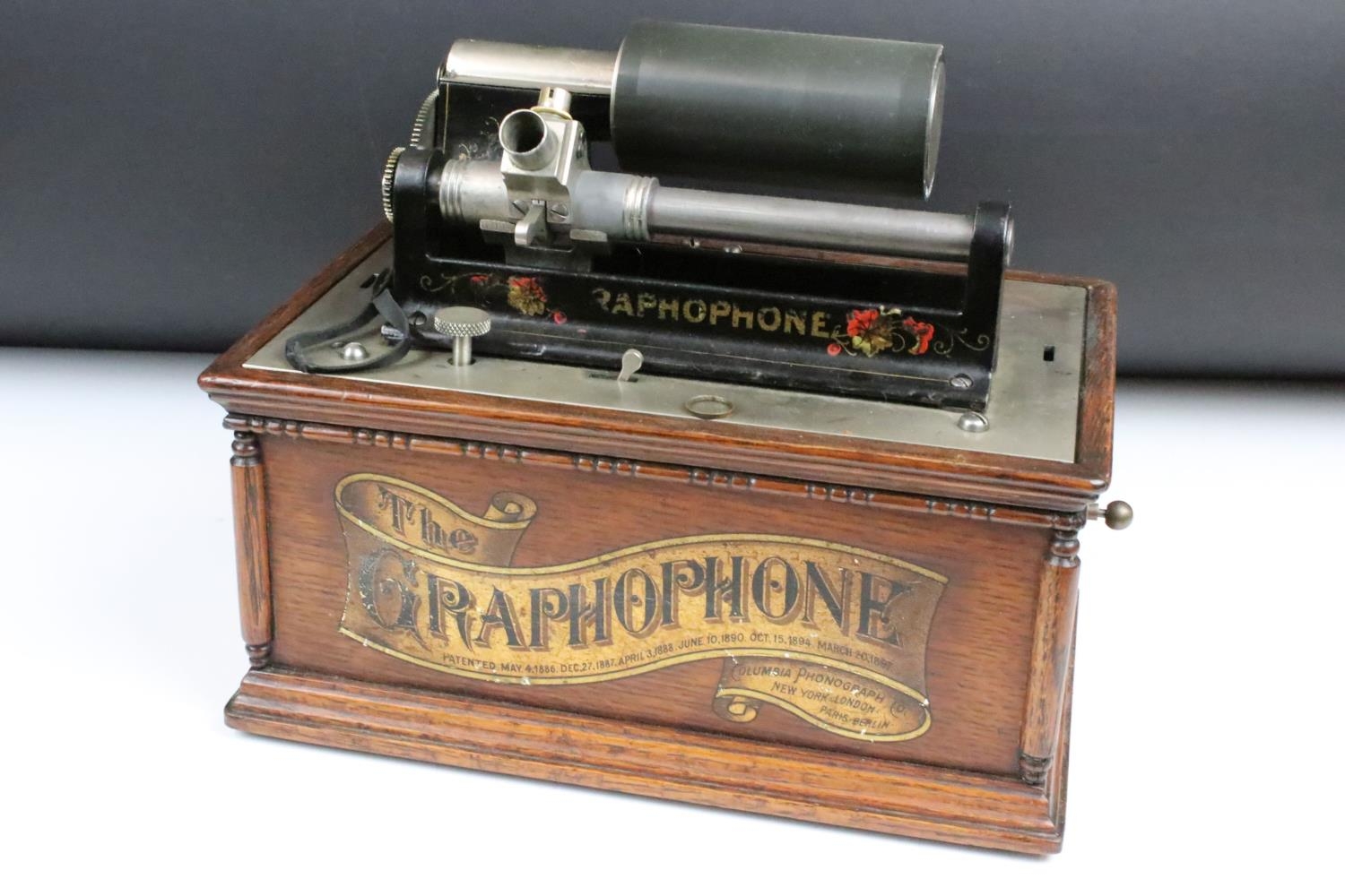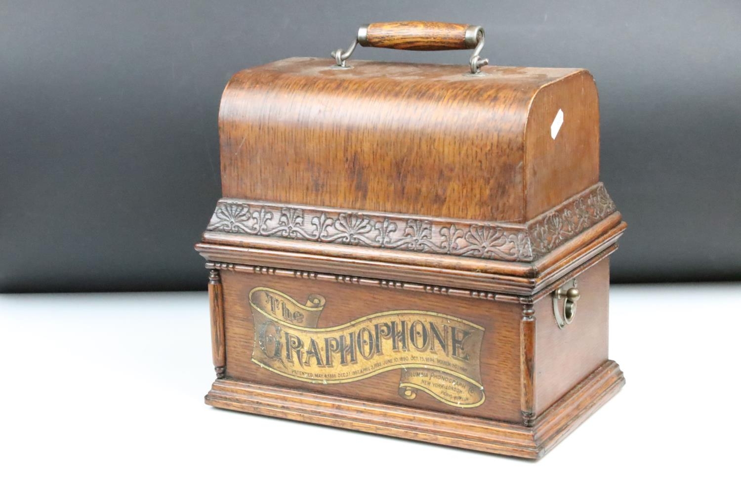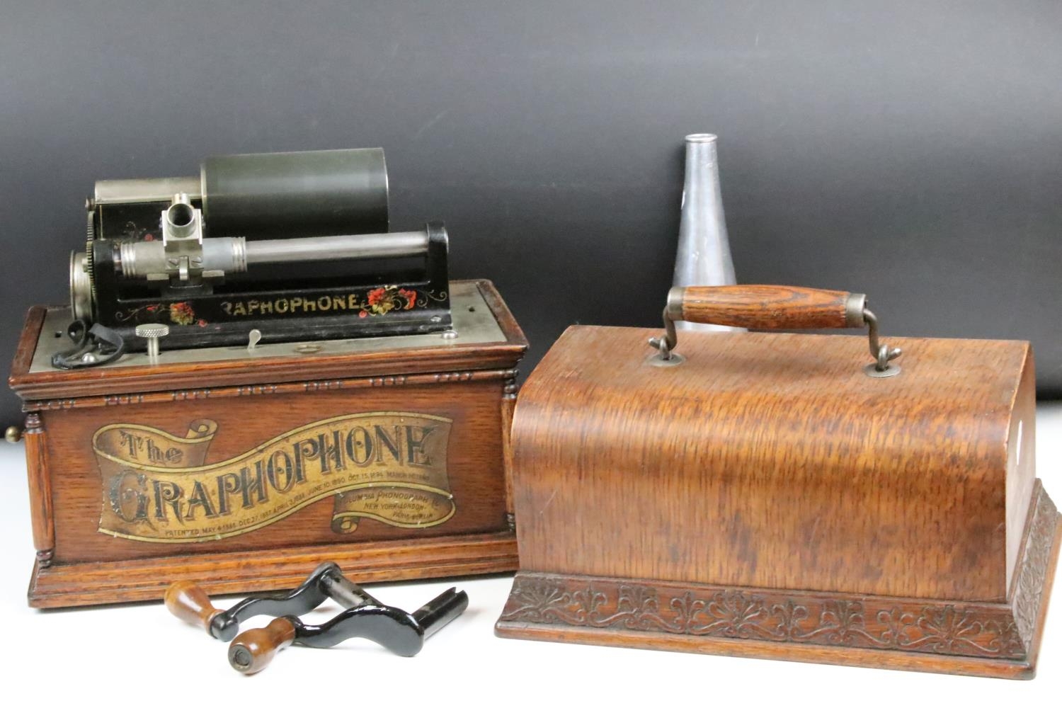 'The Graphophone' early 20th century Columbia Phonograph, Type AT, no. 269135, oak cased, with lid, metal horn, and a quantity of boxed wax cylinders (missing reproducer) (3)