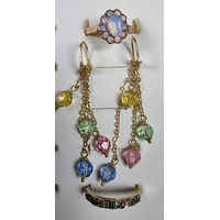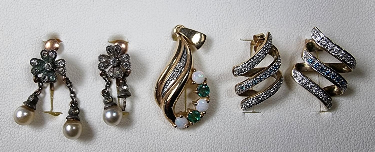 A pair of diamond swirl earrings, an opal and emerald pendant and a pair of paste earrings