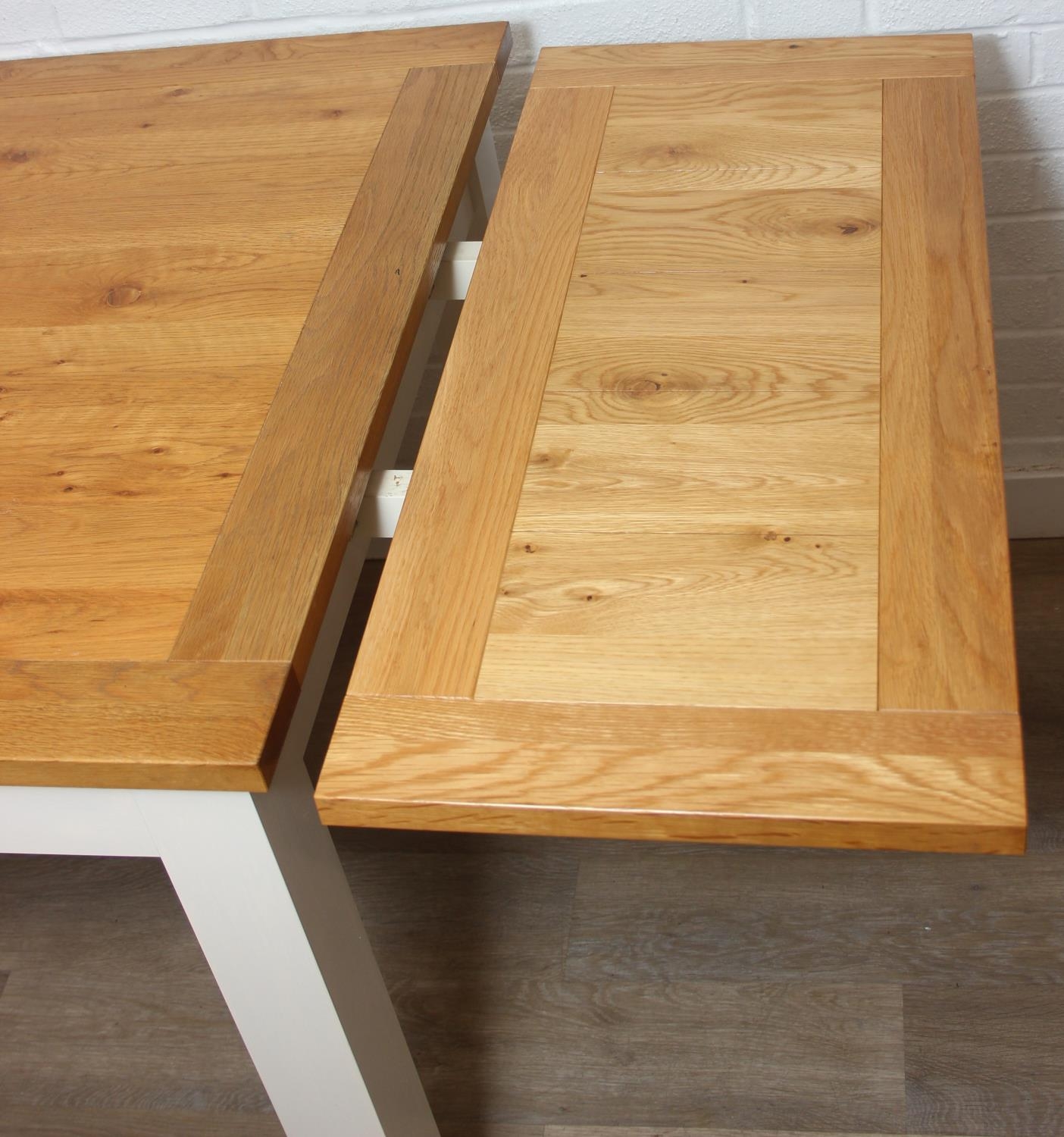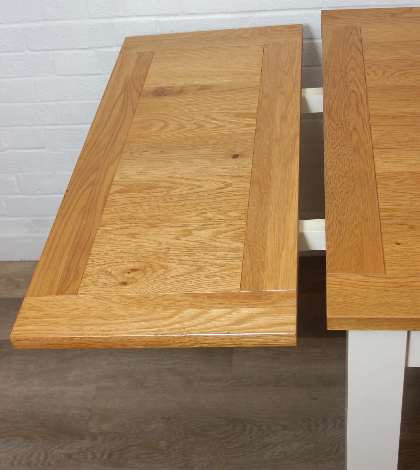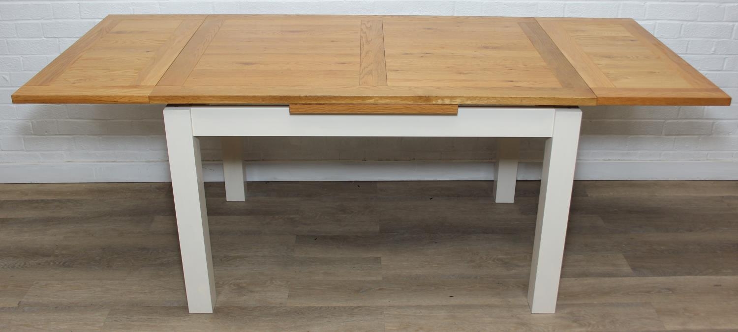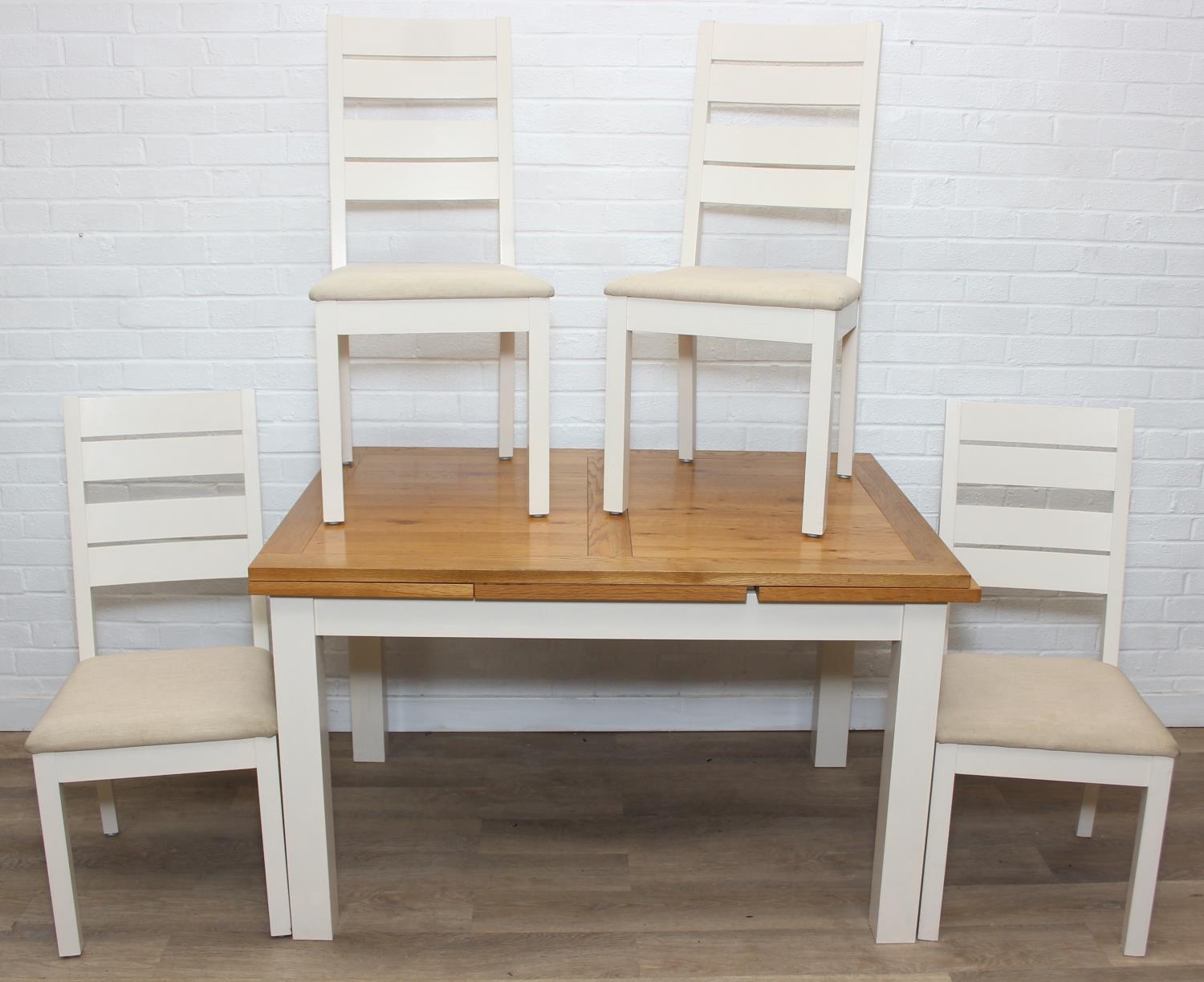 Modern white painted extending dining table with oak top and four matching chairs, the table 68cm x 90cm x 78cm extending to 68cm x 170cm x 78cm [5]