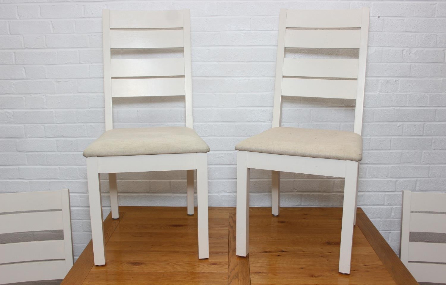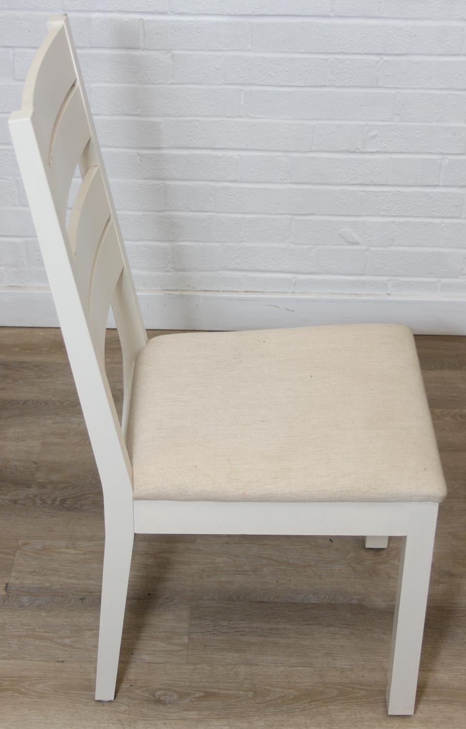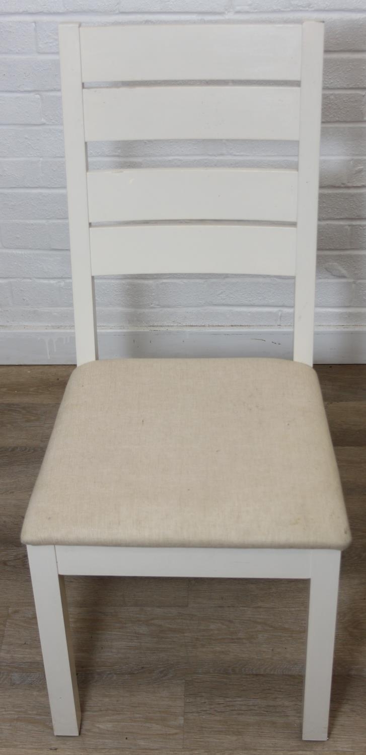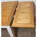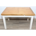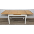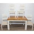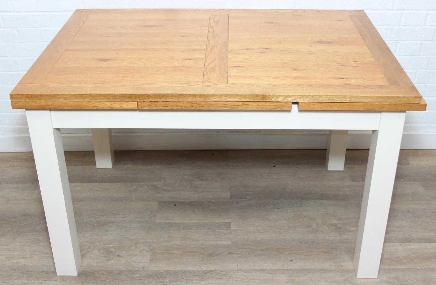 Modern white painted extending dining table with oak top and four matching chairs, the table 68cm x 90cm x 78cm extending to 68cm x 170cm x 78cm [5]