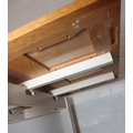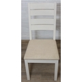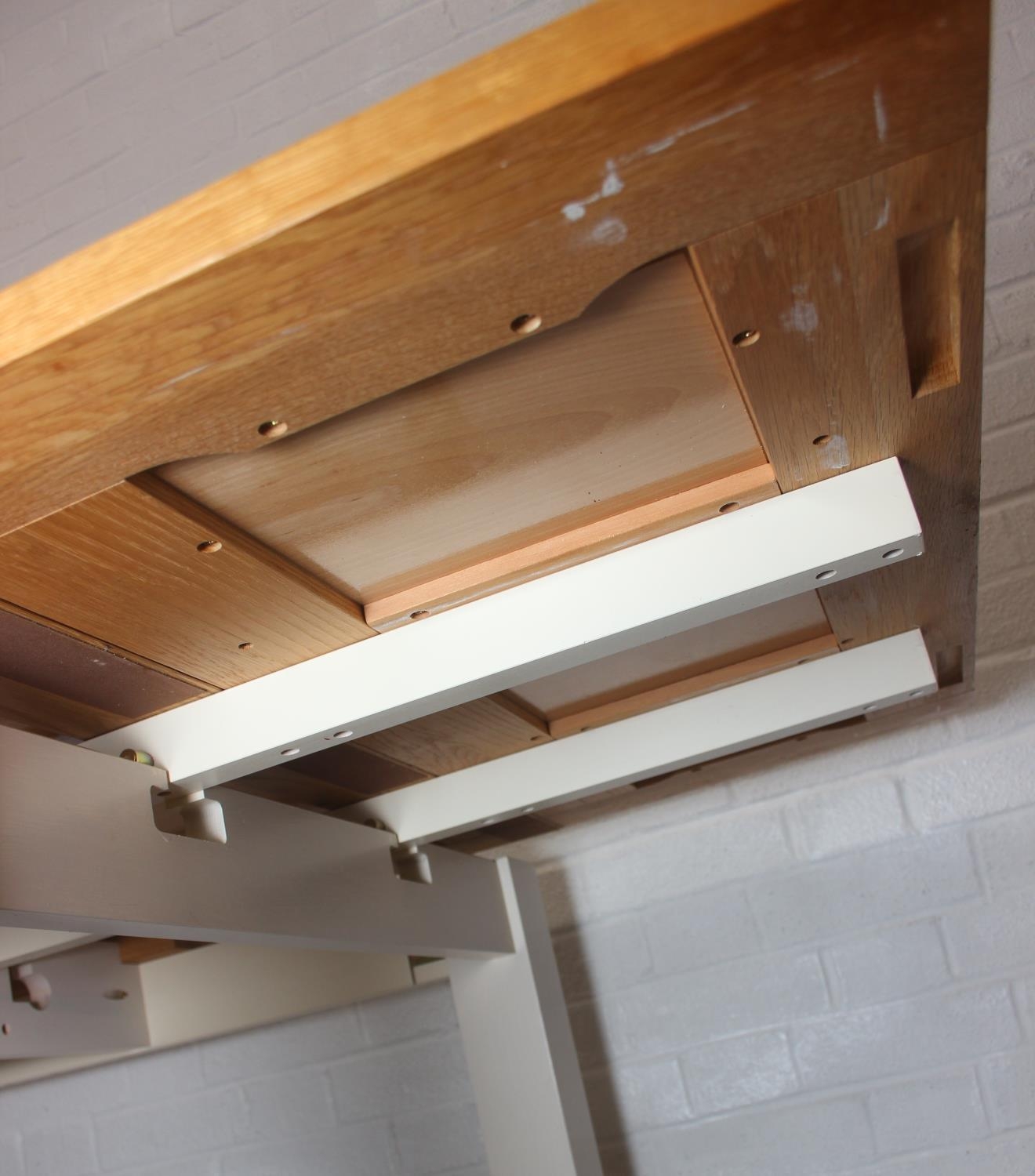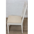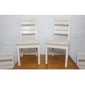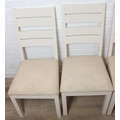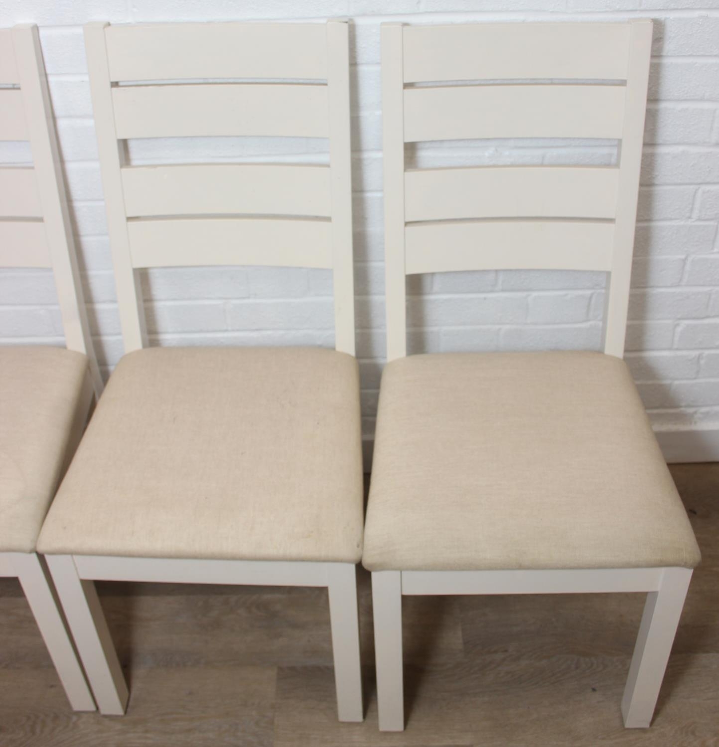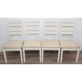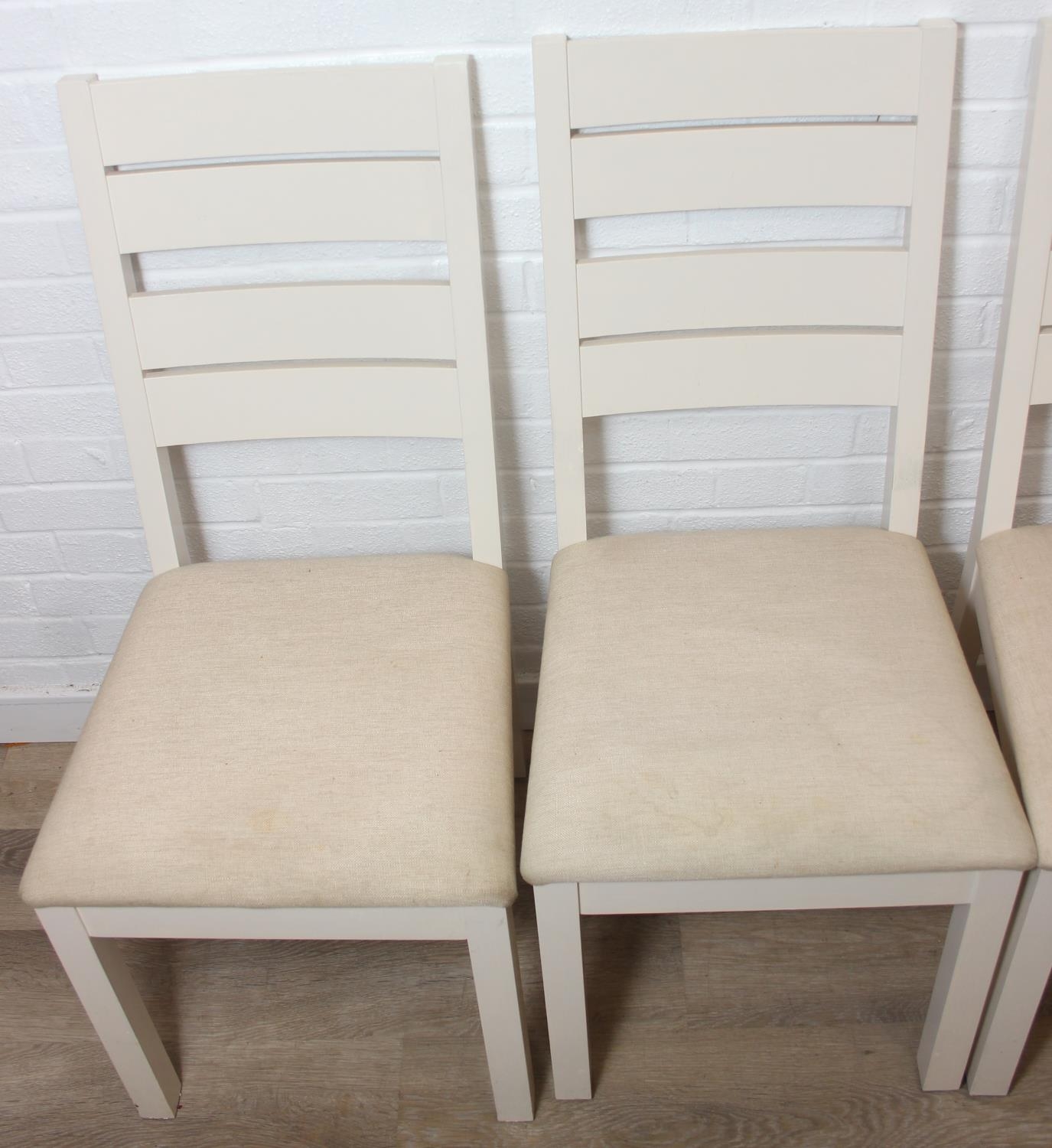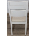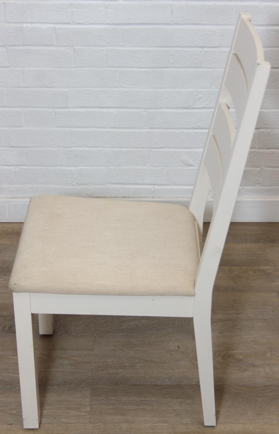 Modern white painted extending dining table with oak top and four matching chairs, the table 68cm x 90cm x 78cm extending to 68cm x 170cm x 78cm [5]