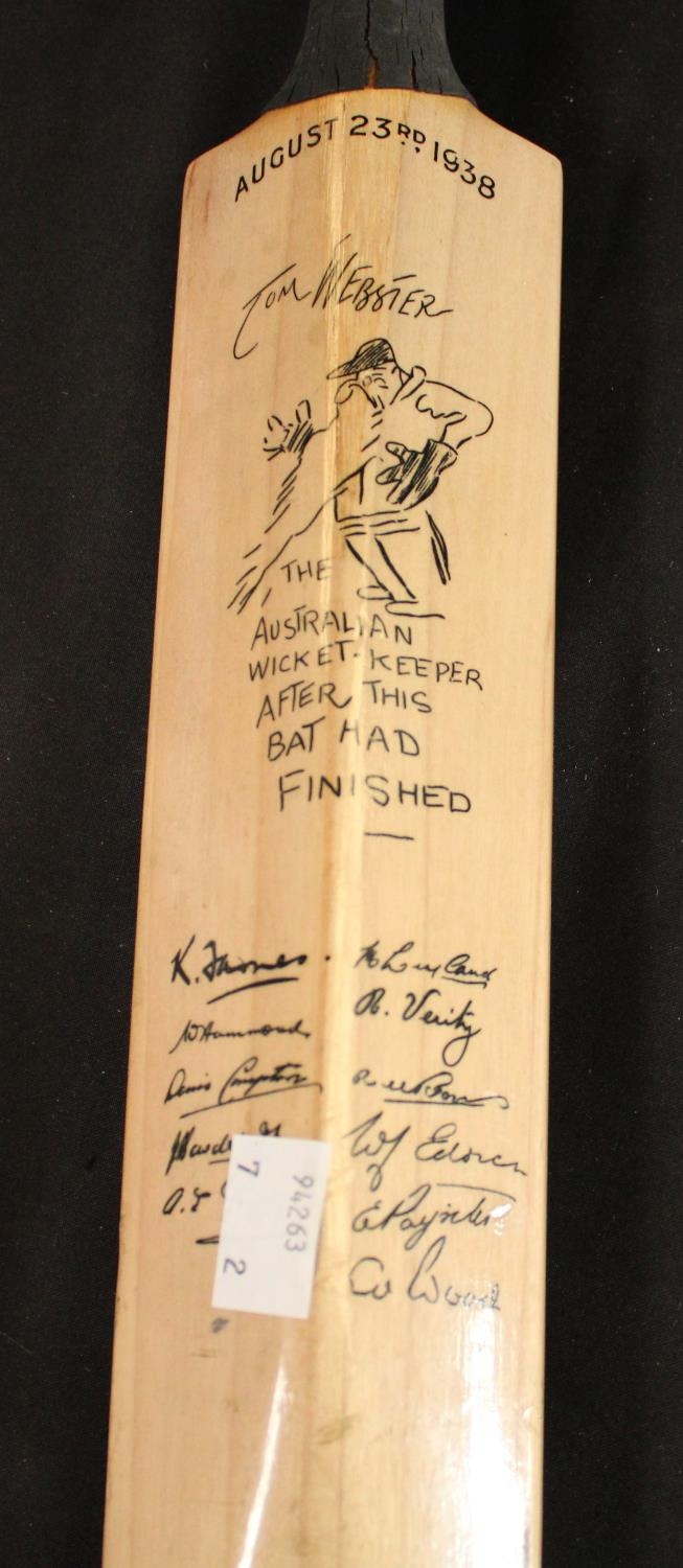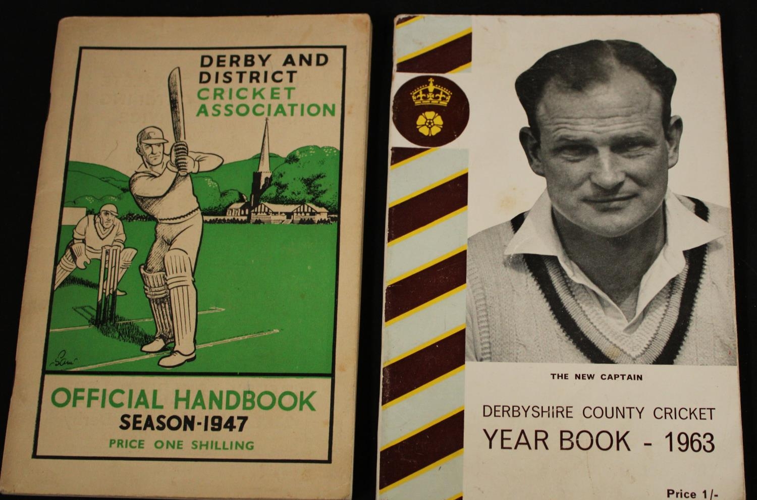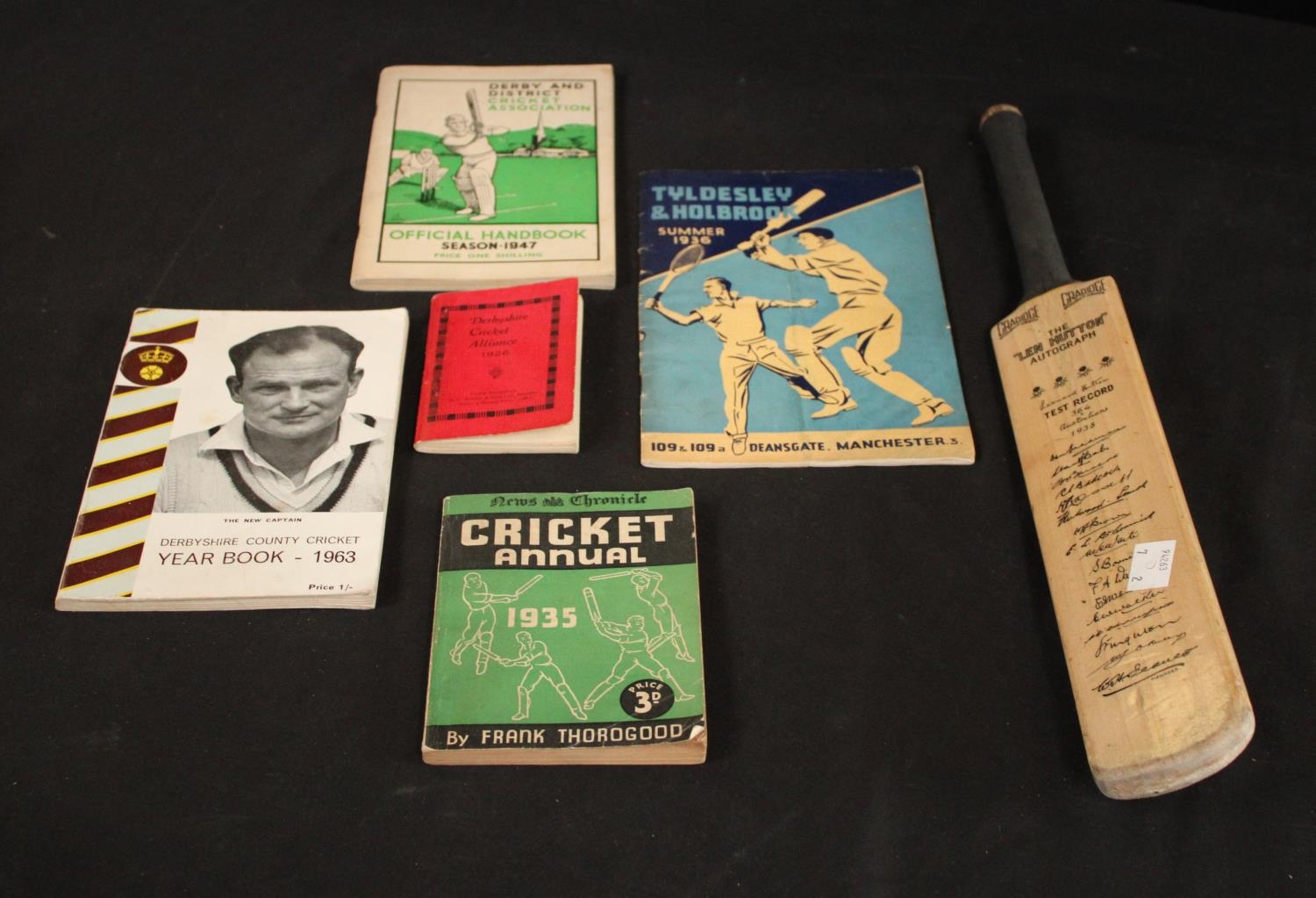 Cricket Interest - a Len Hutton Autograph miniature bat, Test Record 1938, facsimile signatures; a Derbyshire Cricket Alliance 1926 handbook; a Derby and District Cricket Association Official Handbook 1947; a News Chronicle Cricket Annual 1935 etc