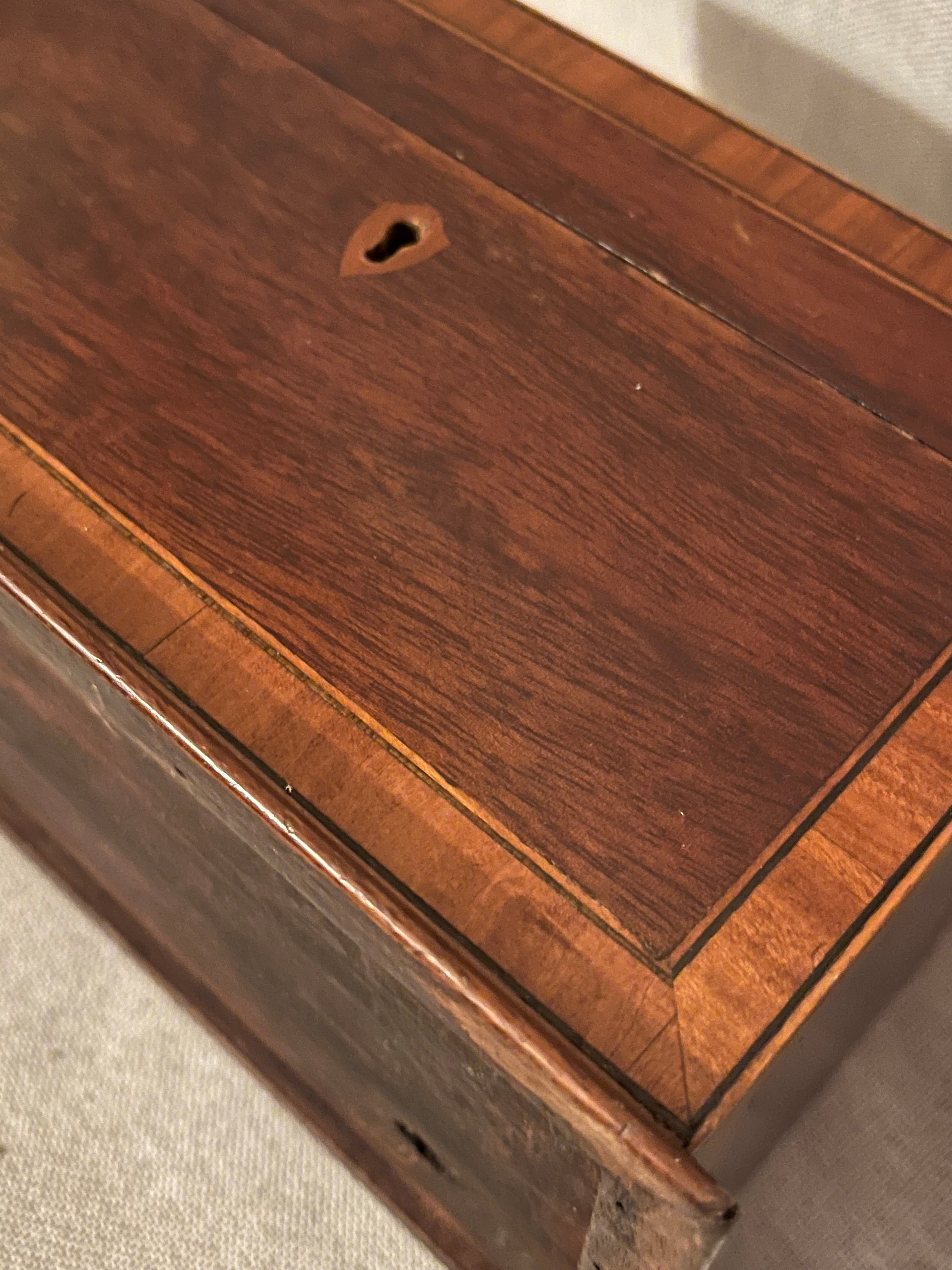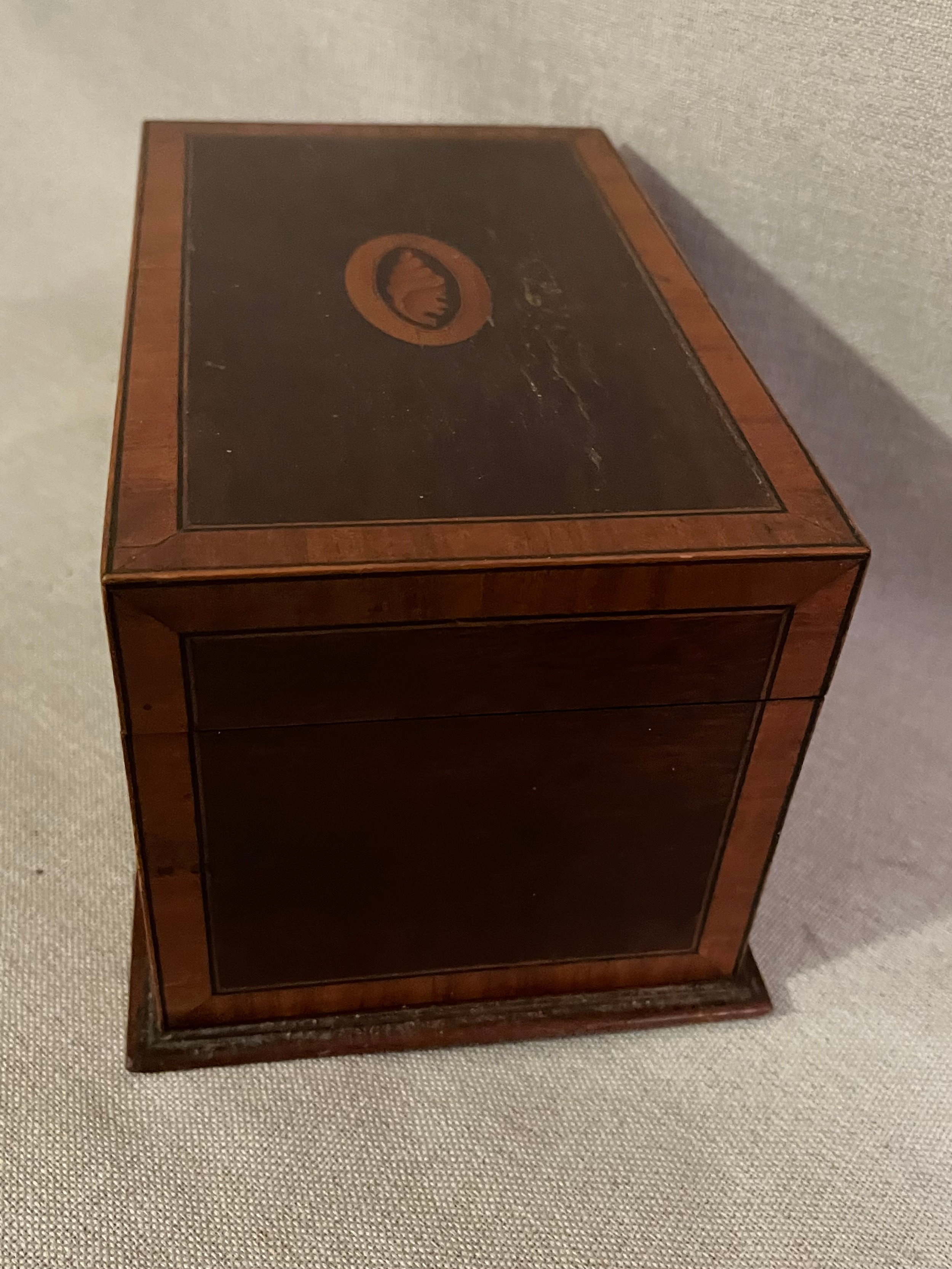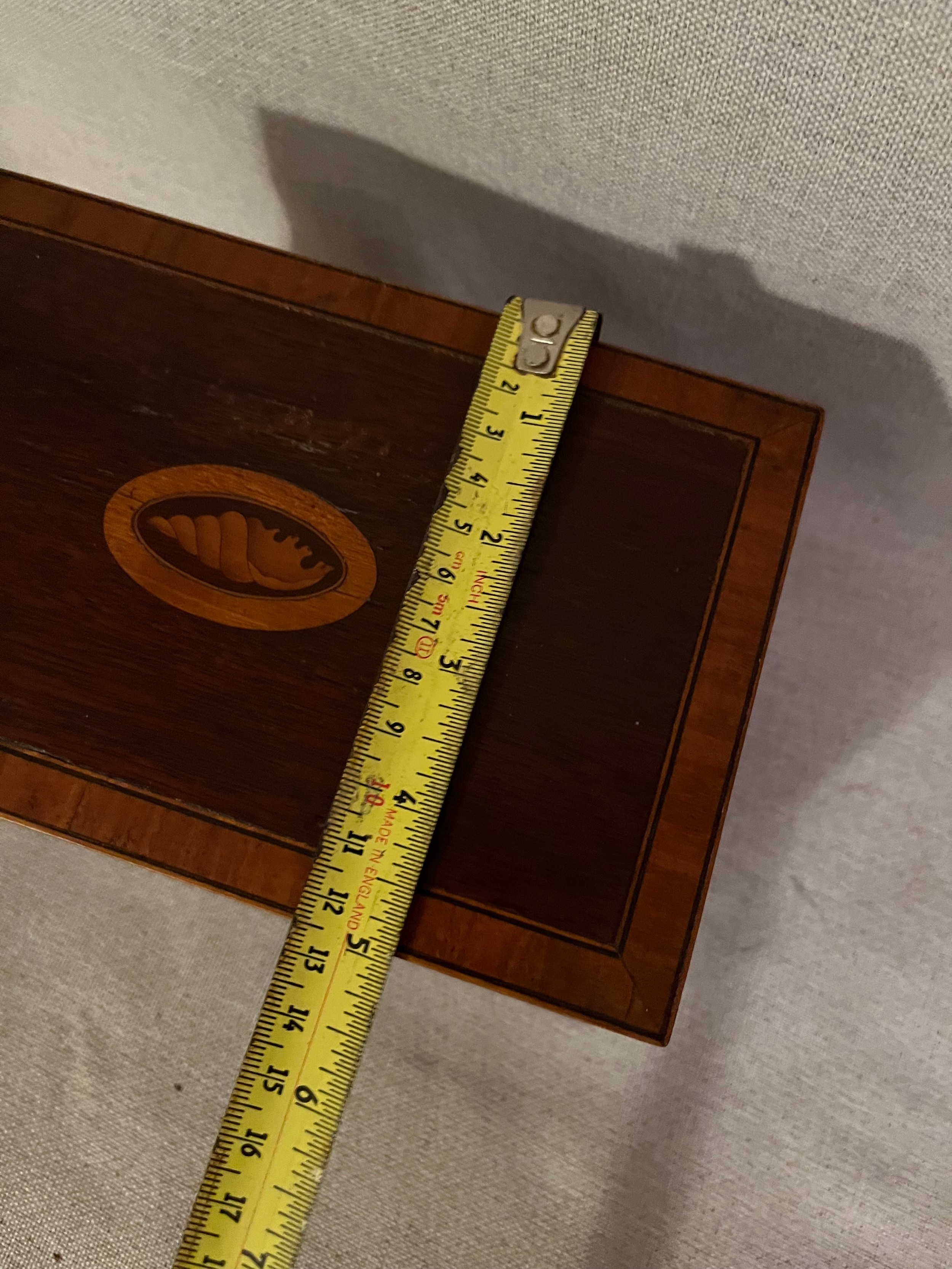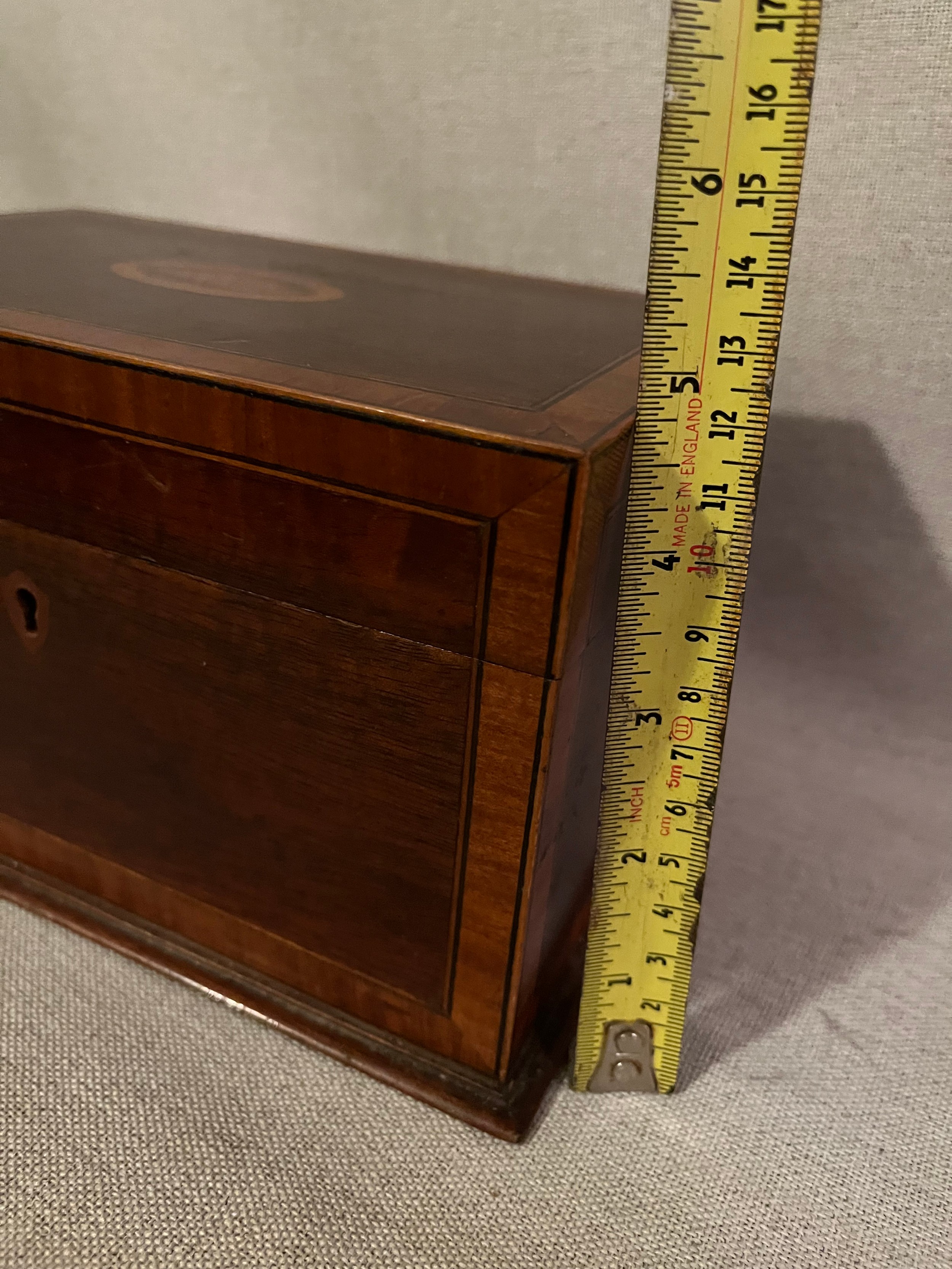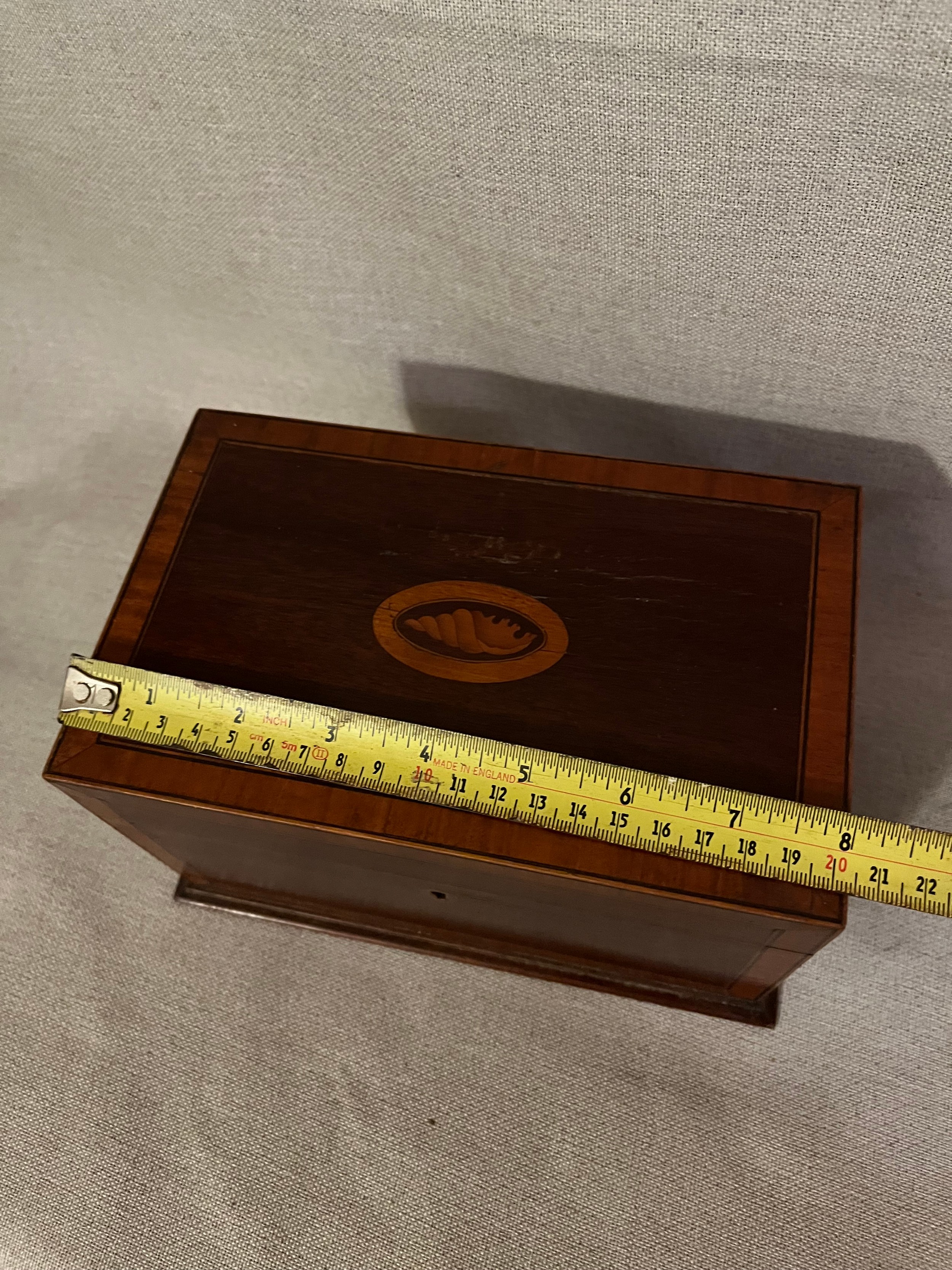 A Sheraton style Mahogany shell motif inlaid George III wooden box. No key