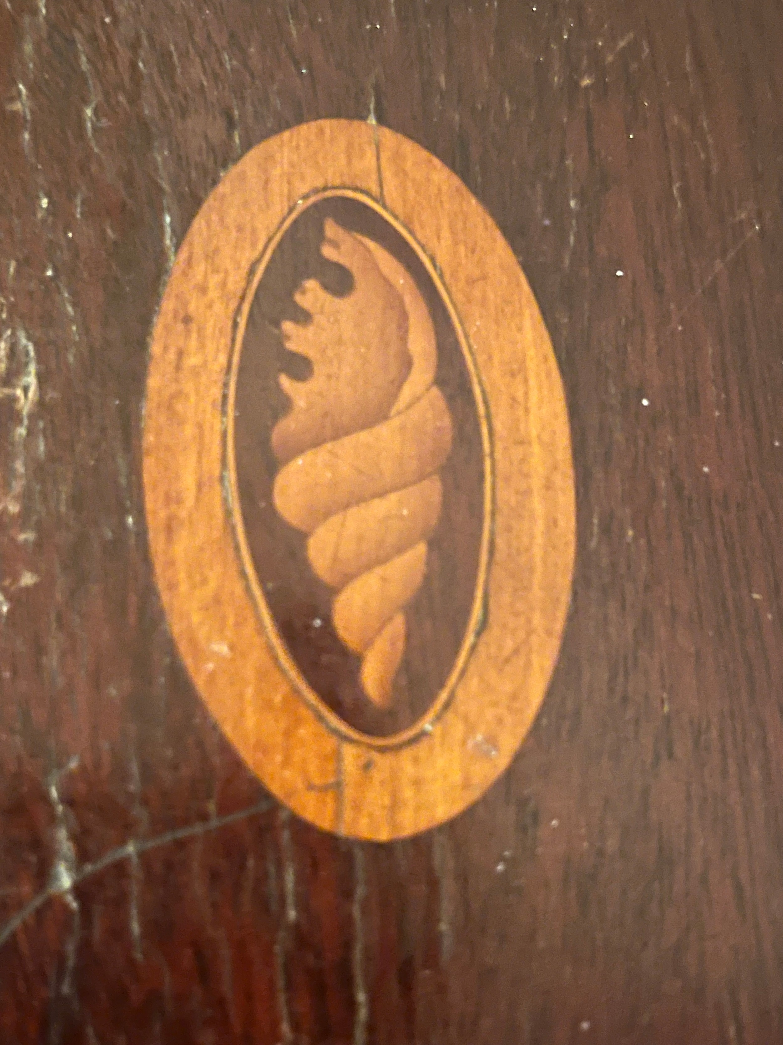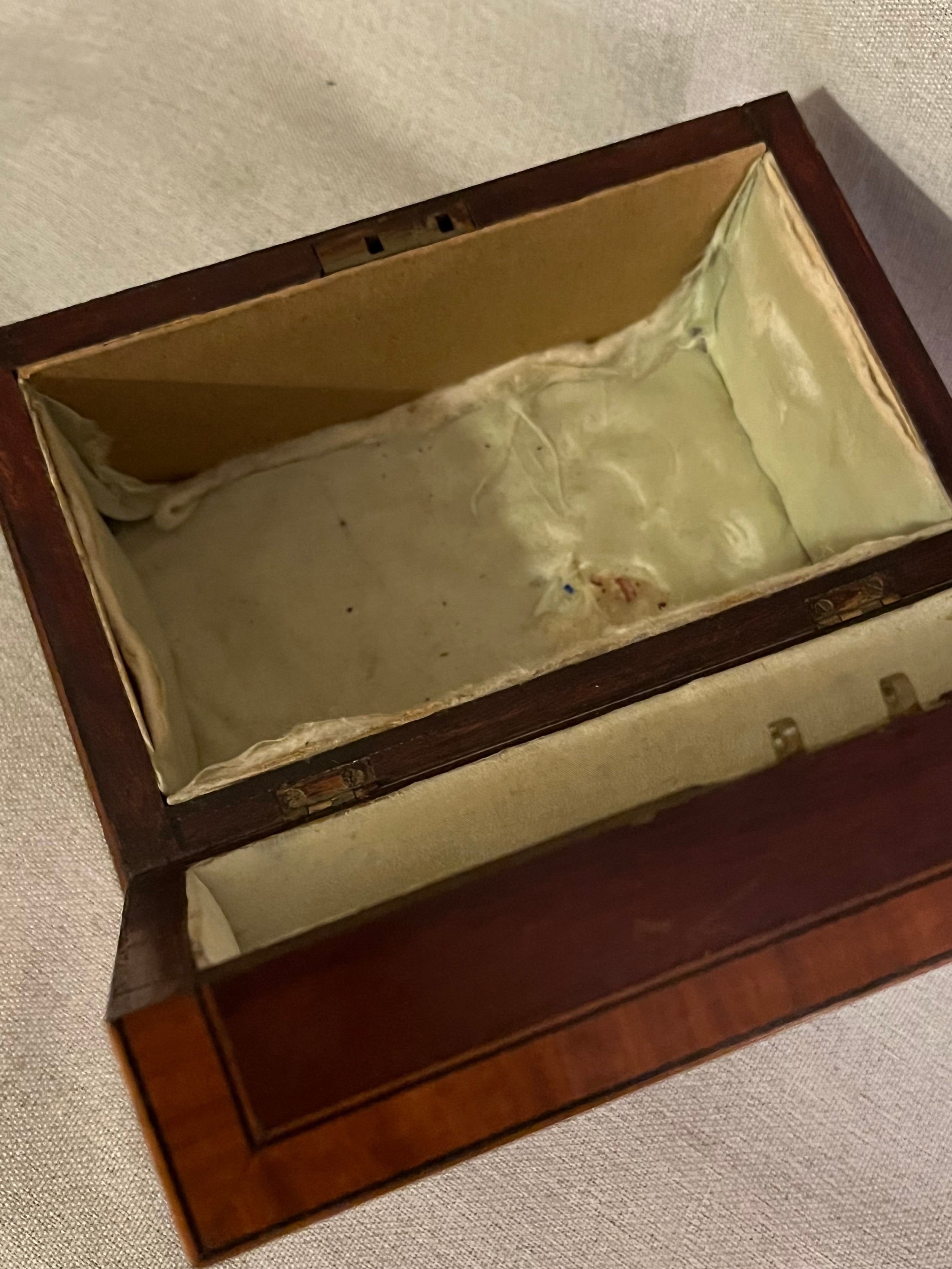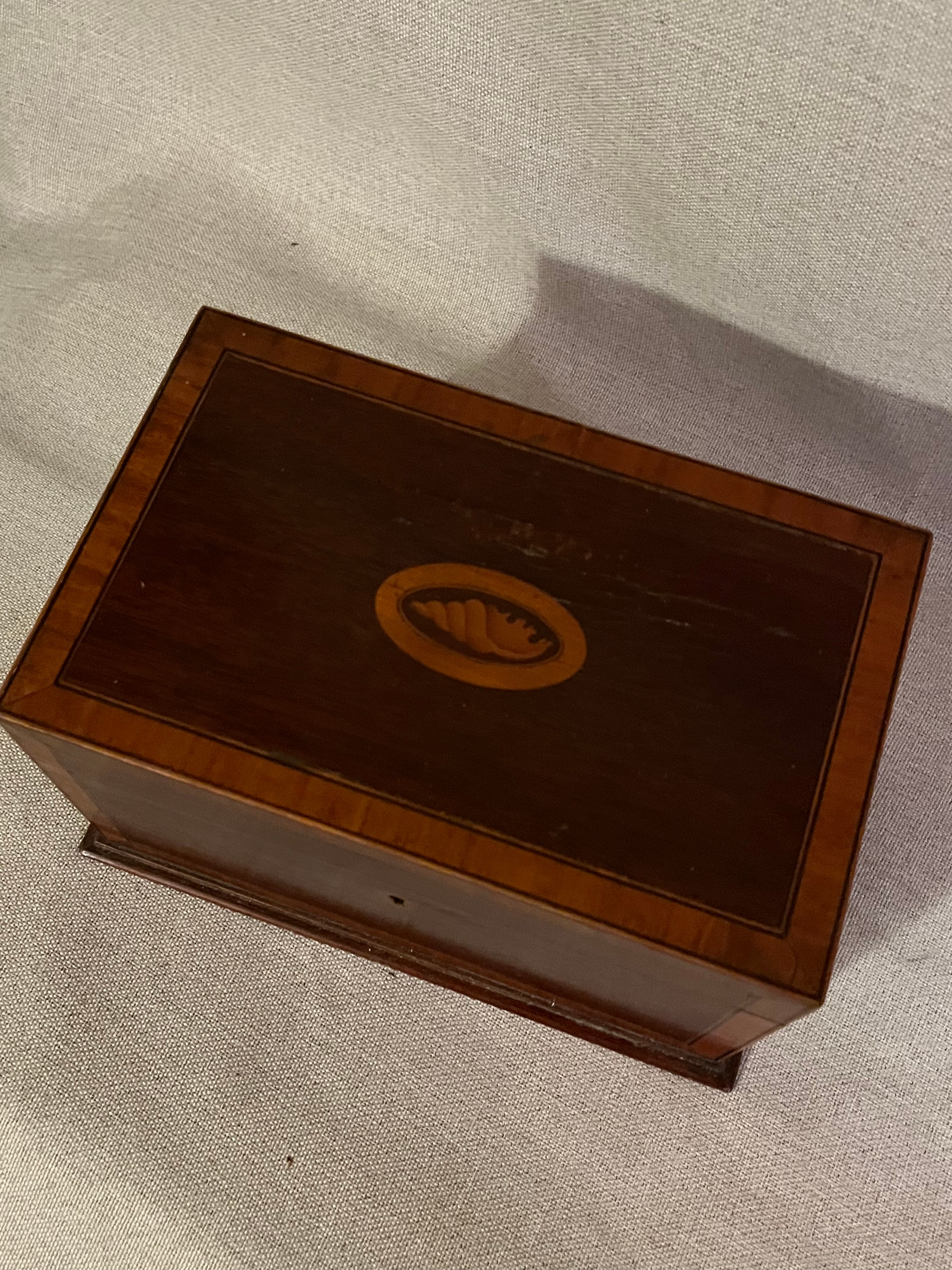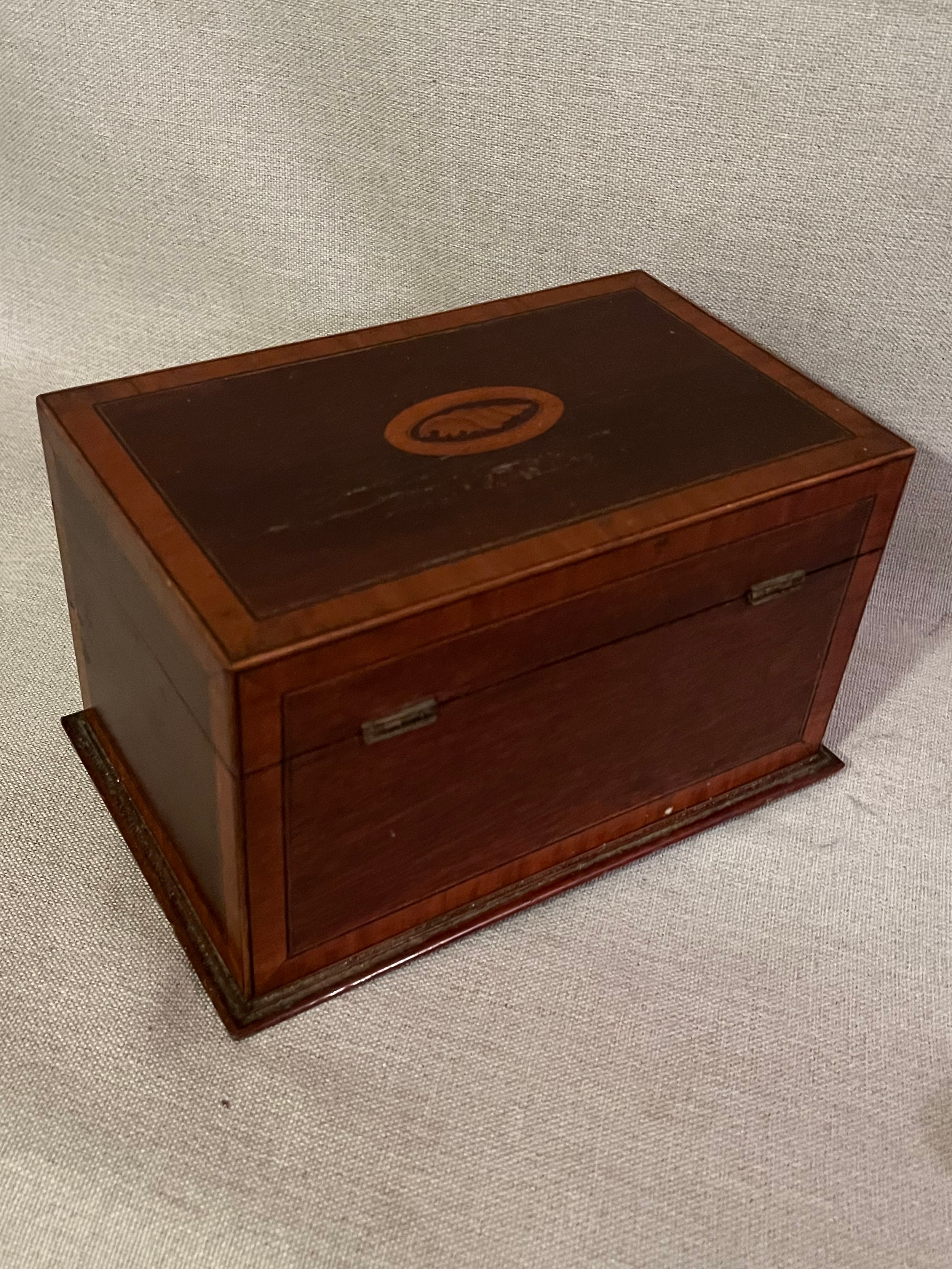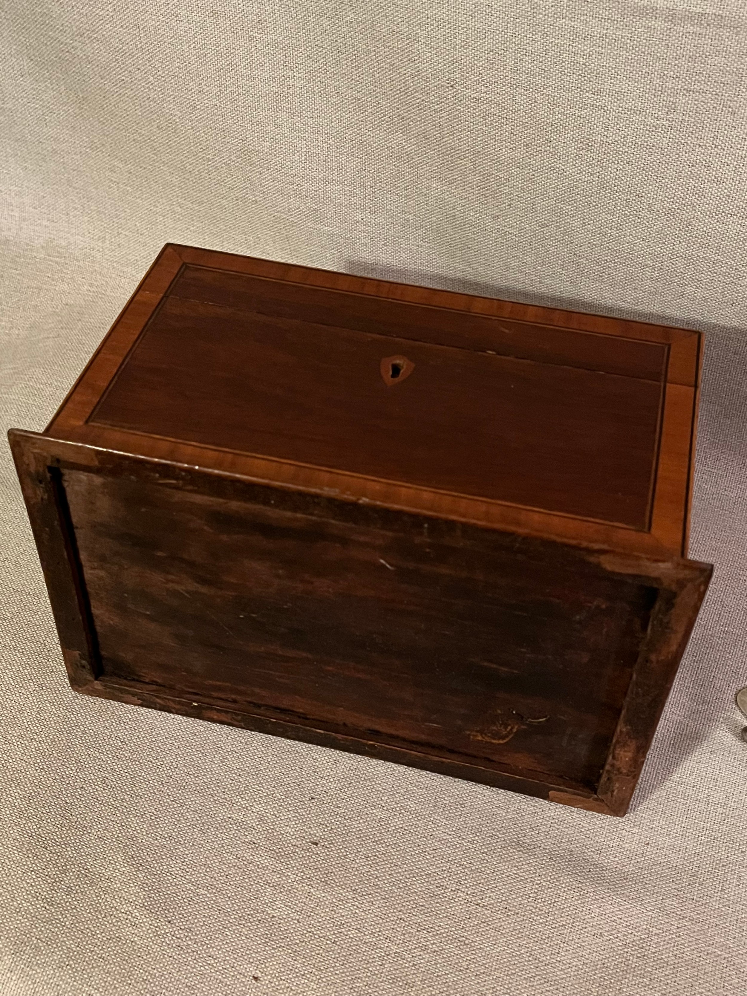 A Sheraton style Mahogany shell motif inlaid George III wooden box. No key