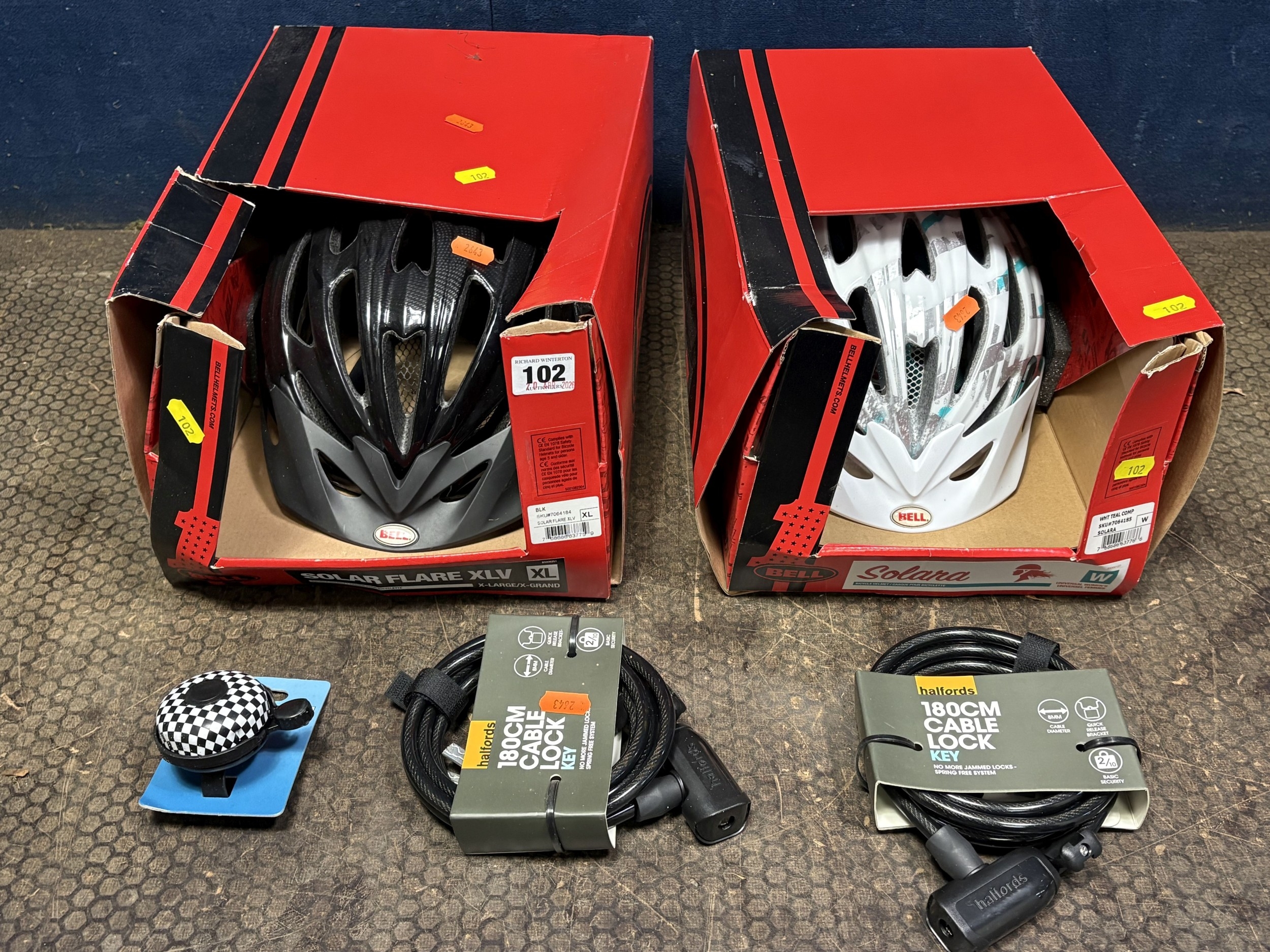 TWO BOXED BELL BICYCLE HELMETS, one men's size XL, and a universal women's, two brand new cable locks and a bell (5)
