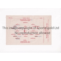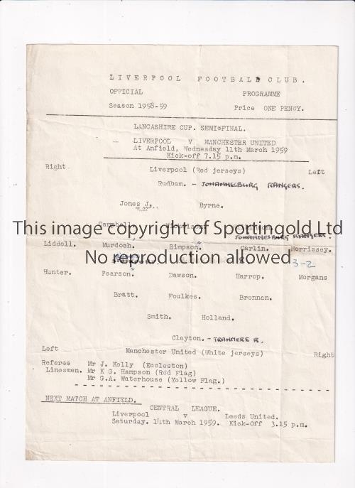 MANCHESTER UNITED Single sheet programme for the away Lancashire Senior Cup Semi-Final v Liverpool 11/3/1959, slightly creased, team changes and scores entered. Generally good