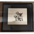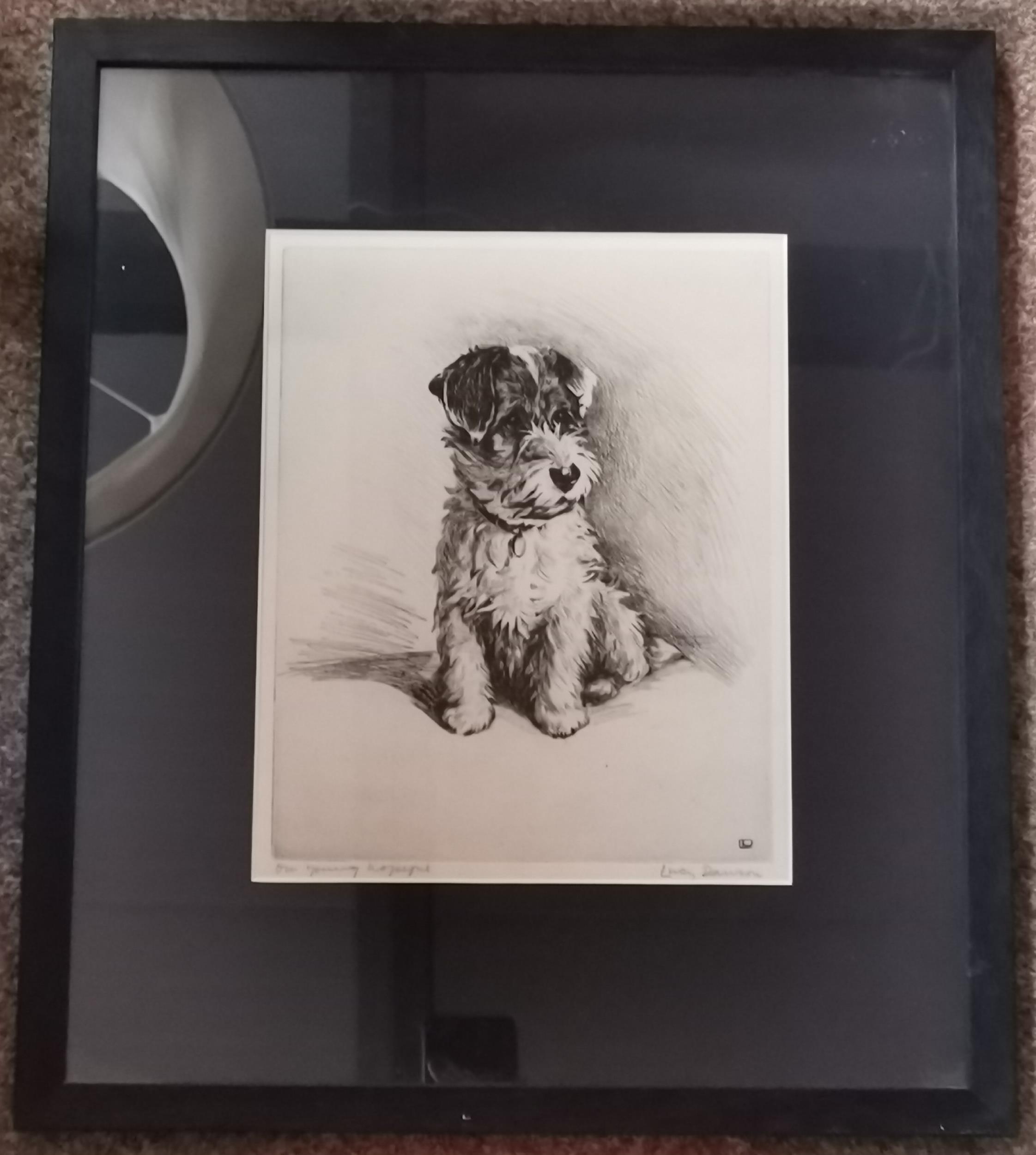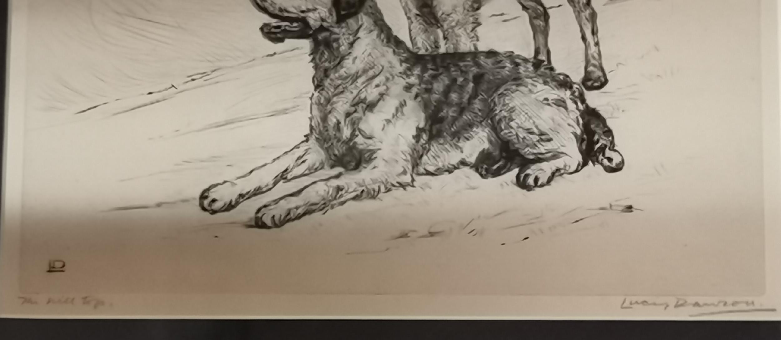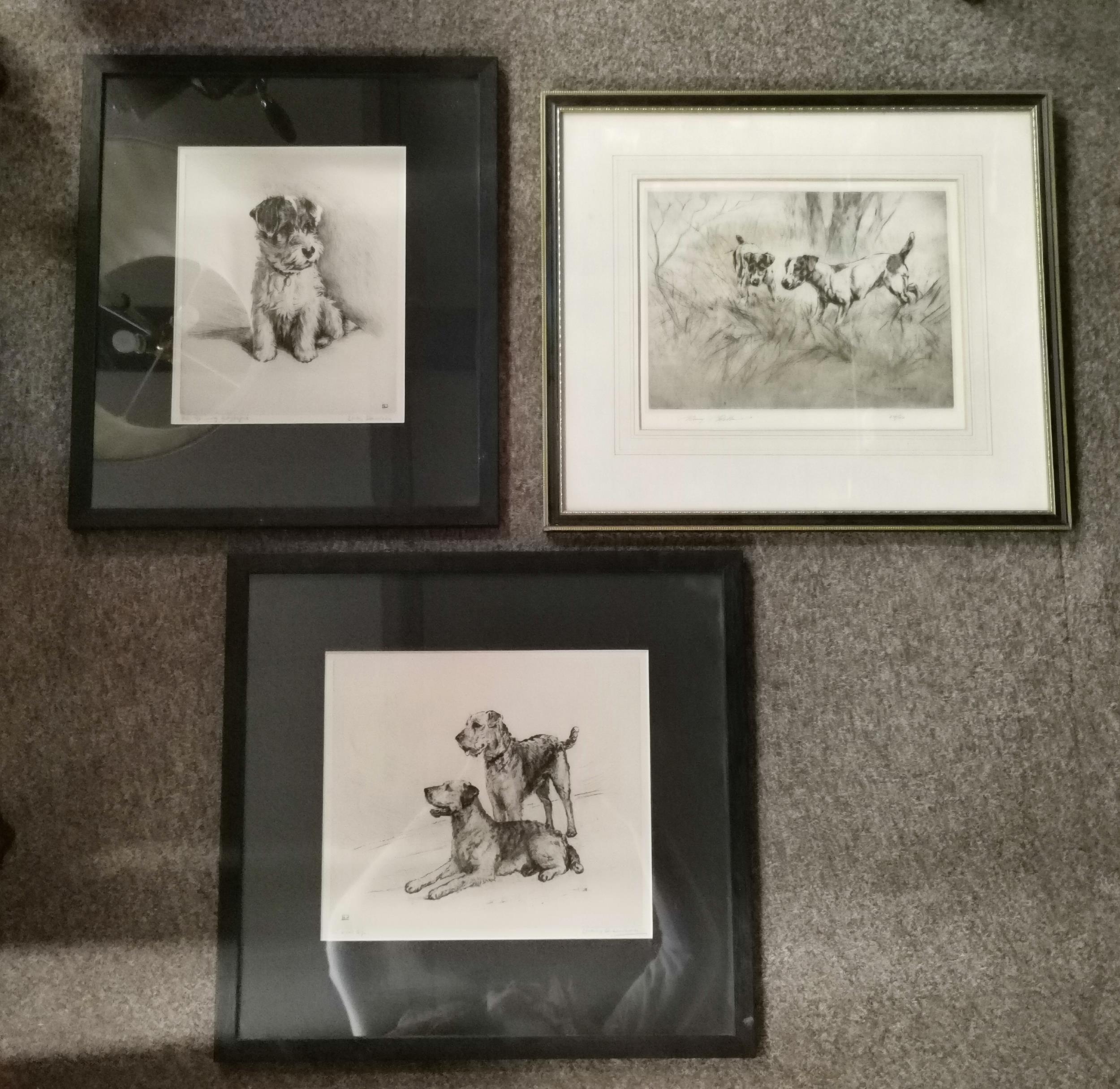 Henry Wilkinson (1921-2011), A pair of Jack Russell terriers, limited edition hand coloured etching, signed and numbered 67/150 in pencil to margin, framed; together with Lucy Dawson (1875-1954), 'The Hill Top' and 'Our Young Hopeful', two dog drypoint etchings, both titled and signed in pencil to margin, framed. (3) First 21cm by 28.5cm