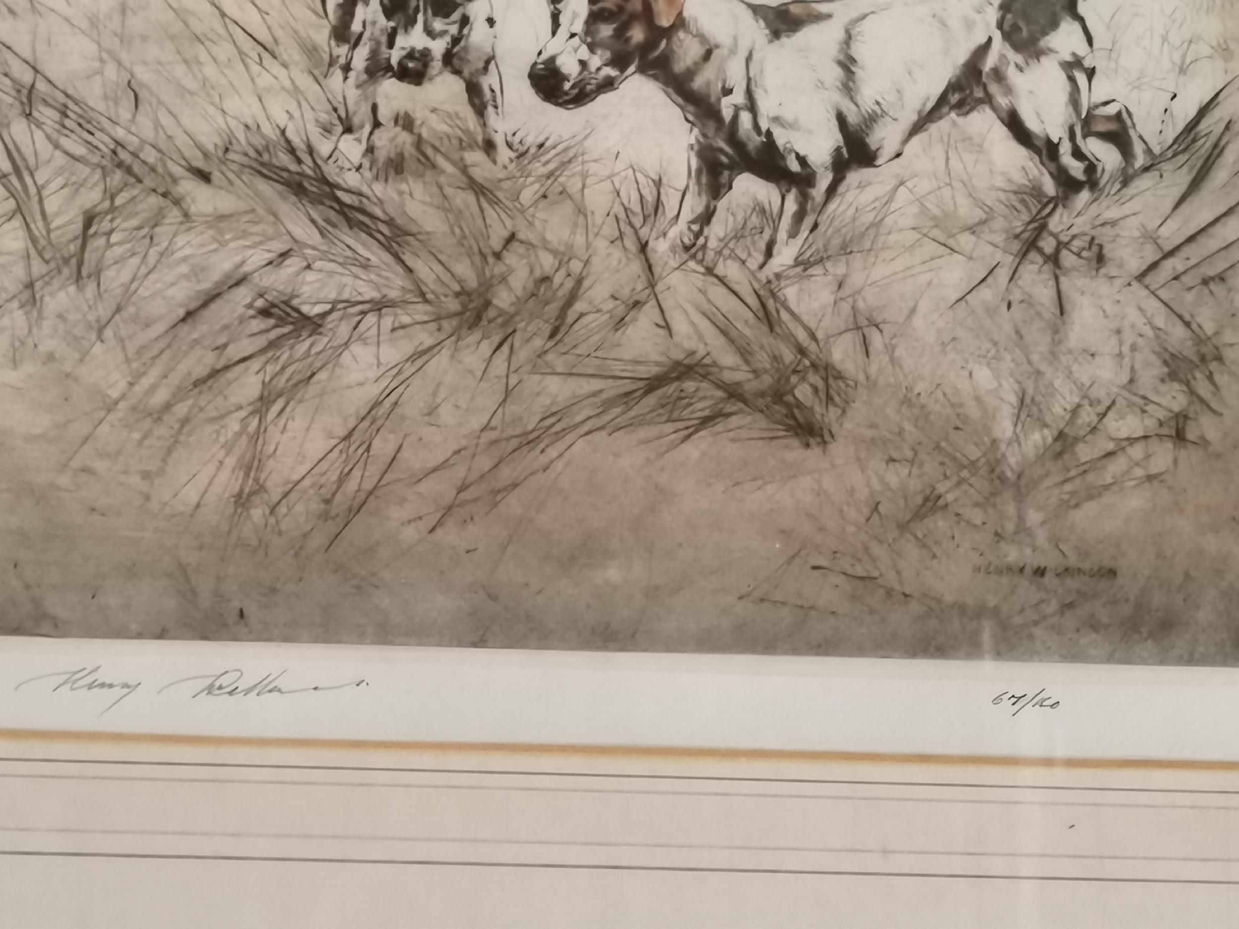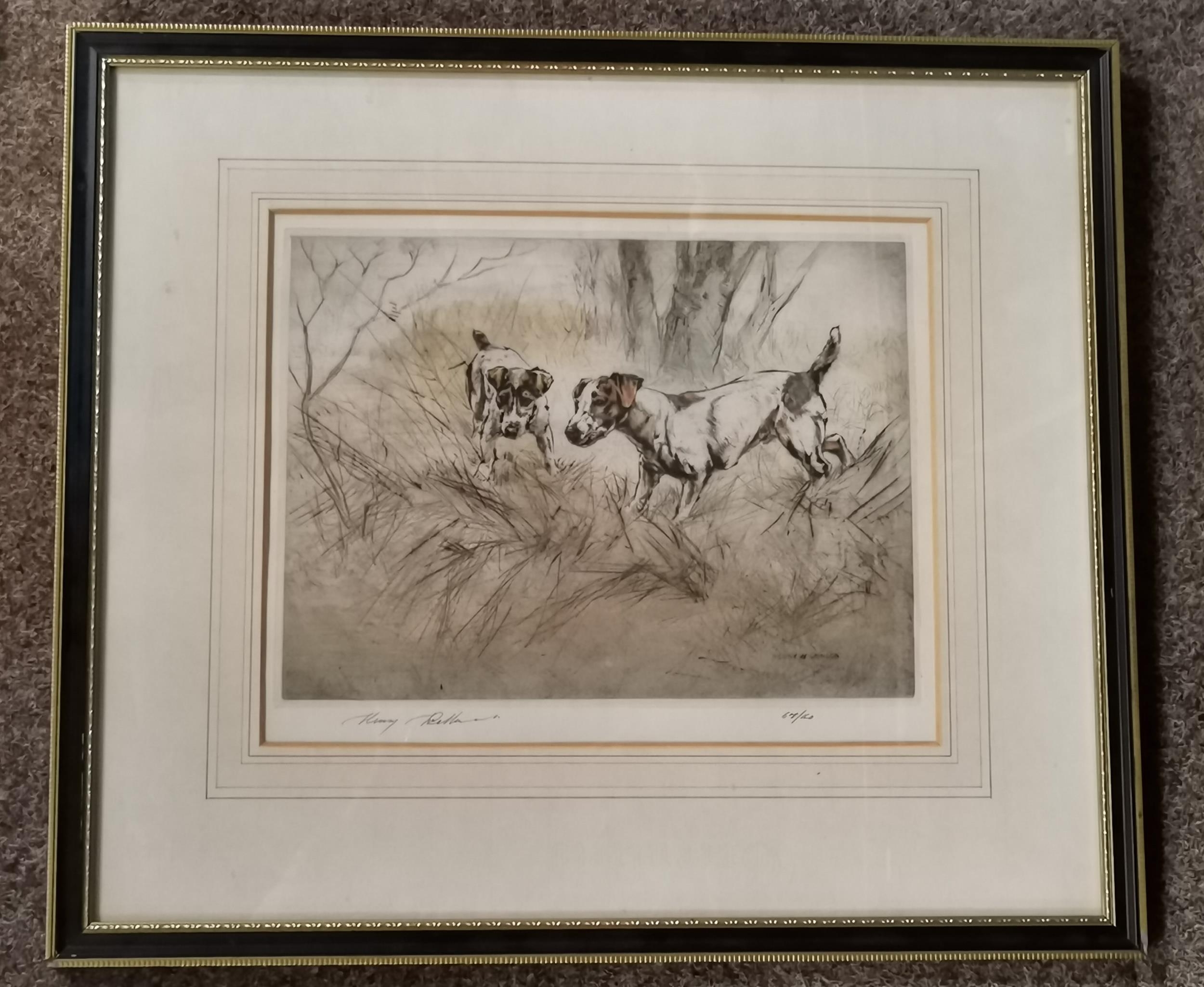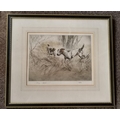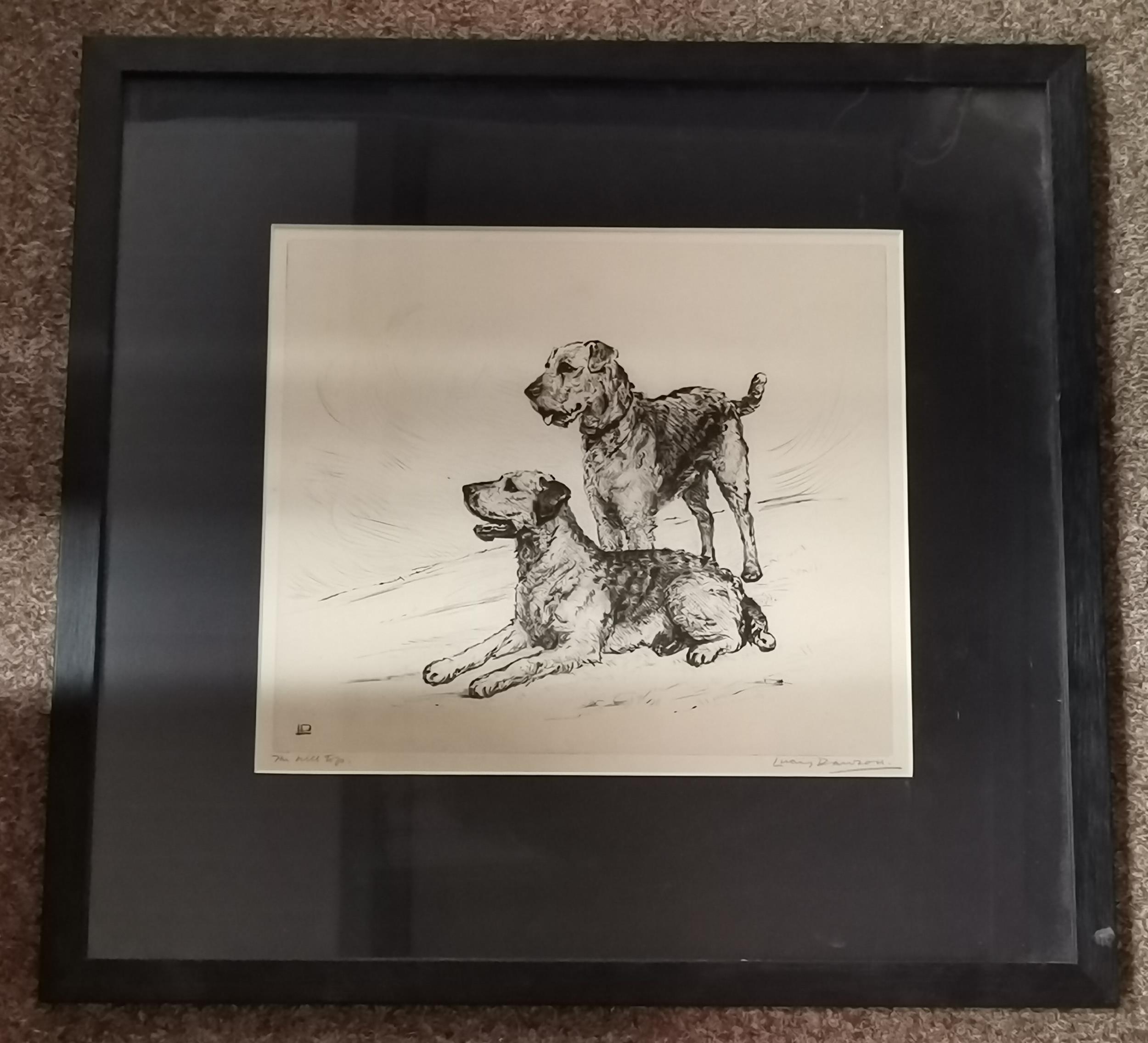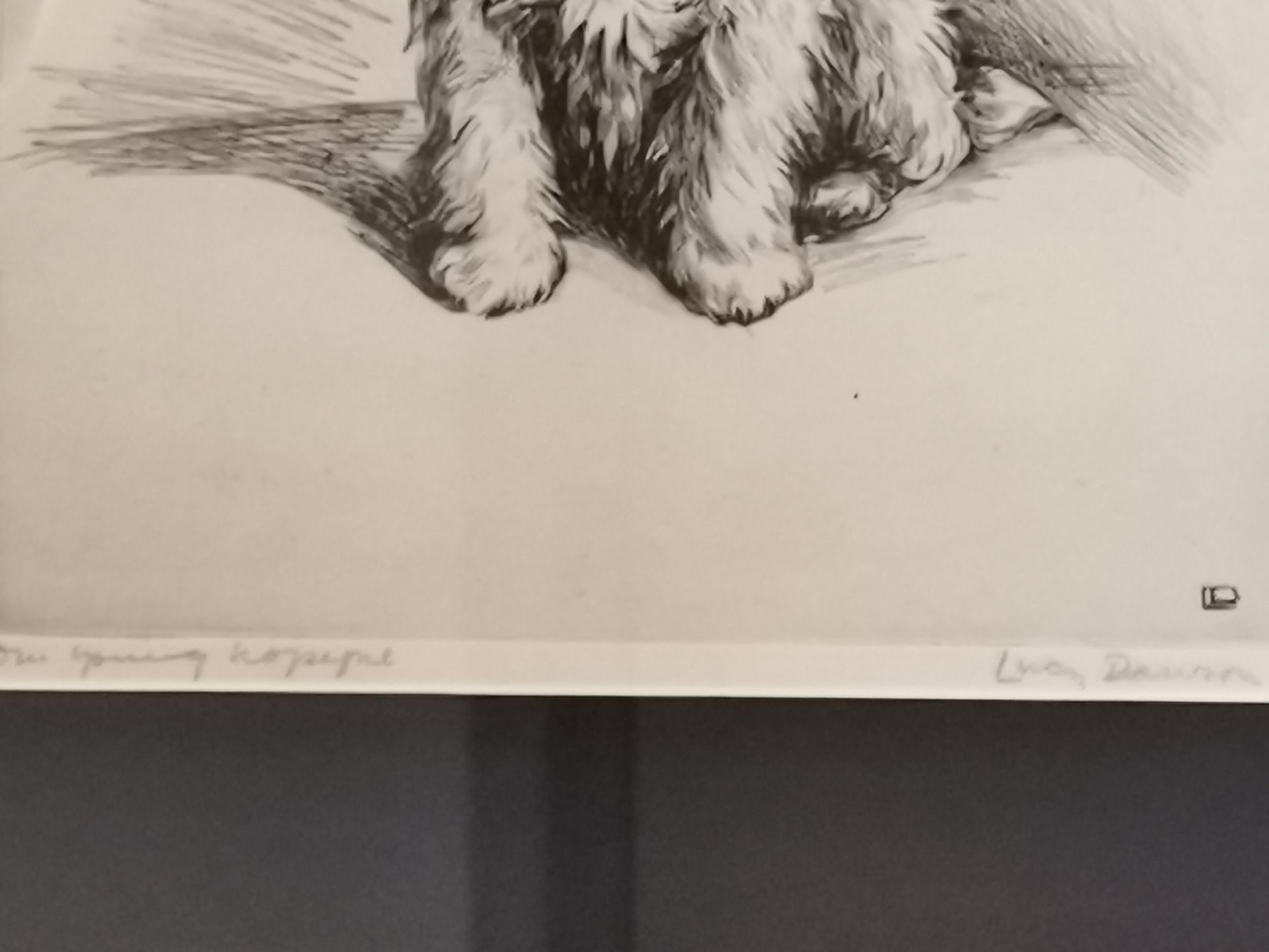 Henry Wilkinson (1921-2011), A pair of Jack Russell terriers, limited edition hand coloured etching, signed and numbered 67/150 in pencil to margin, framed; together with Lucy Dawson (1875-1954), 'The Hill Top' and 'Our Young Hopeful', two dog drypoint etchings, both titled and signed in pencil to margin, framed. (3) First 21cm by 28.5cm
