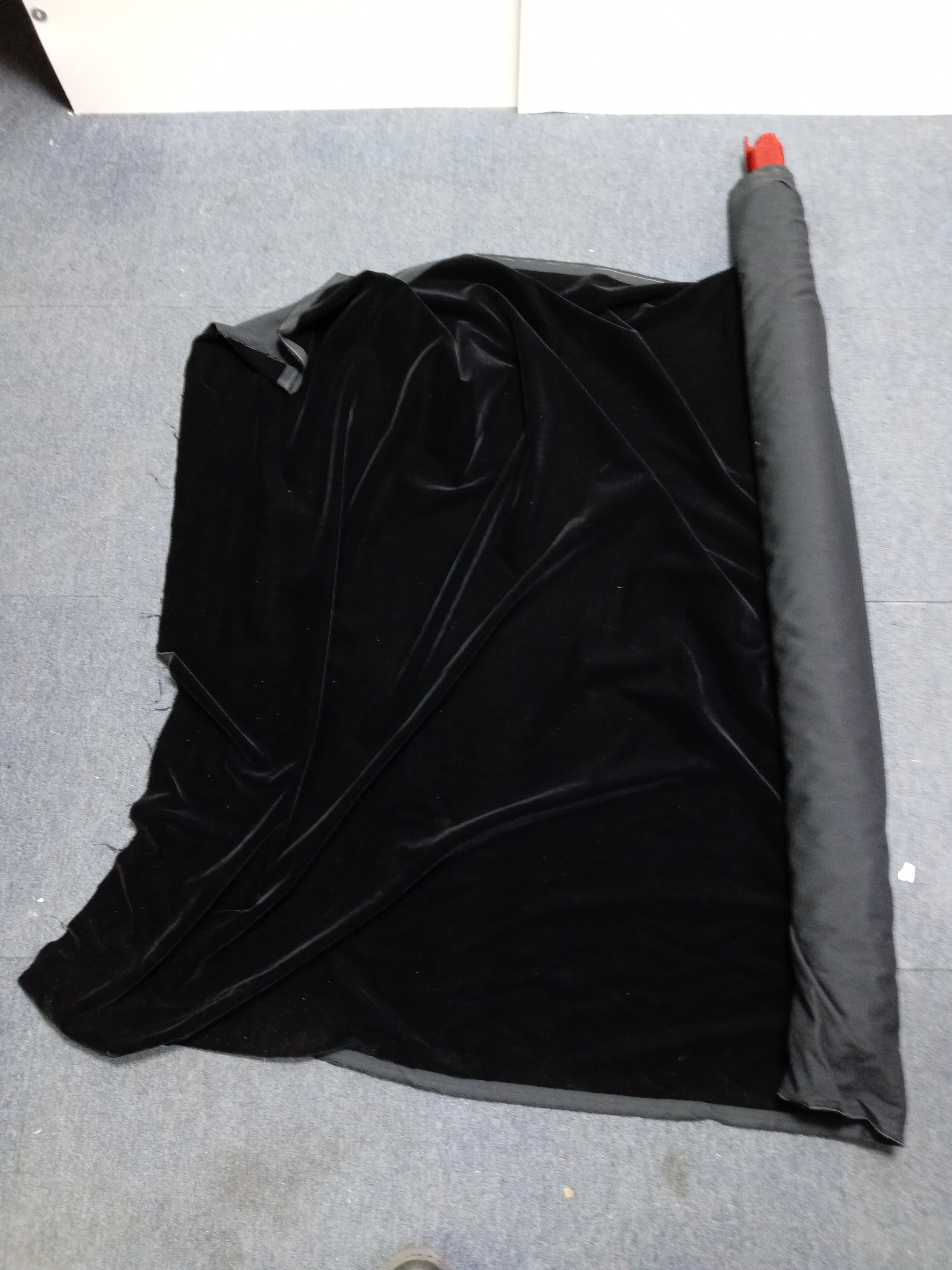 A roll of black velour / velvet fabric.