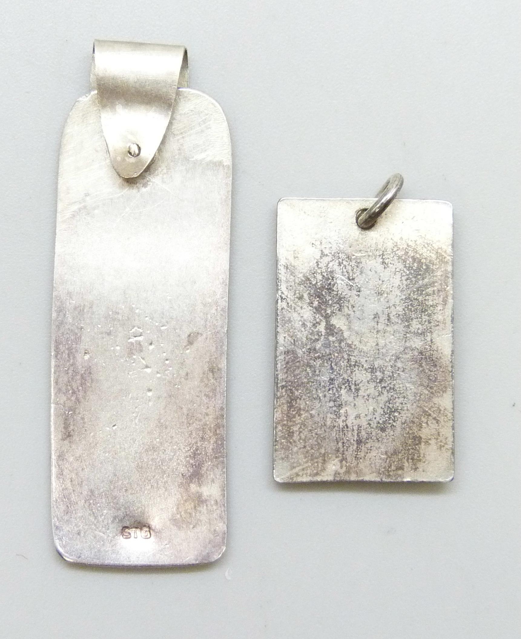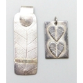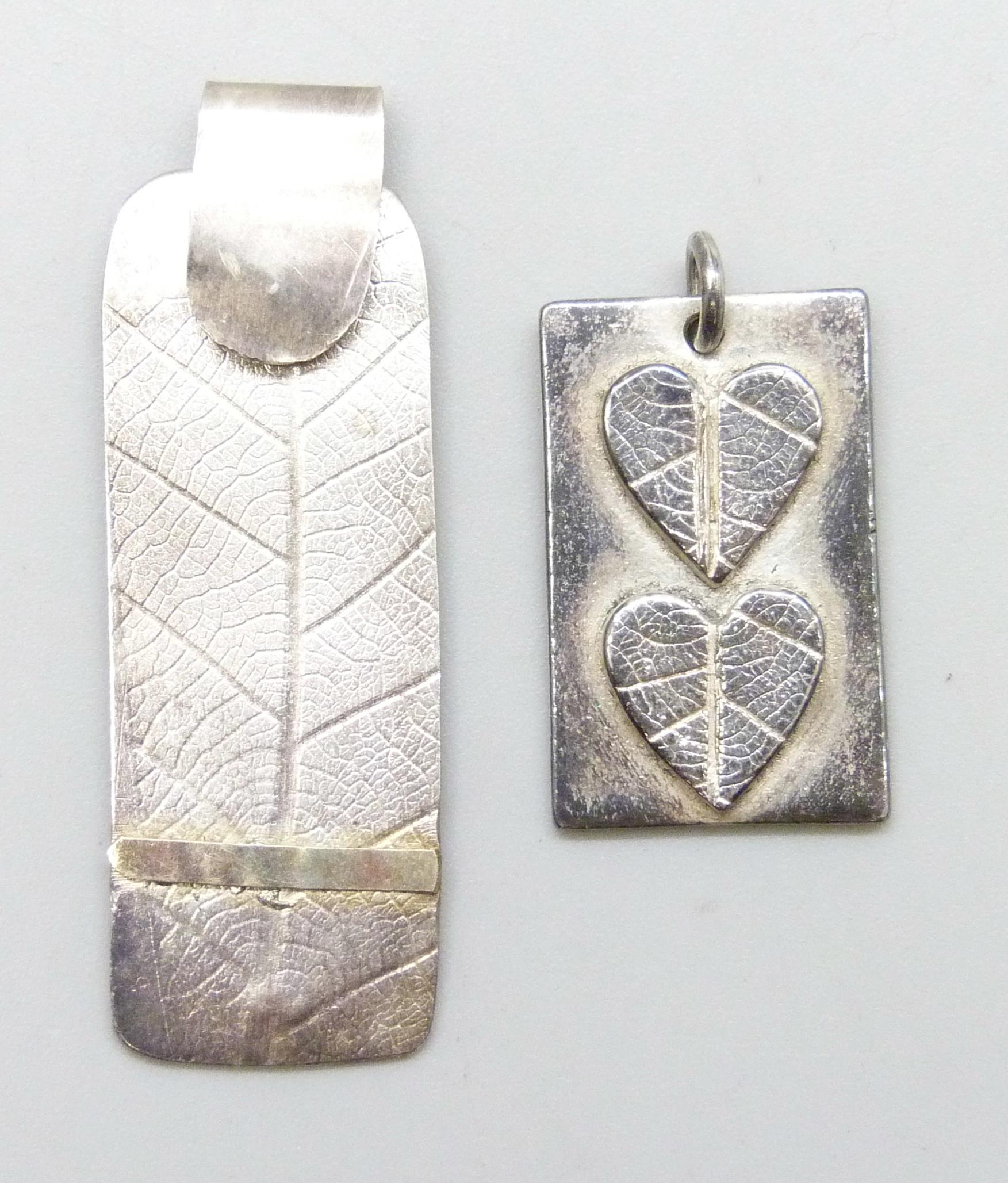A silver leaf pendant, and a white metal pendant with heart shaped leaf design, tests as silver, largest 4.6cm