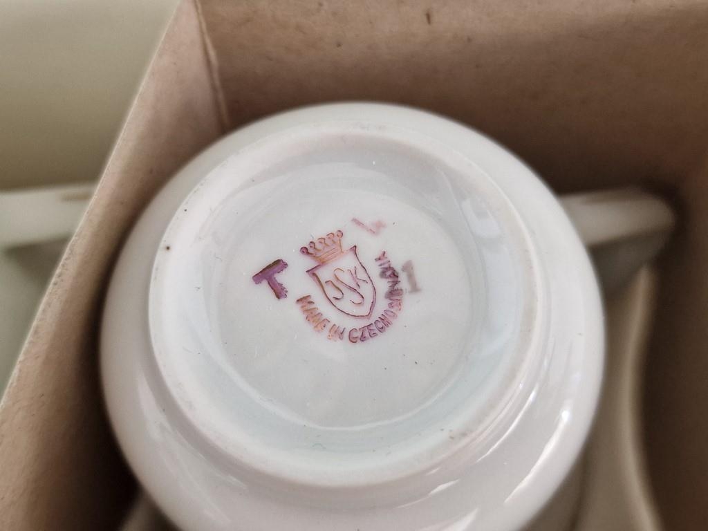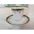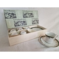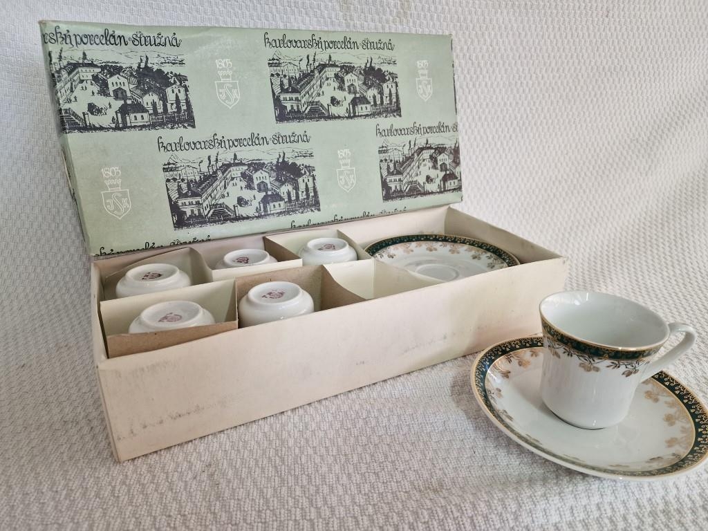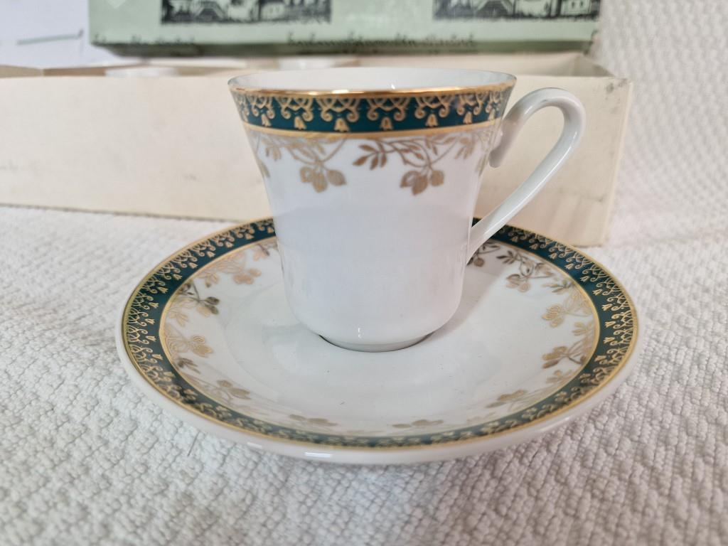 Boxed Set of 6 x Tea Cups & Saucers, Made in Czechoslovakia, with Green & Gold Decorative Borders
