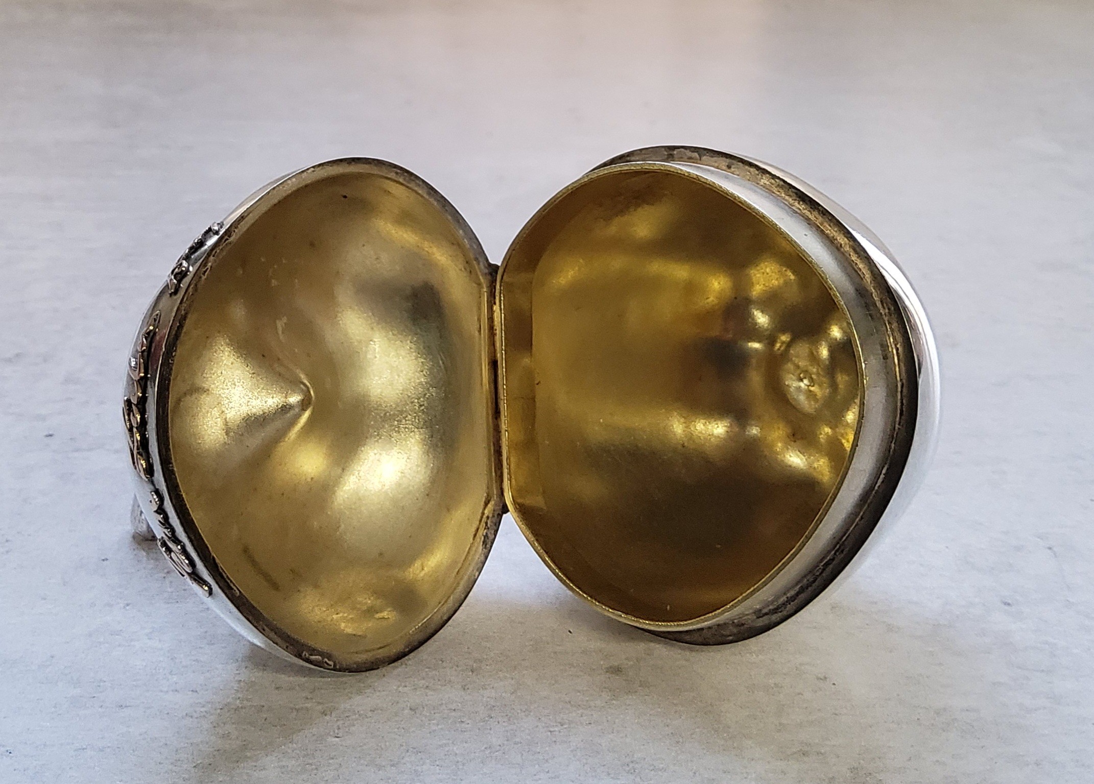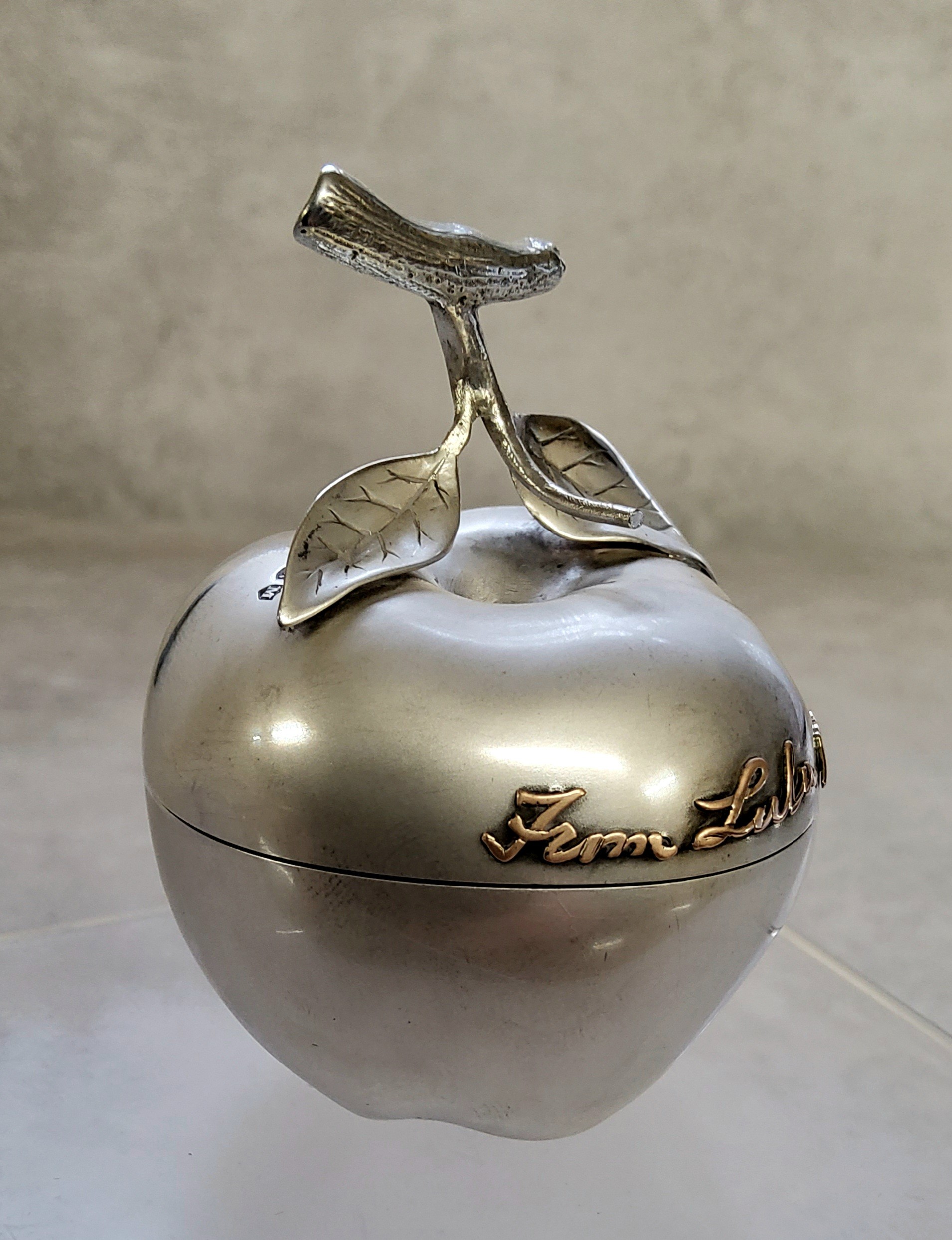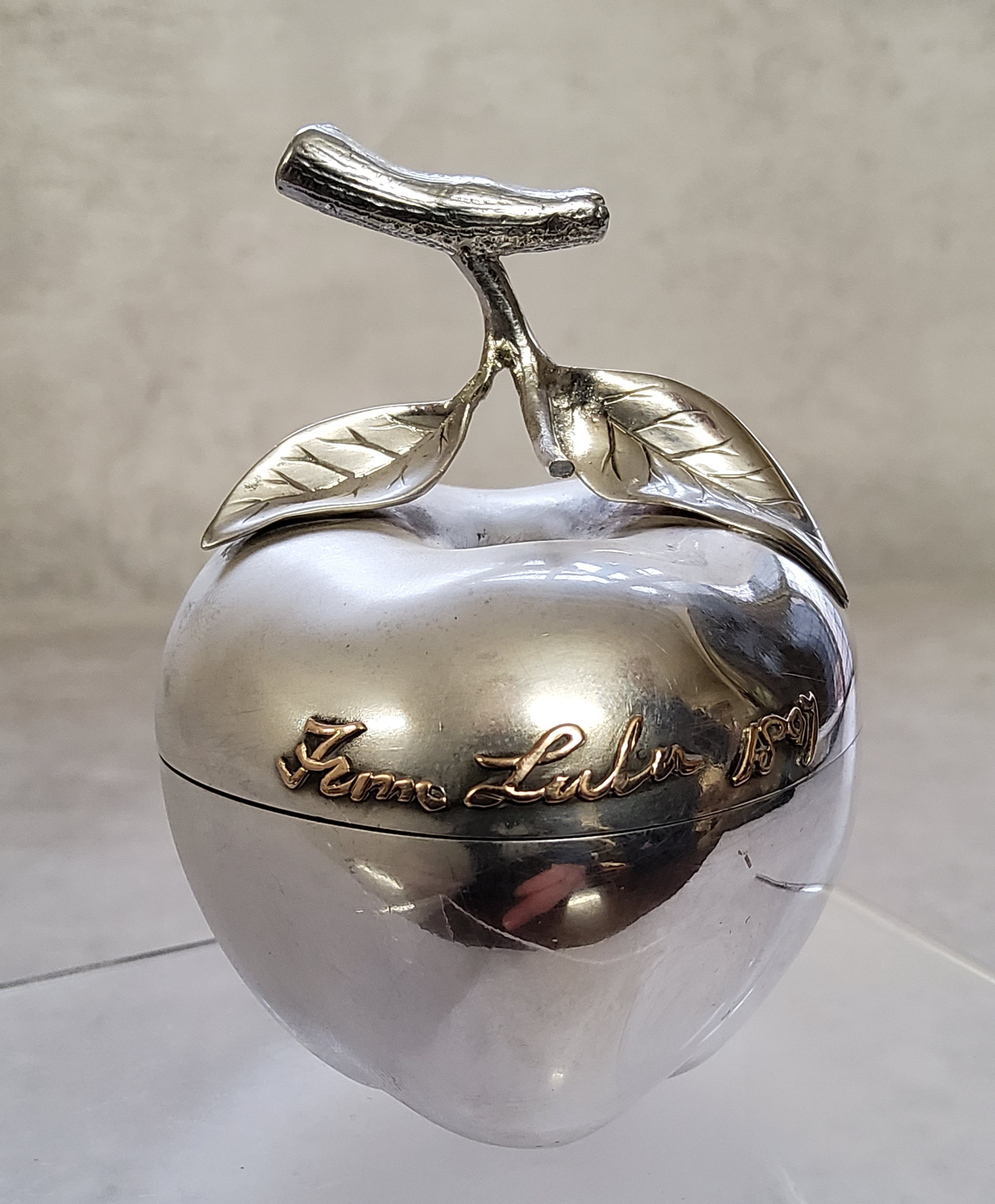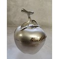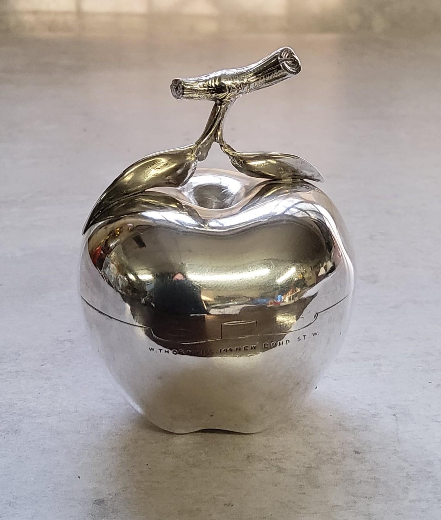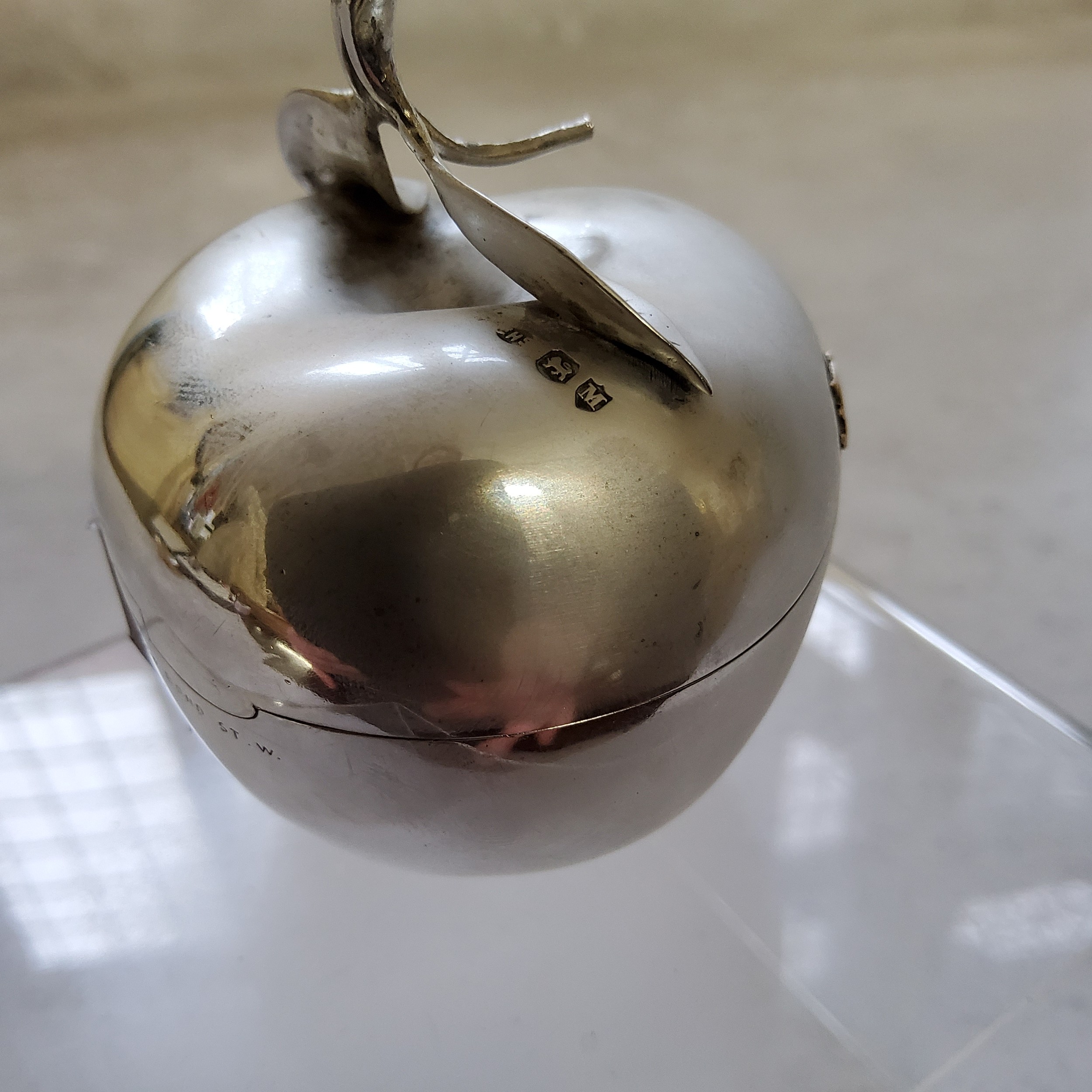 A novelty Victorian silver pill box in the form of an apple, hinged cover, applied gilt name & date Fern Lulu 1897, stamped to rear W Thornhill 144 New Bond Street, Edward H Stockwell?, London, 1887 75g