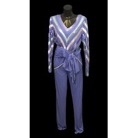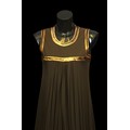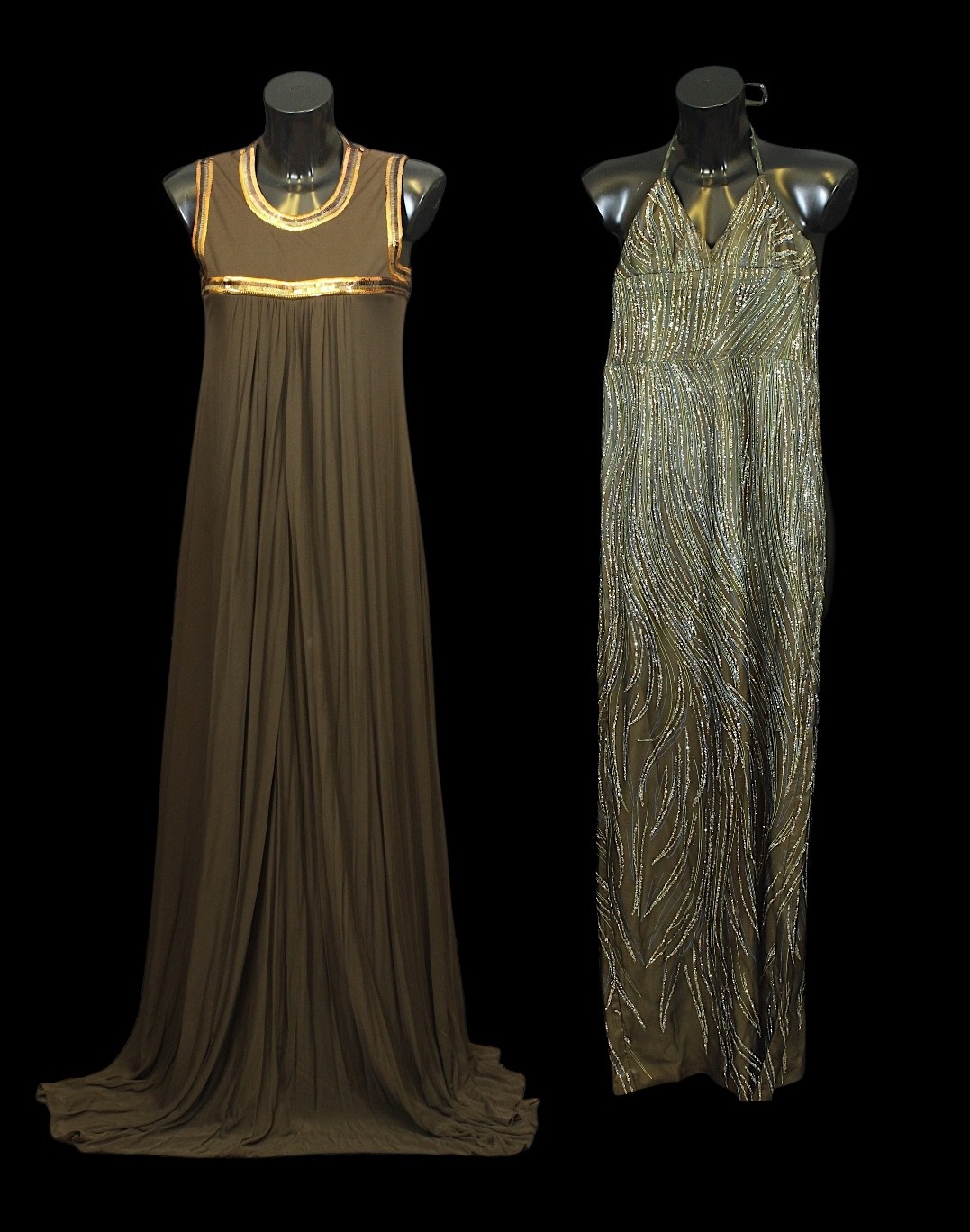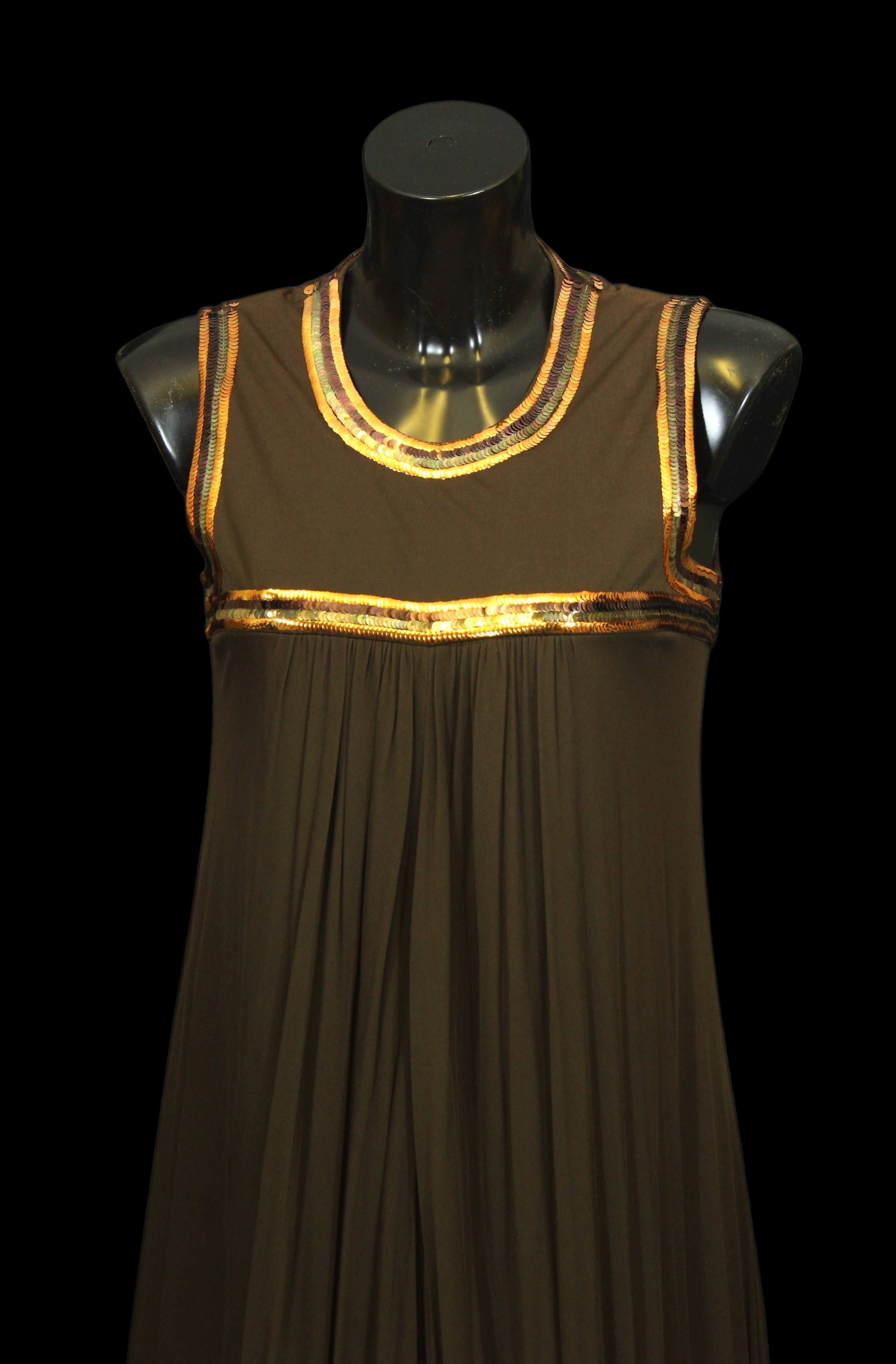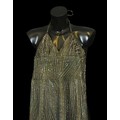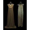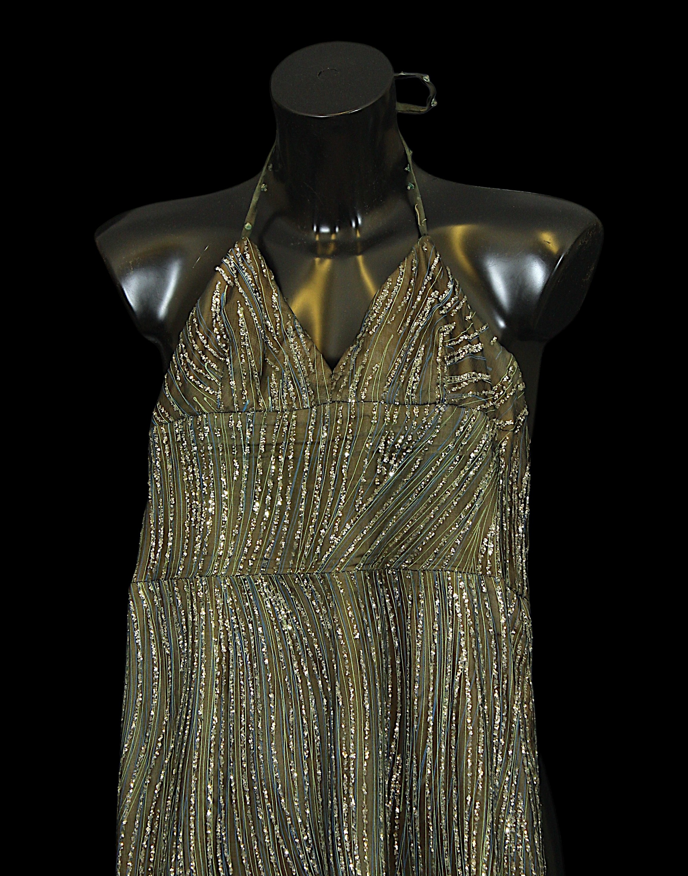 including: a brown synthetic maxi dress, sleeveless, the collar and waist trimmed with bronzed sequins, together with a full length gown, of brown / black coloured chiffon effect fabric, halter necked, embellished with silver sequins and green/ blue tread, waist flat approximately 35cm (2)