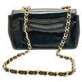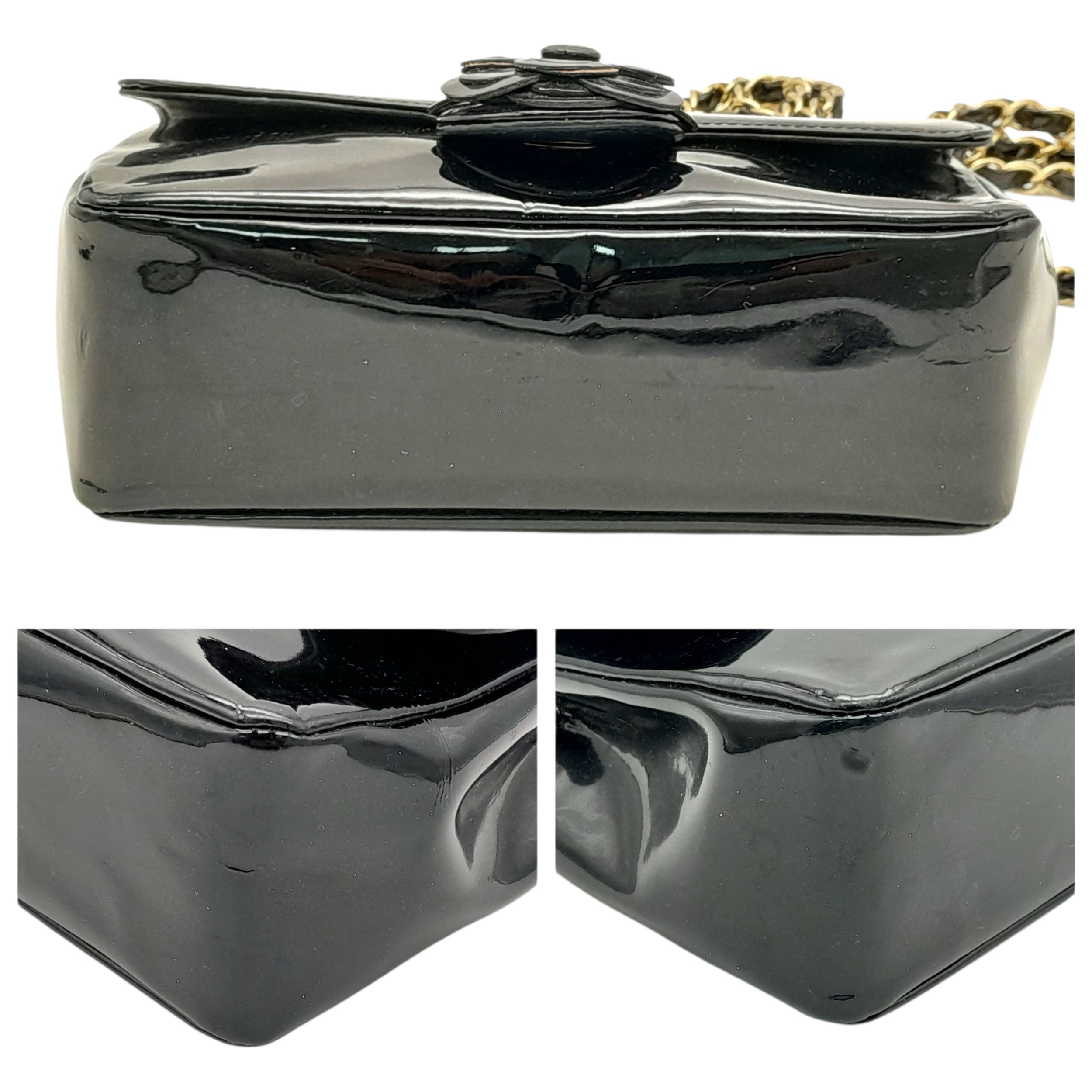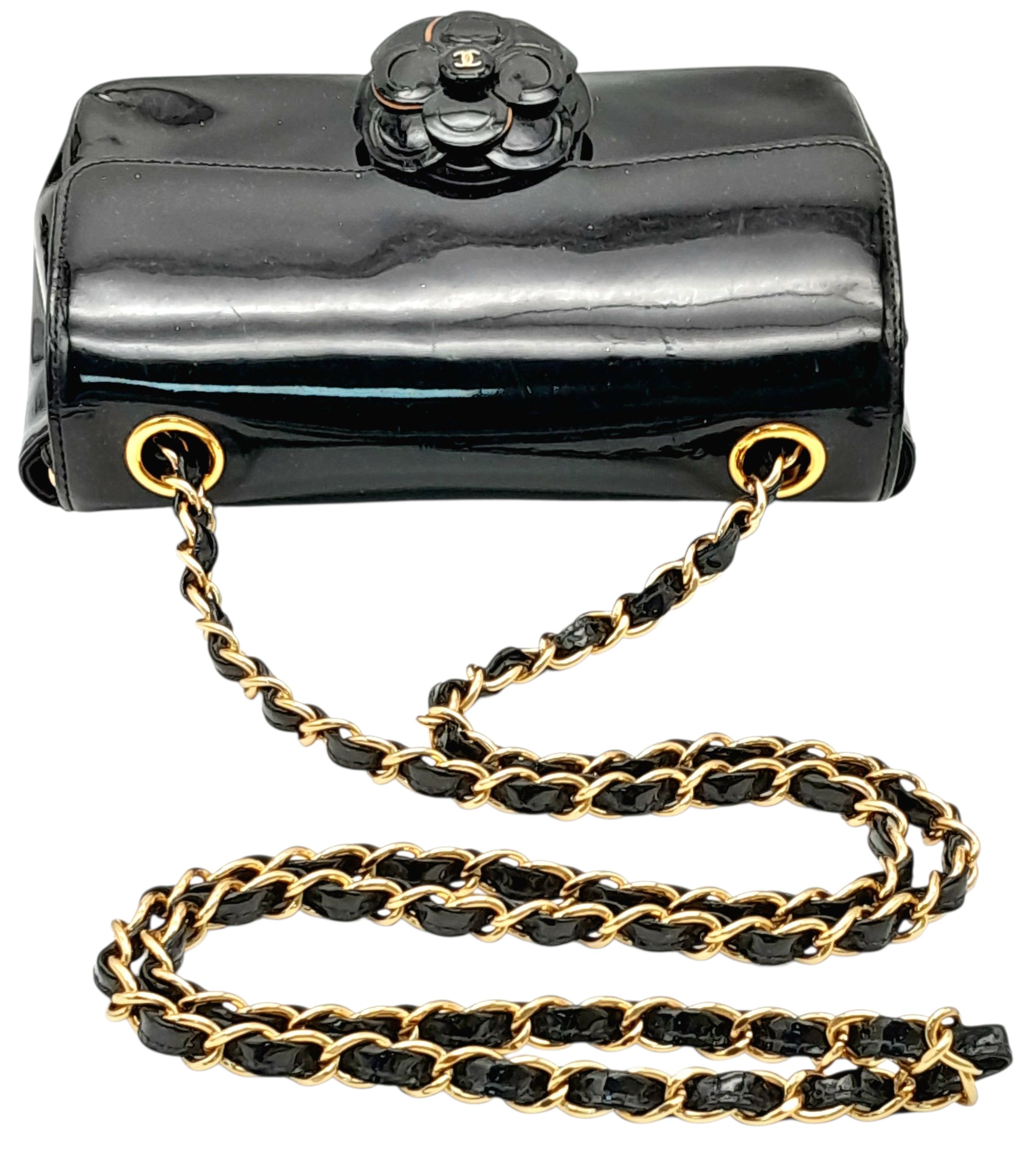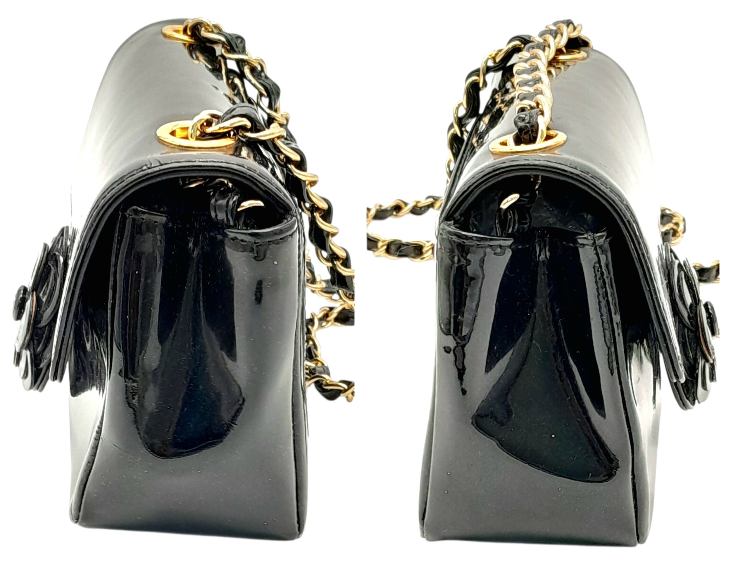 A Chanel Camellia Flap Bag in Black Patent Leather. Exterior open pocket. Gold tone hardware. Classic Chanel shoulder strap. Interior open pocket. 18cm width x 11cm height. Please see photos for conditions.
