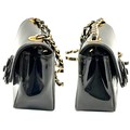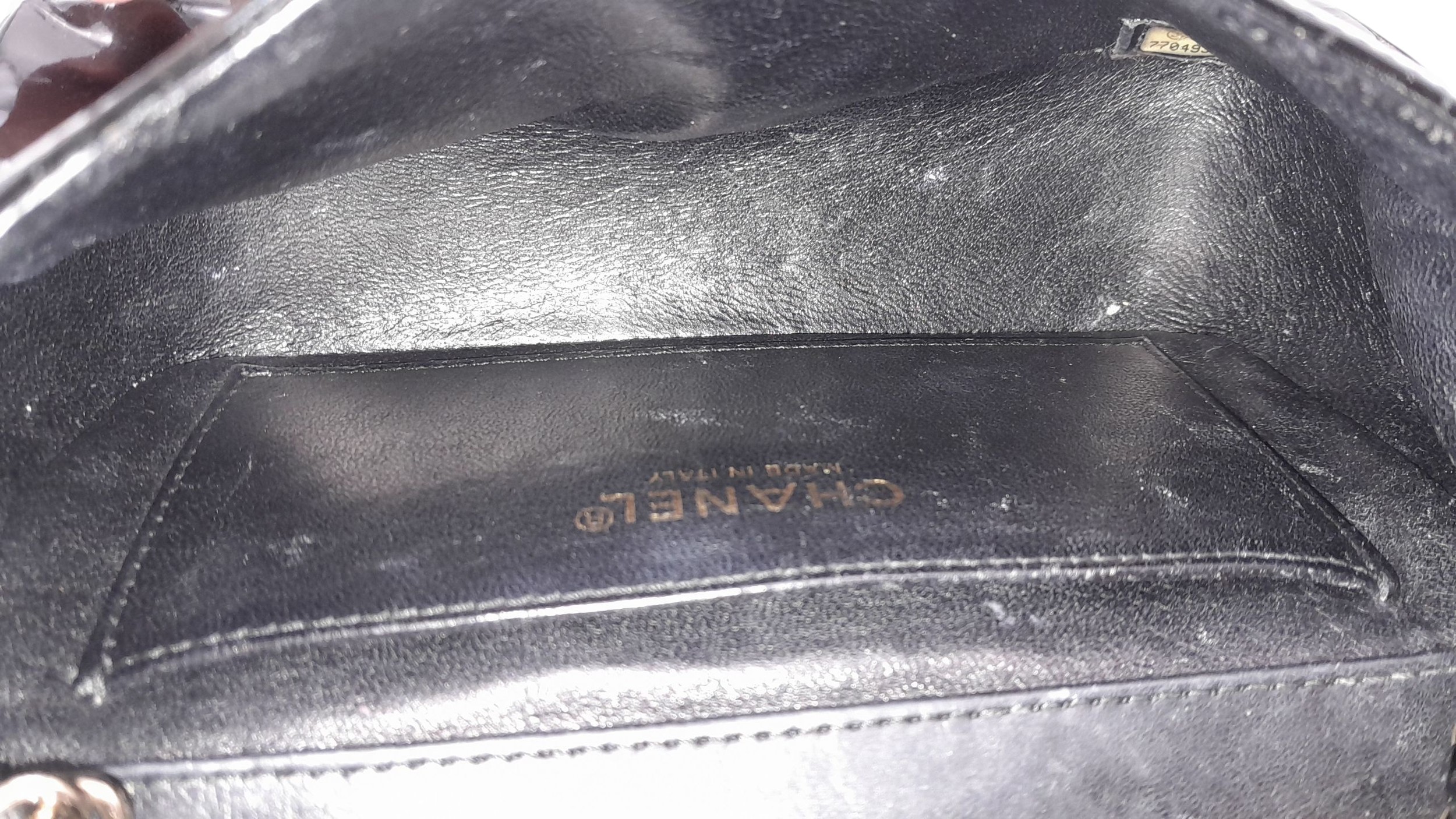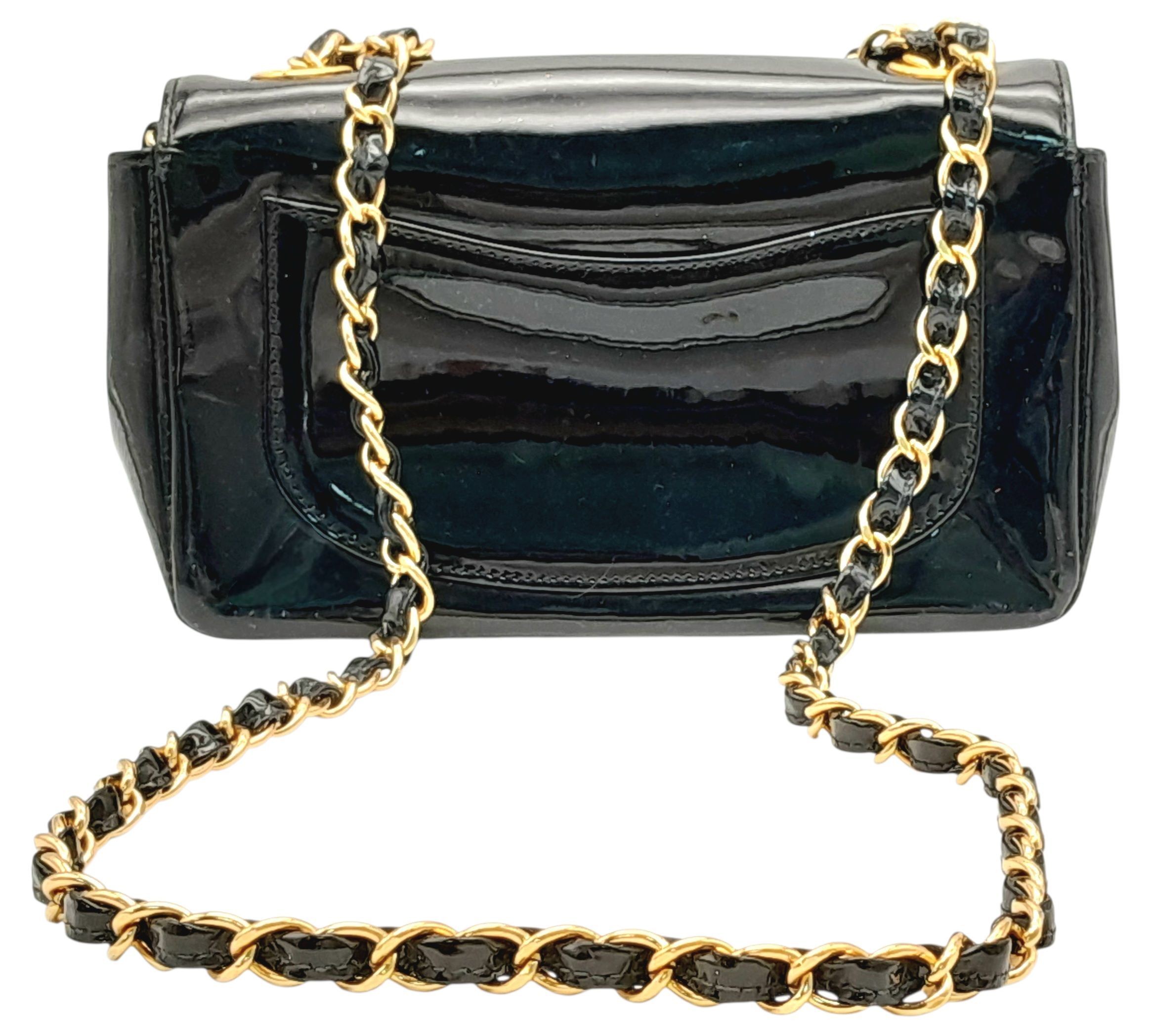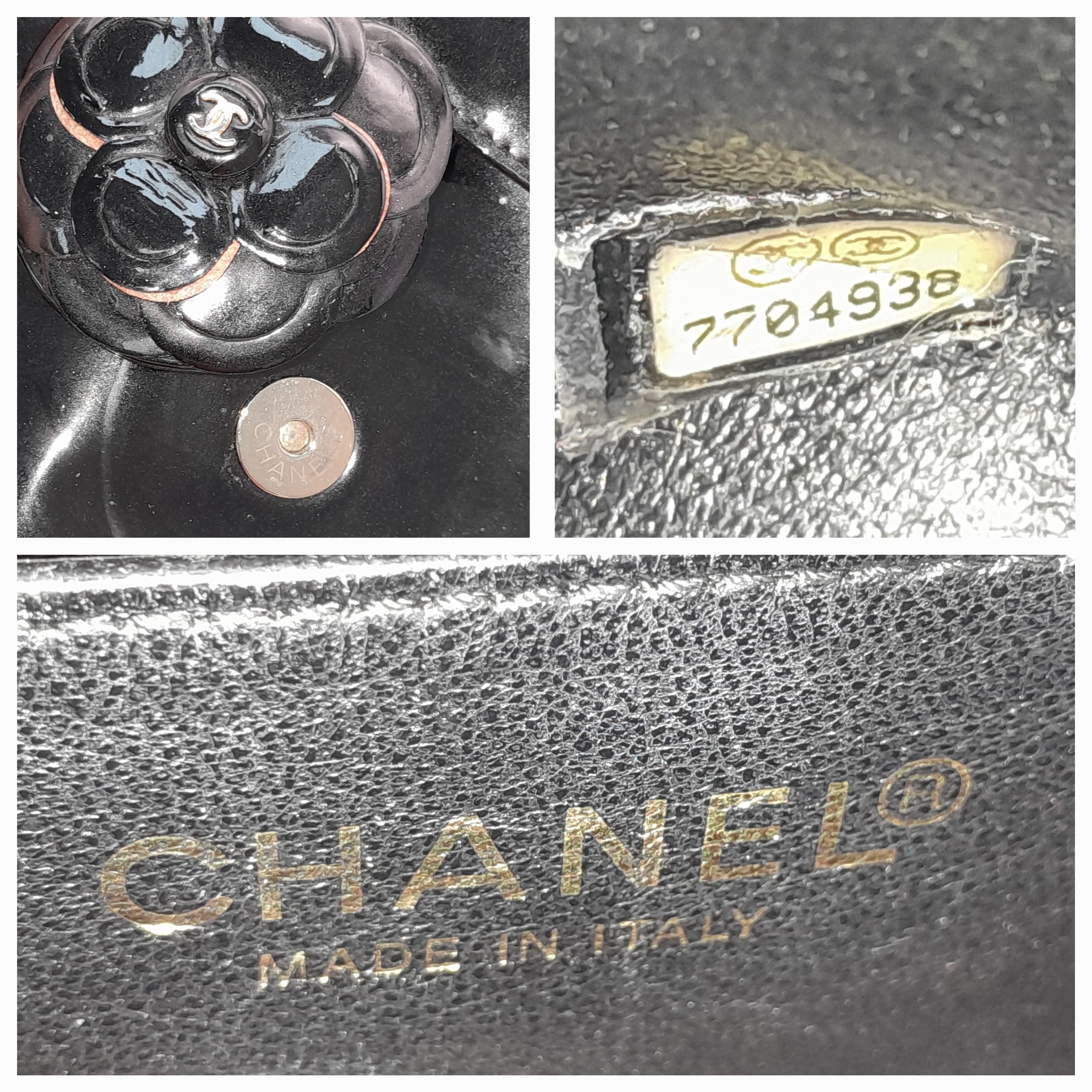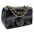A Chanel Camellia Flap Bag in Black Patent Leather. Exterior open pocket. Gold tone hardware. Classic Chanel shoulder strap. Interior open pocket. 18cm width x 11cm height. Please see photos for conditions.