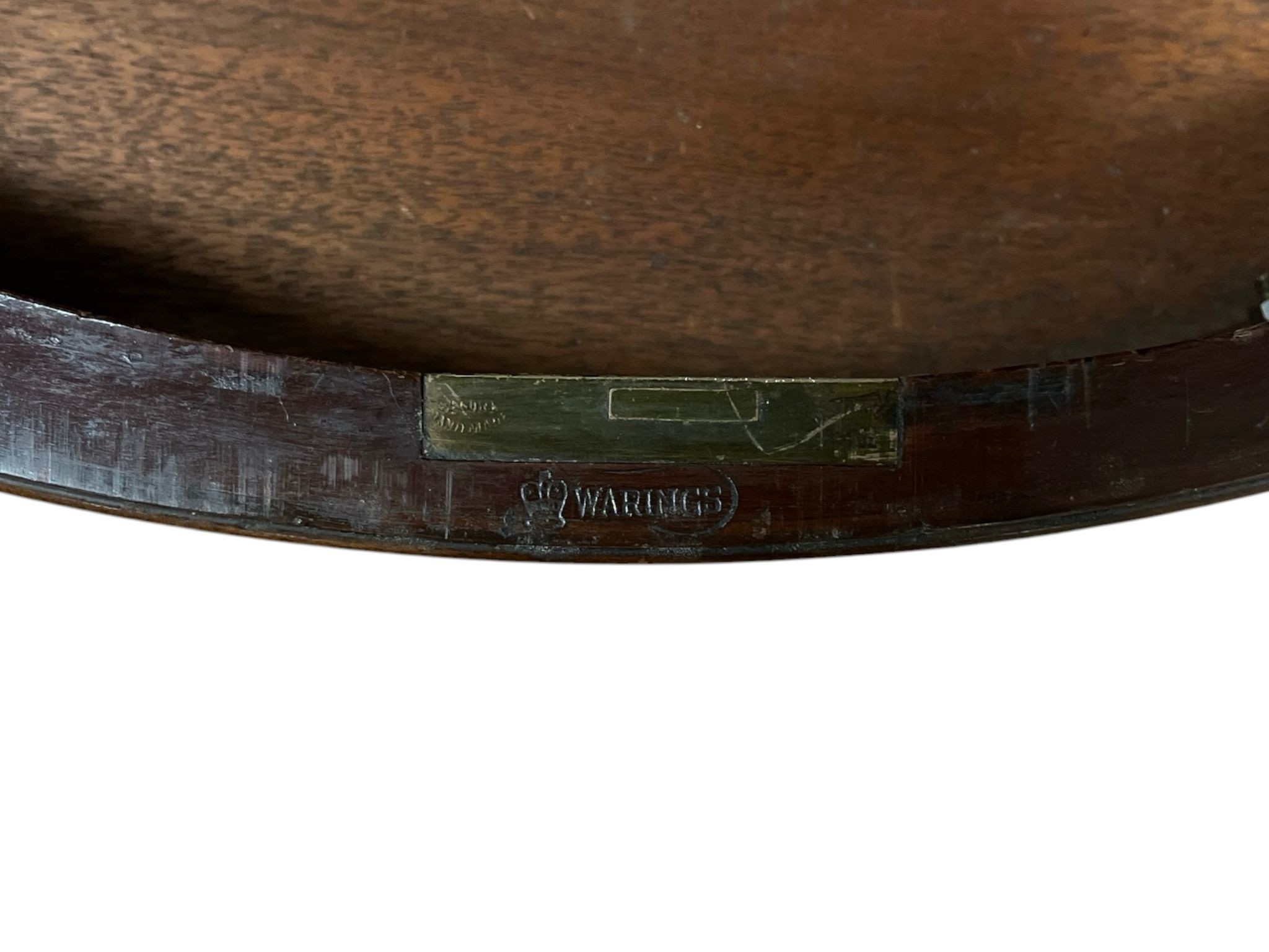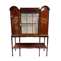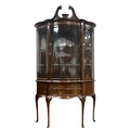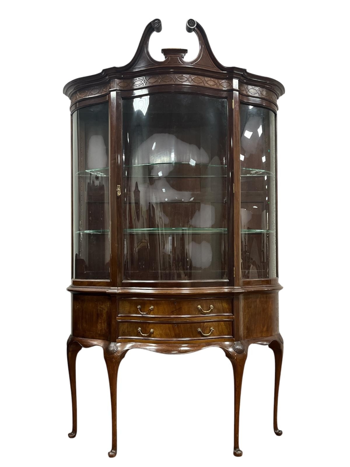 A FINE HEPPLEWHITE STYLE MAHOGANY CHINA DISPLAY CABINET the swan neck pediment above a bowed glazed door containing adjustable shelves flanked by bowed glazed panels the base with three long drawers on cabriole legs with pad feet stamped 'Warings' 236cm (h) x 141cm (w) x 39cm (d)