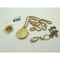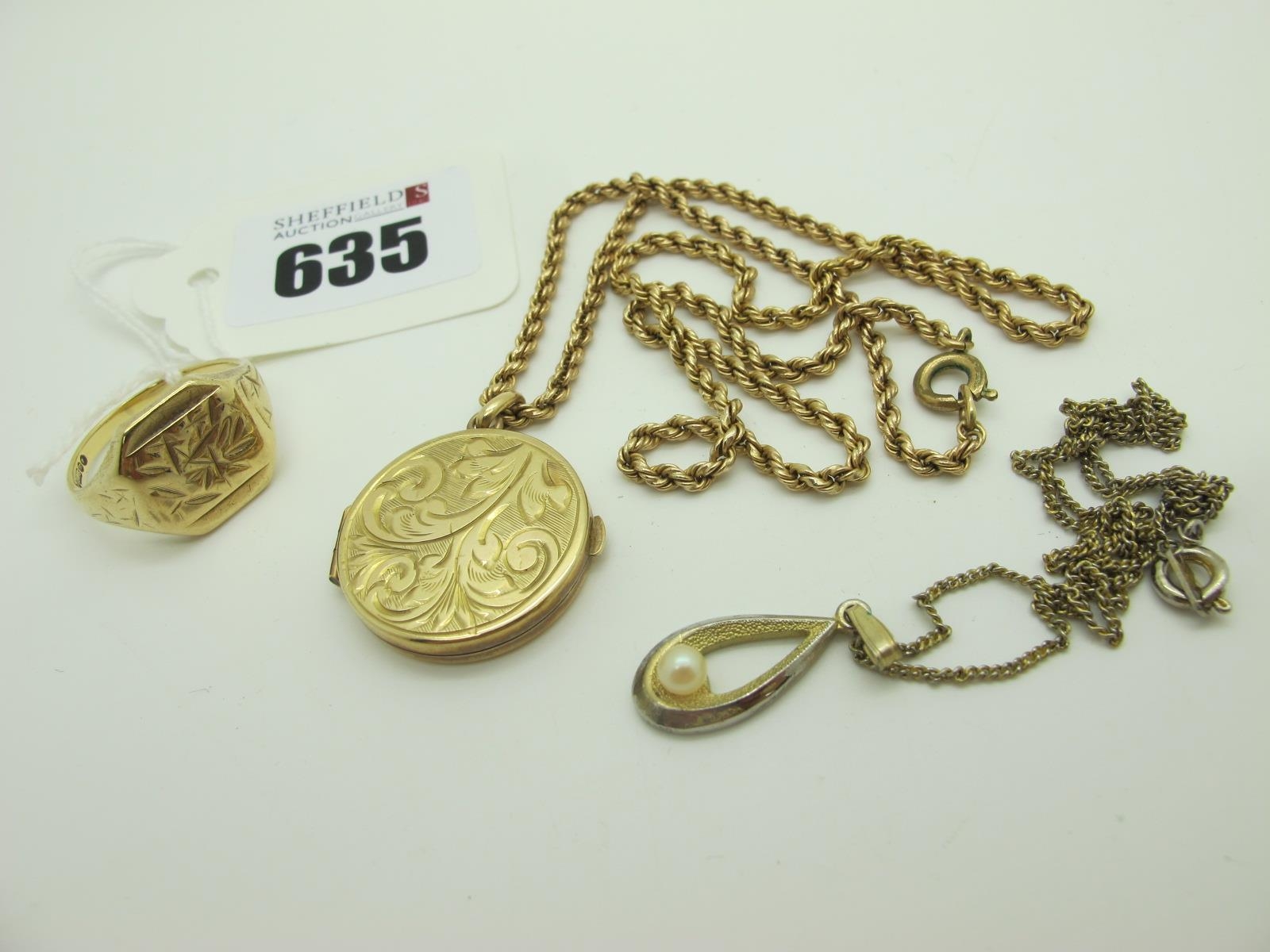 A 9ct Gold Signet Style Ring, with textured design (finger size T) (8grams); together with a 9ct gold ropetwist chain (non gold clasp), suspending a 9ct gold circular locket pendant; and a further pendant on chain.