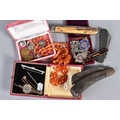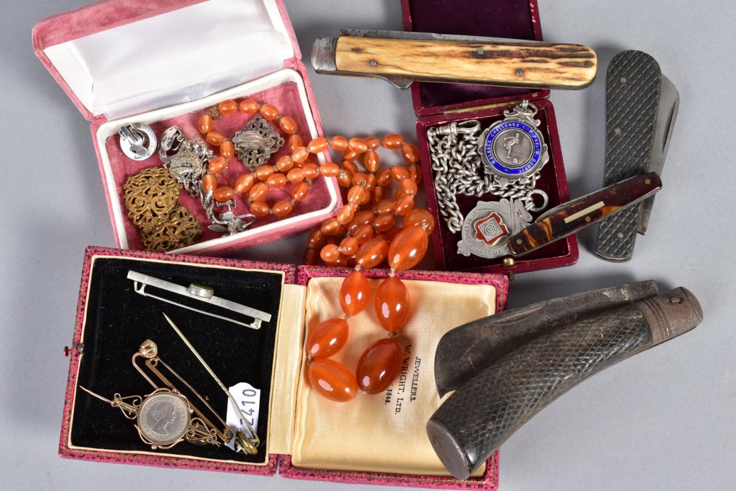 A SELECTION OF JEWELLERY etc, to include an early 20th Century gold horse shoe stickpin set with split pearls, a banded agate stickpin, further stickpins, a coin brooch, a bar brooch, two silver sporting medals and a chain, with silver hallmarks, an orange glass bead necklace, four folding knives, three pairs of earrings etc