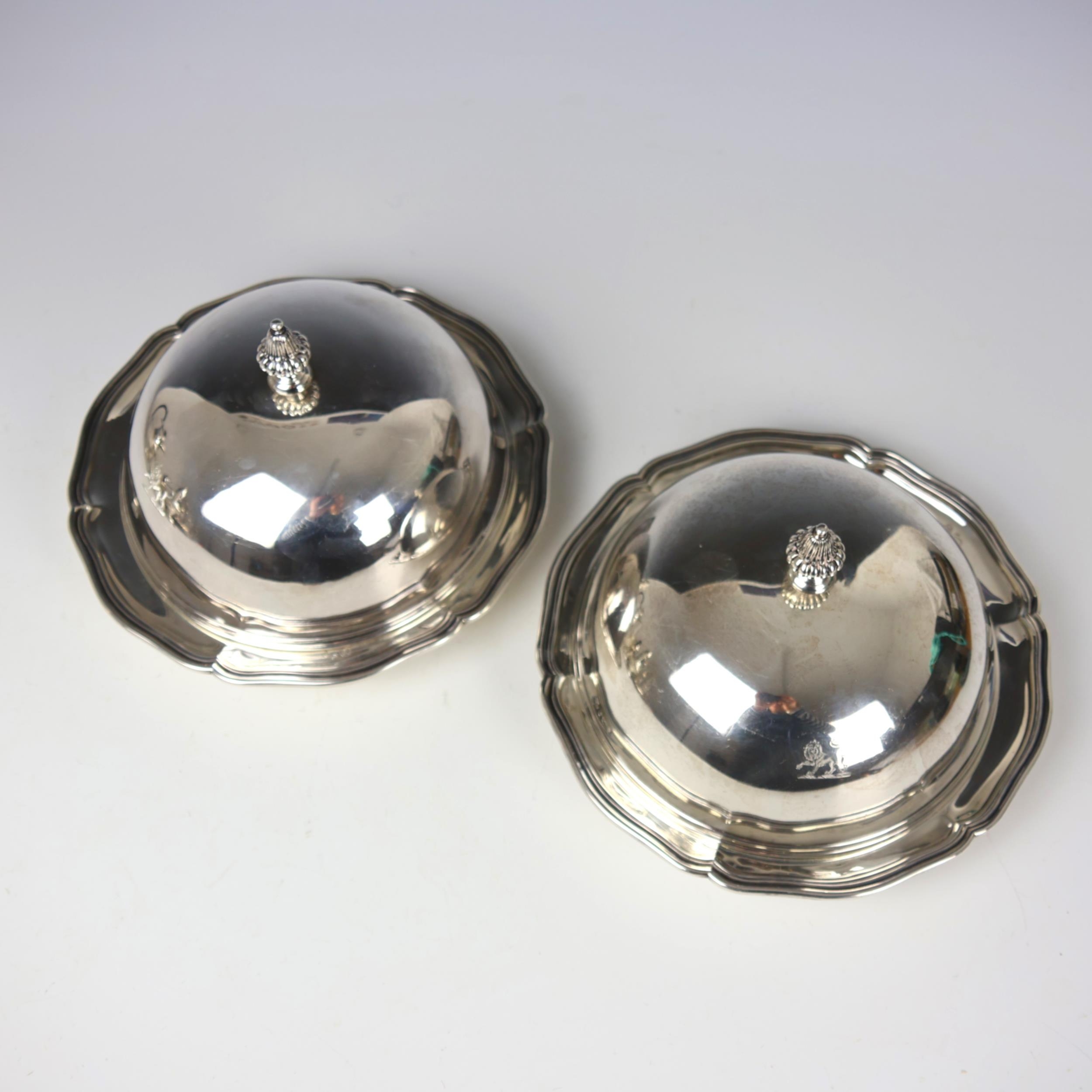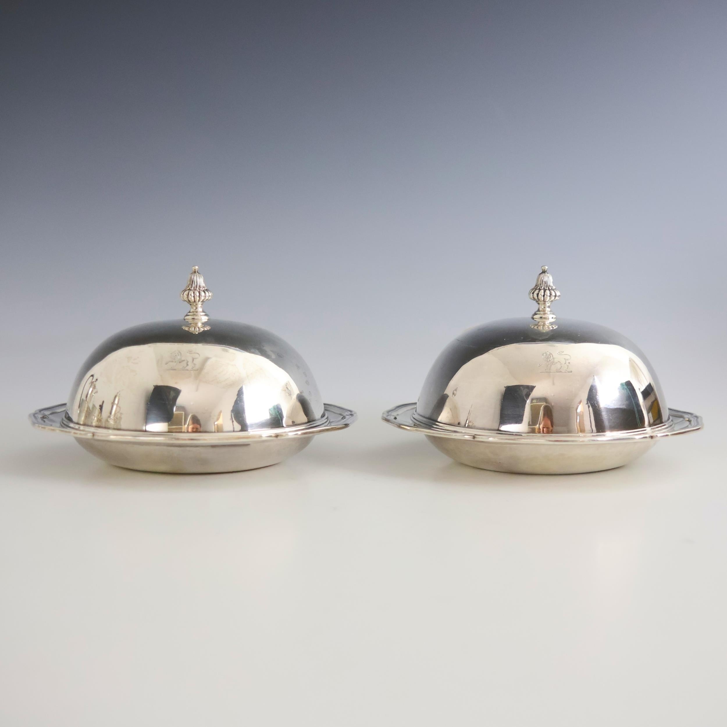 A pair of William IV silver muffin dishes and cover, R & S Garrard & Co, London 1836, the grooved finials above plain polished domed cover, upon shaped hexagonal dishes, stamped to base ‘Garrard, Panton Street, London’ 19cm wide, gross weight 39ozt (2)