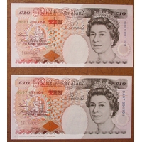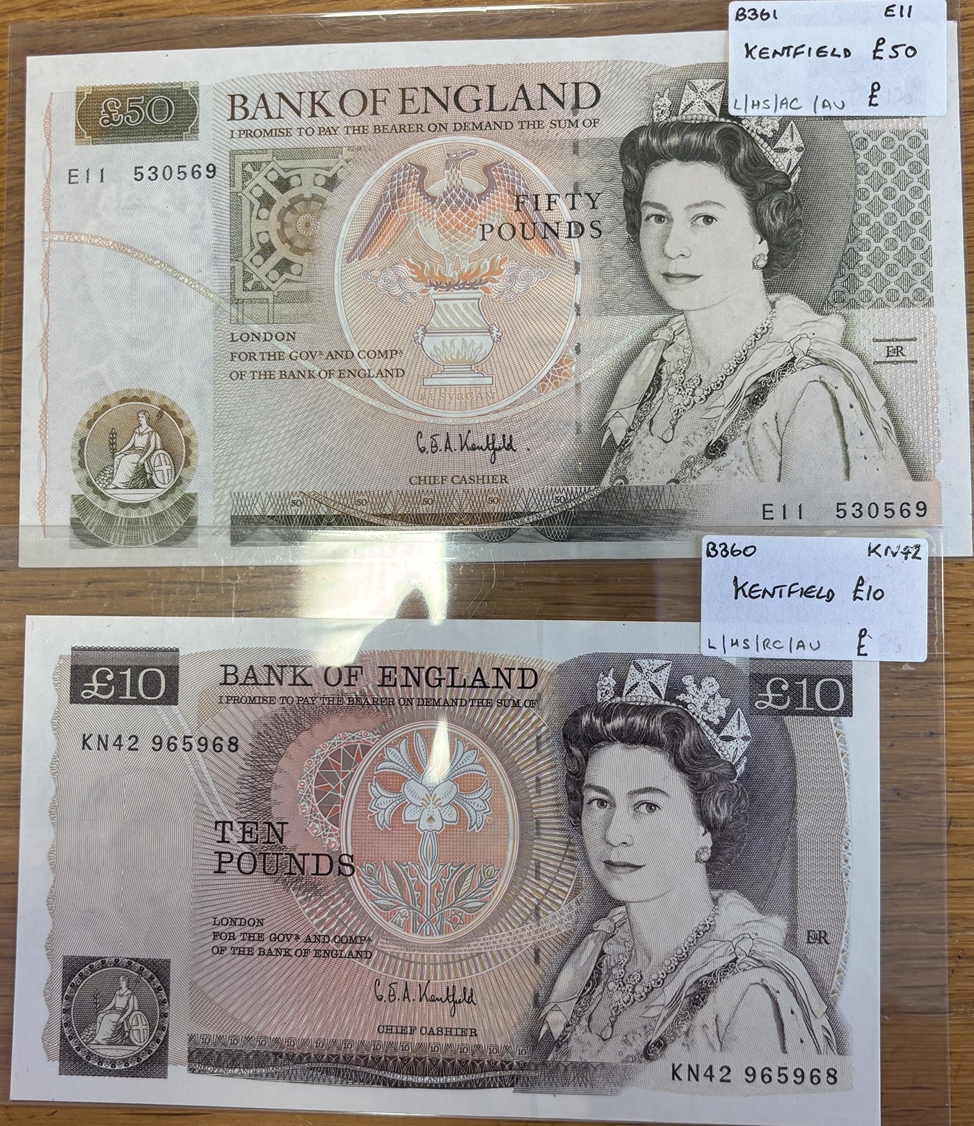 G.E.A. Kentfield. Pair of banknotes in plastic wallets, uncirculated including 1991 £50 E11 (Duggleby B361) and £10 KN42 (Duggleby B360). Qty 2. (N)
