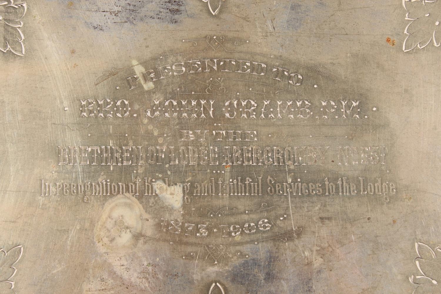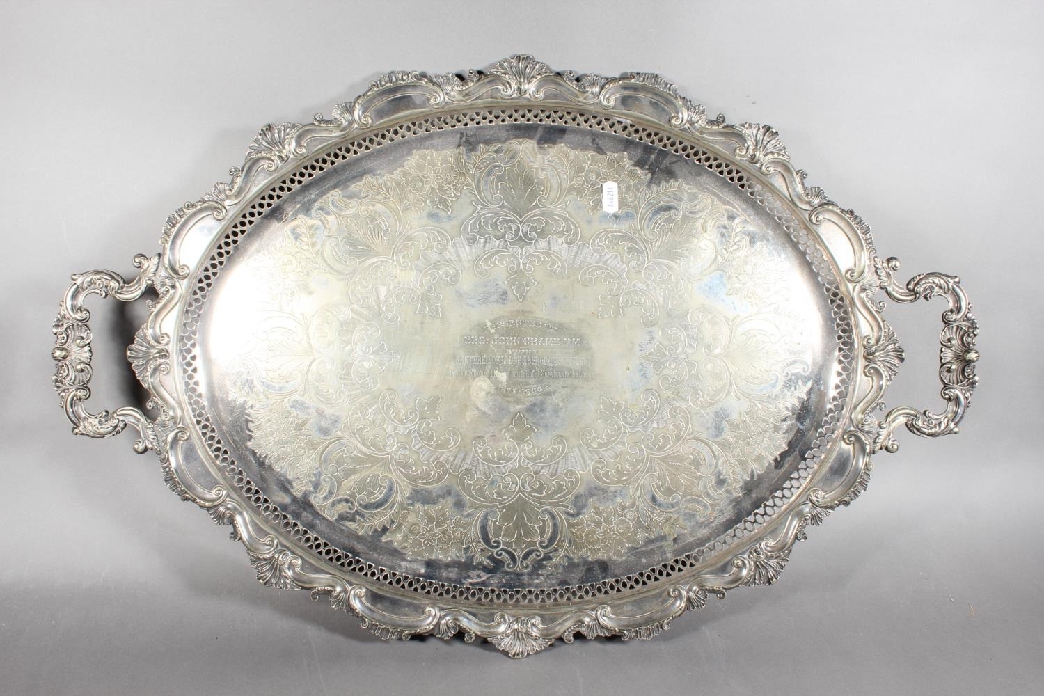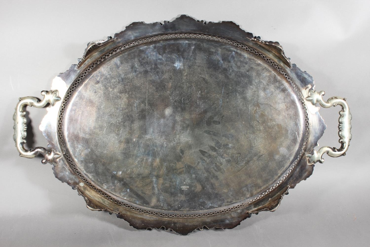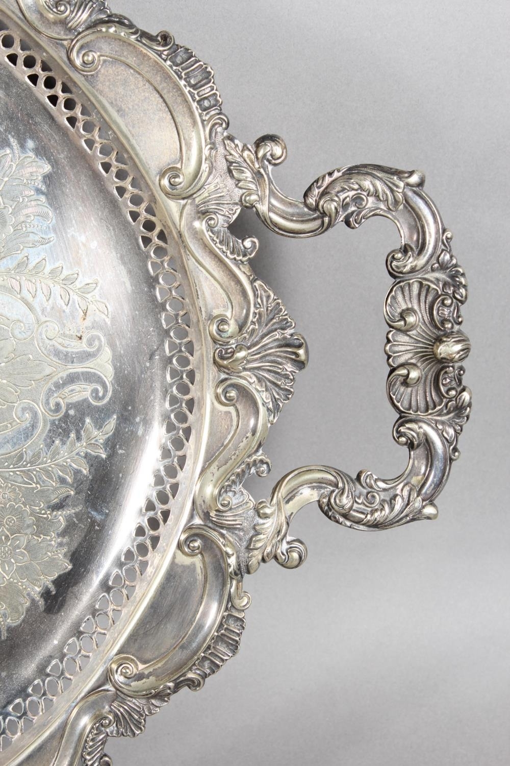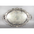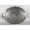 Silver-plated twin-handled scroll and foliate decorated tray with pierced gallery.