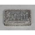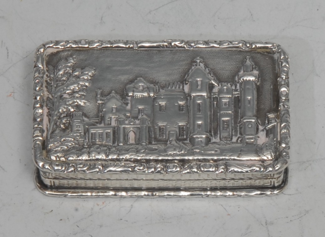 A William IV silver rounded rectangular castle top vinaigrette, the hinged cover in relief with a view of Abbotsford House, Melrose, home of Sir Walter Scott, engine turned sides and base, 4.5cm wide, Taylor & Perry, Birmingham 1835