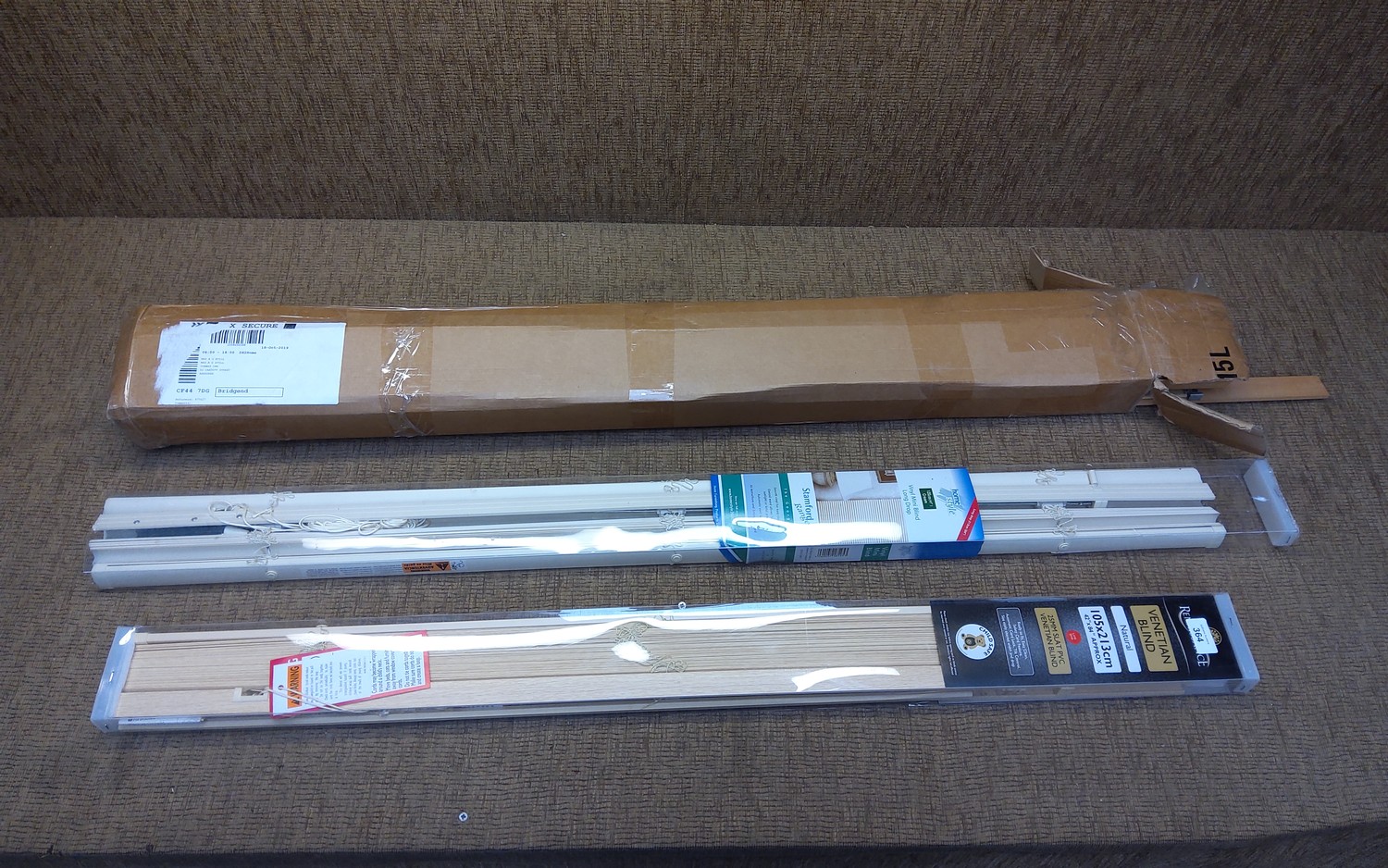 Three boxed new venetian blinds 42" x 84"/ 84" x 47.