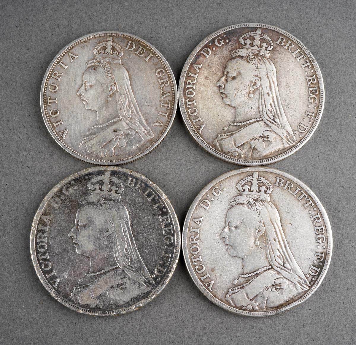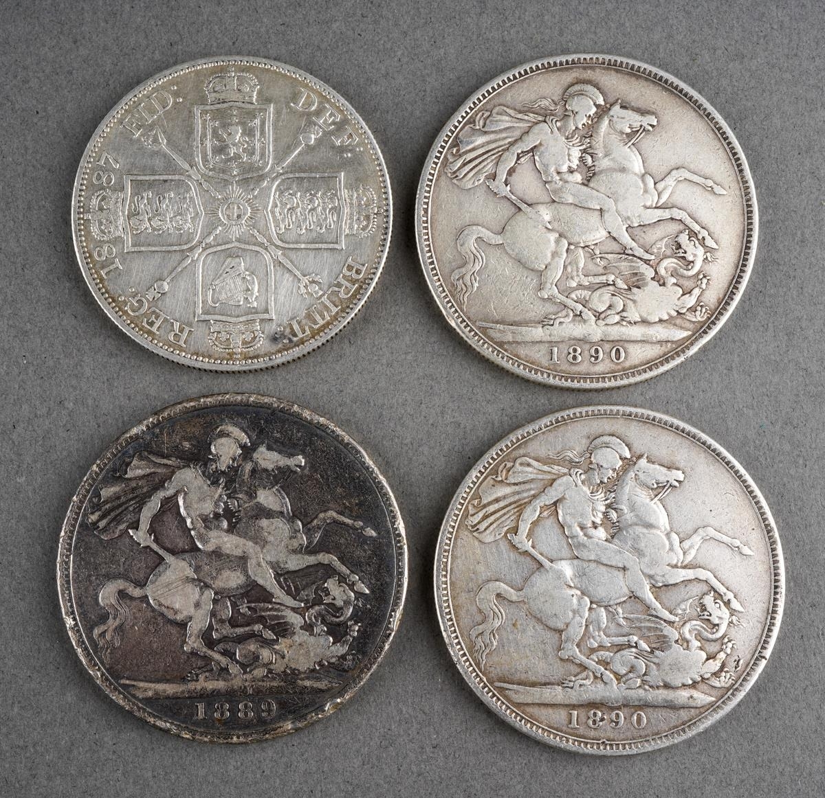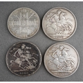 A collection of coins to include an 1887 Double Florin and three Victoria Crowns