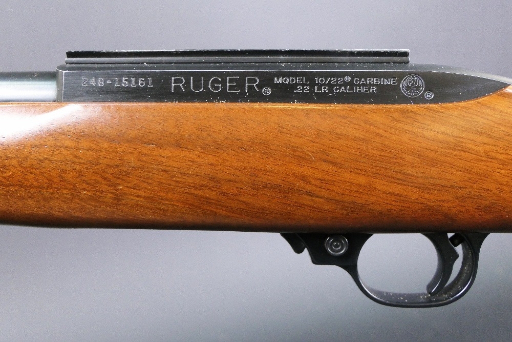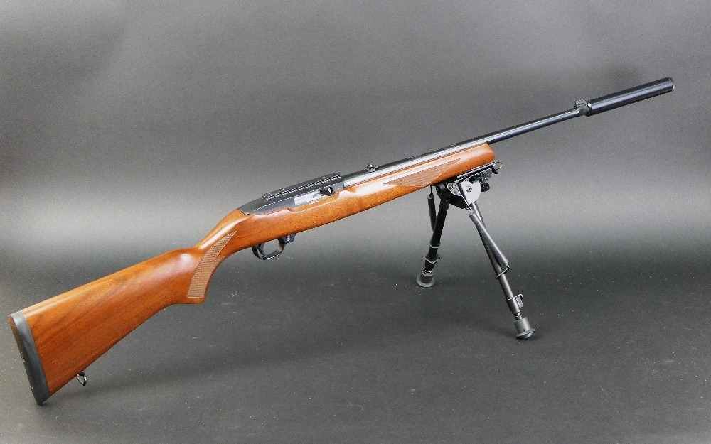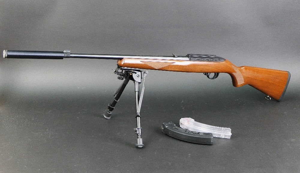 Ruger Model 10/22 carbine 22 LR semi automatic rifle, fitted with a sound moderator, bipod and scope mount, comes with two 25 round magazines and standard Ruger magazine, sound moderator no serial number. Rifle Serial No. 248-15161. FIREARMS CERTIFICATE REQUIRED X 2.