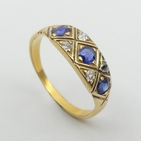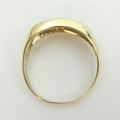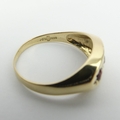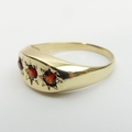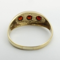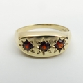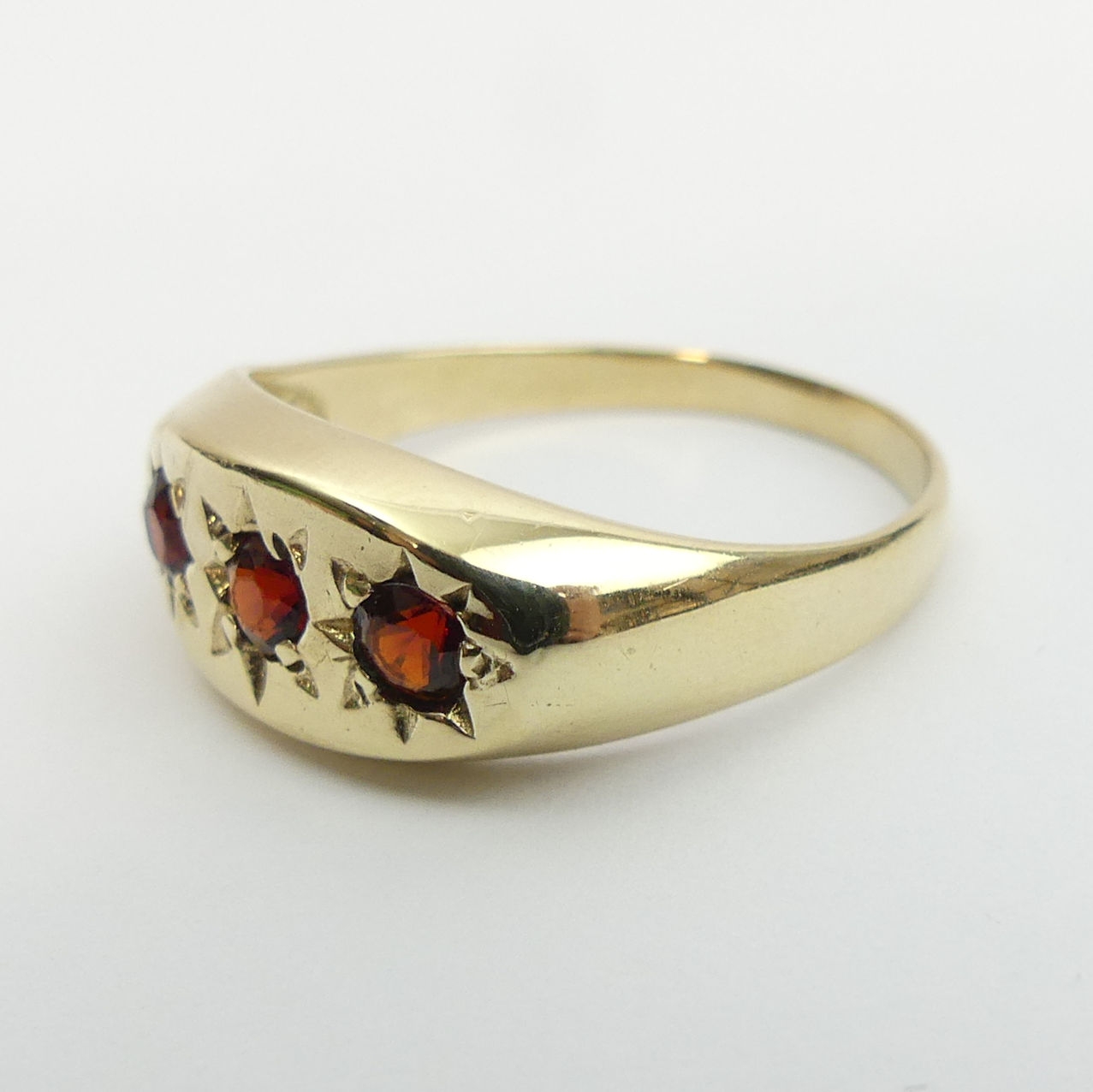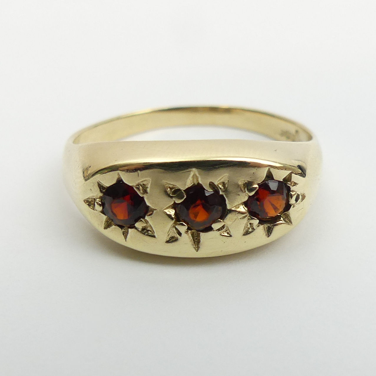 9ct gold three stone garnet ring, 3.4 grams. Size v, 9 mm. UK Postage £12.