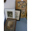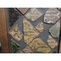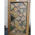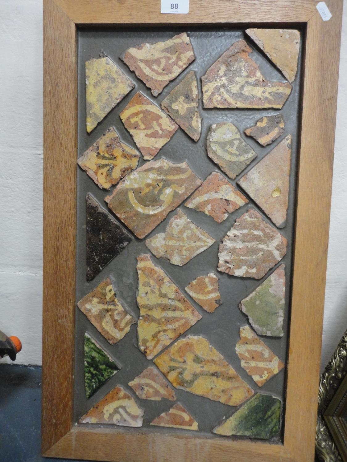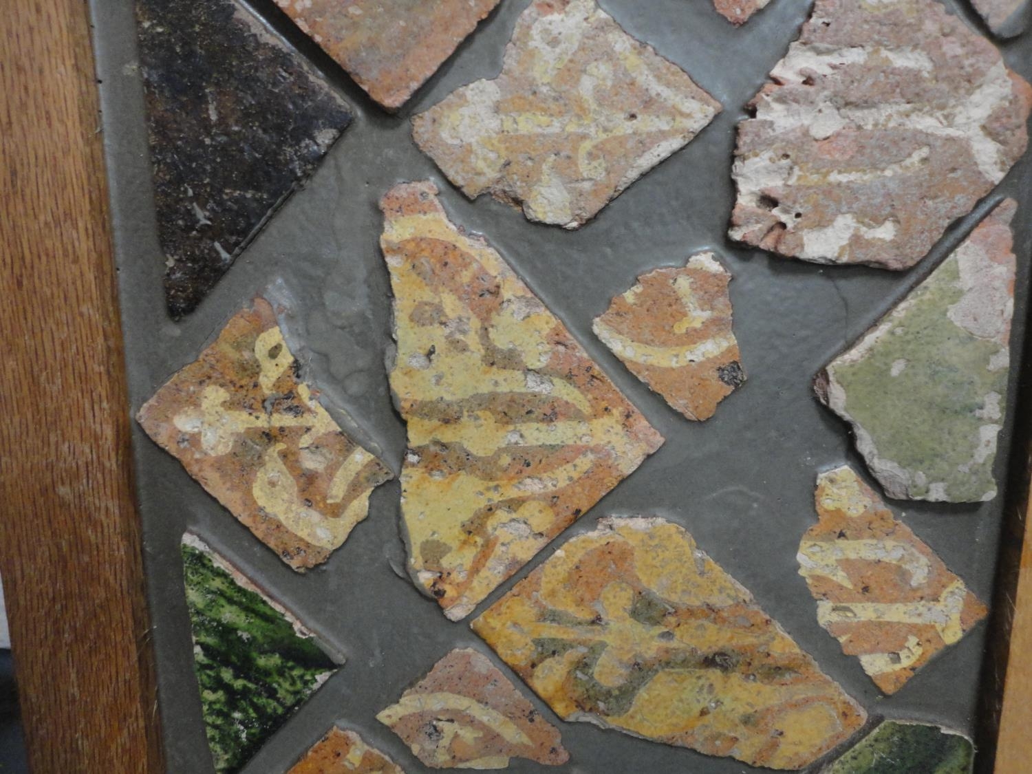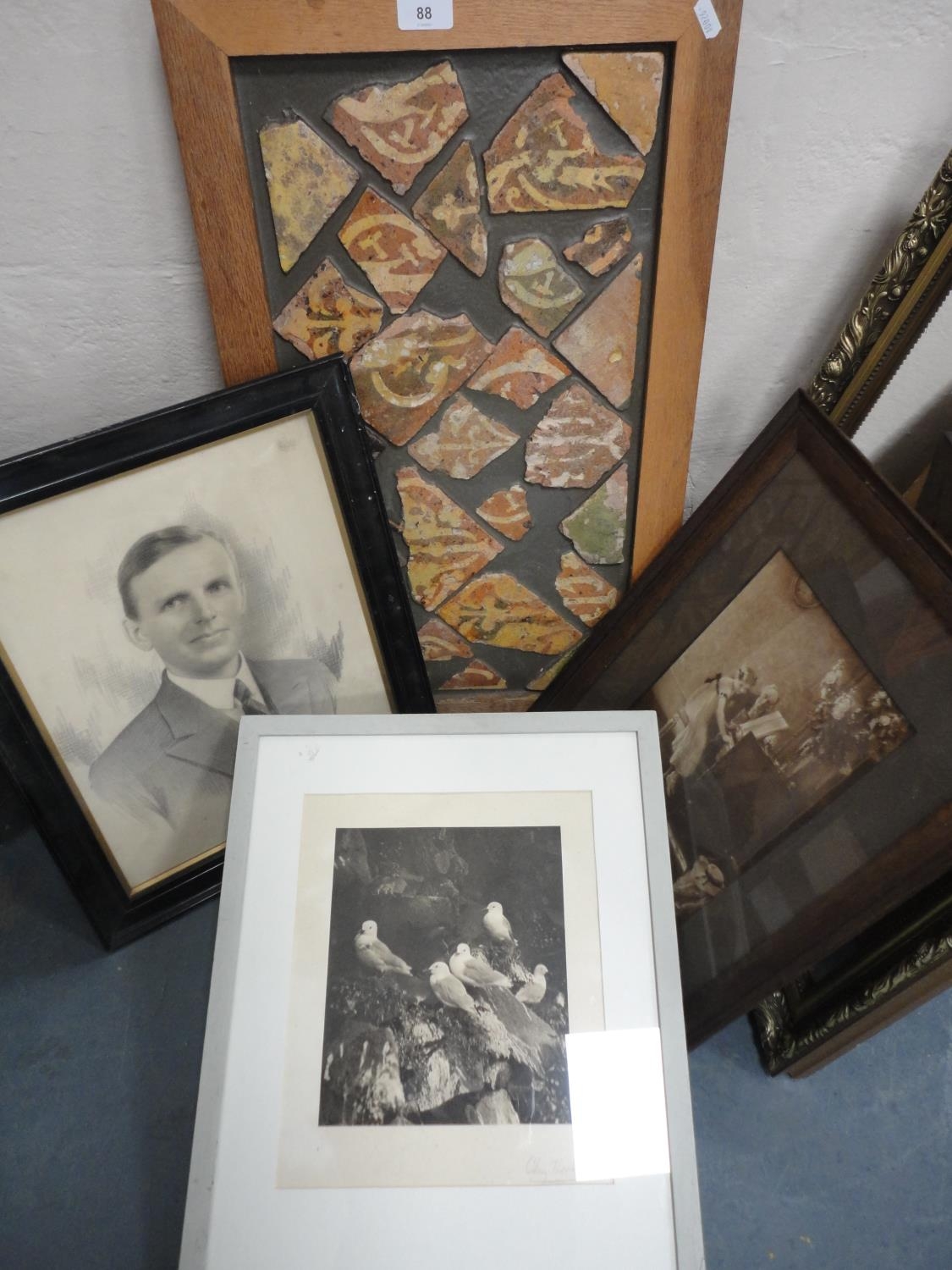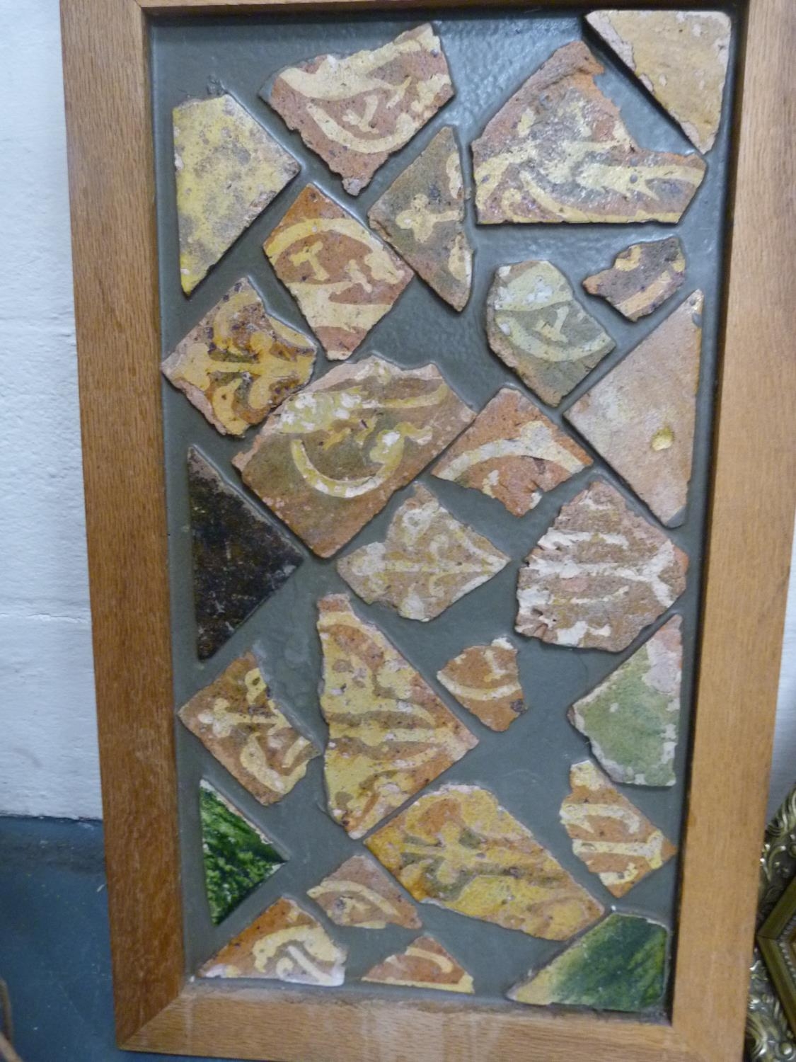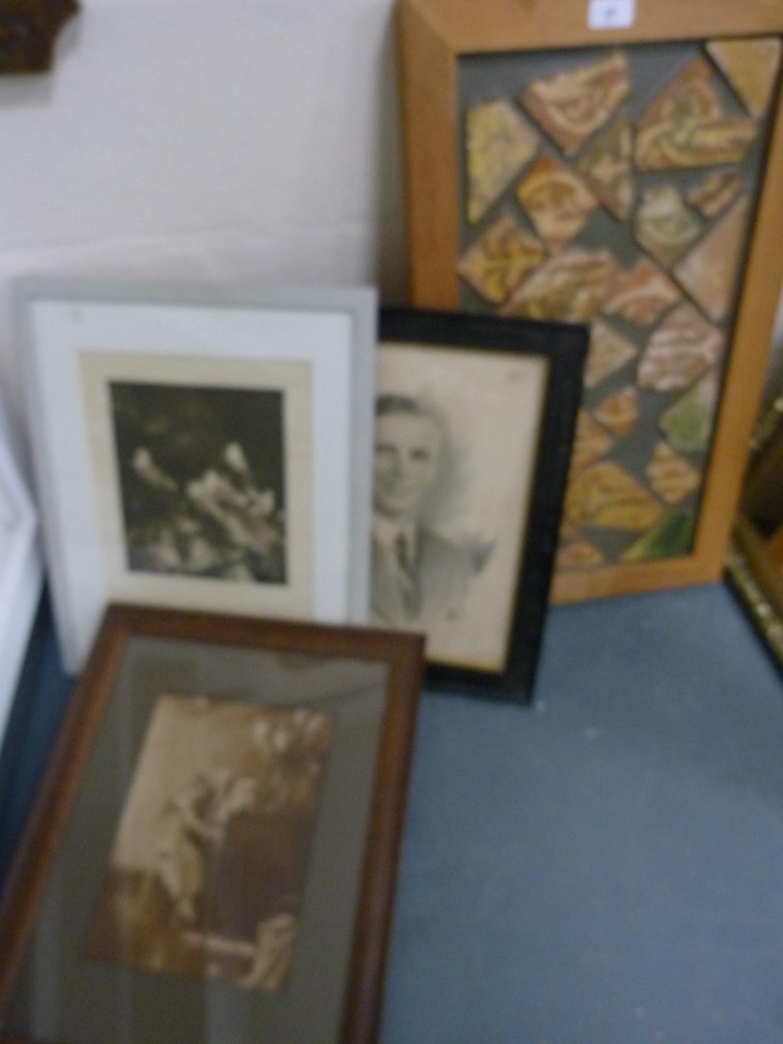 Wall hanging made with Medieval tile fragments reputedly from Lincoln Cathedral, three photographs including a portrait of a gentleman.