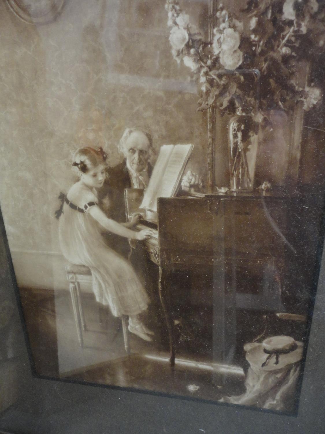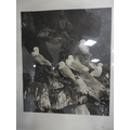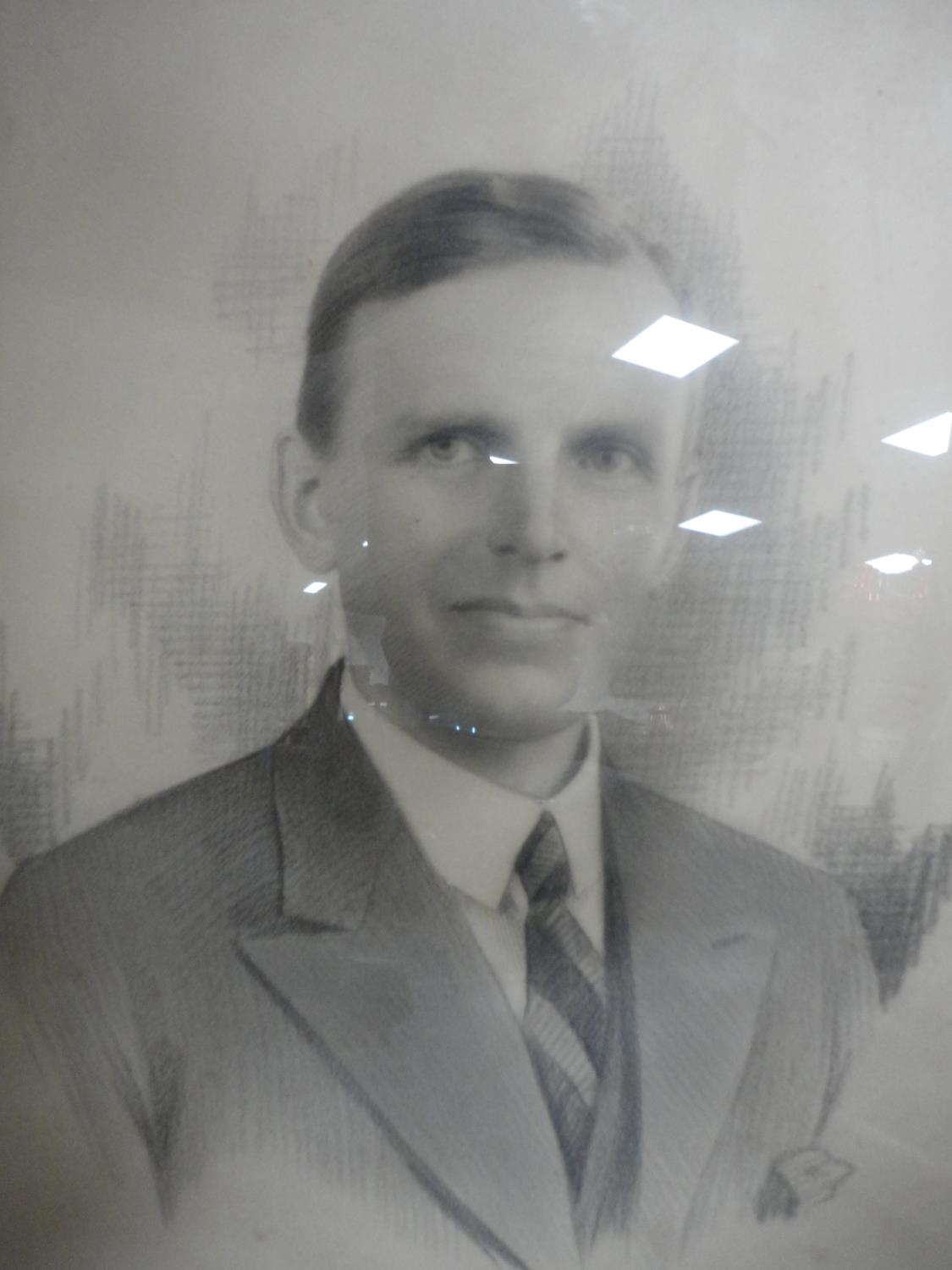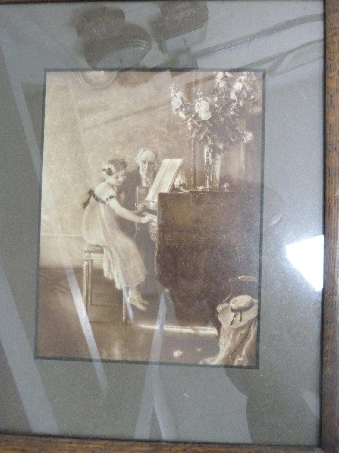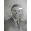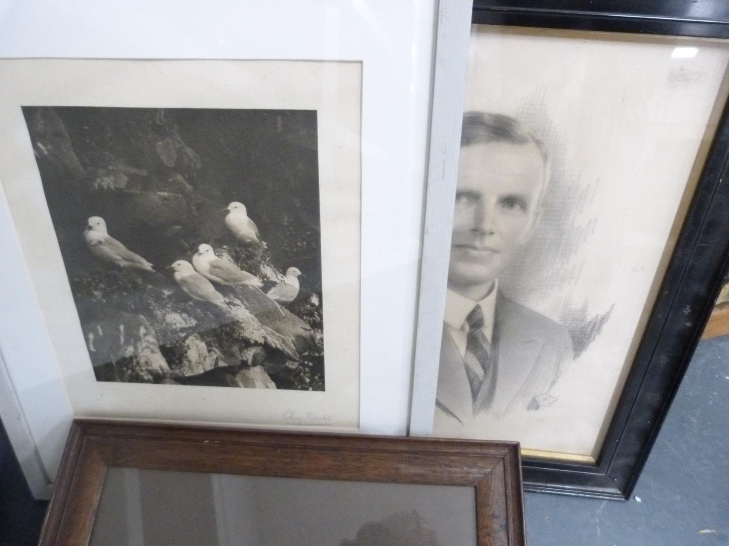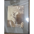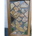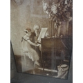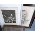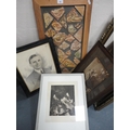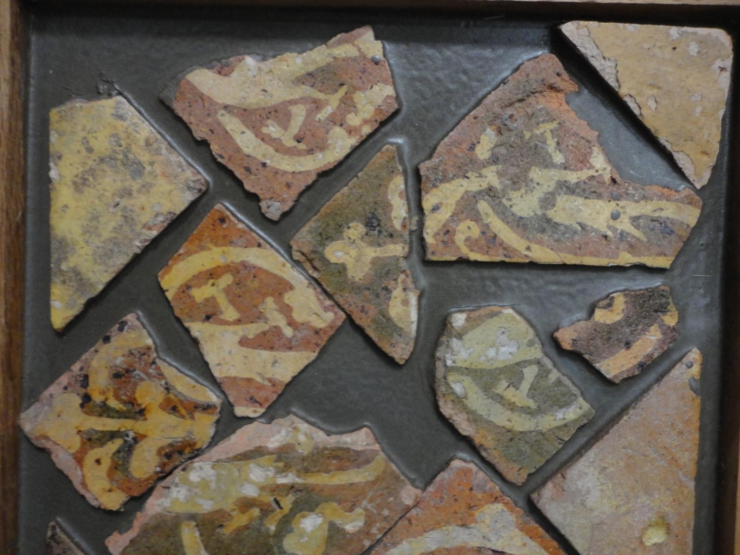 Wall hanging made with Medieval tile fragments reputedly from Lincoln Cathedral, three photographs including a portrait of a gentleman.