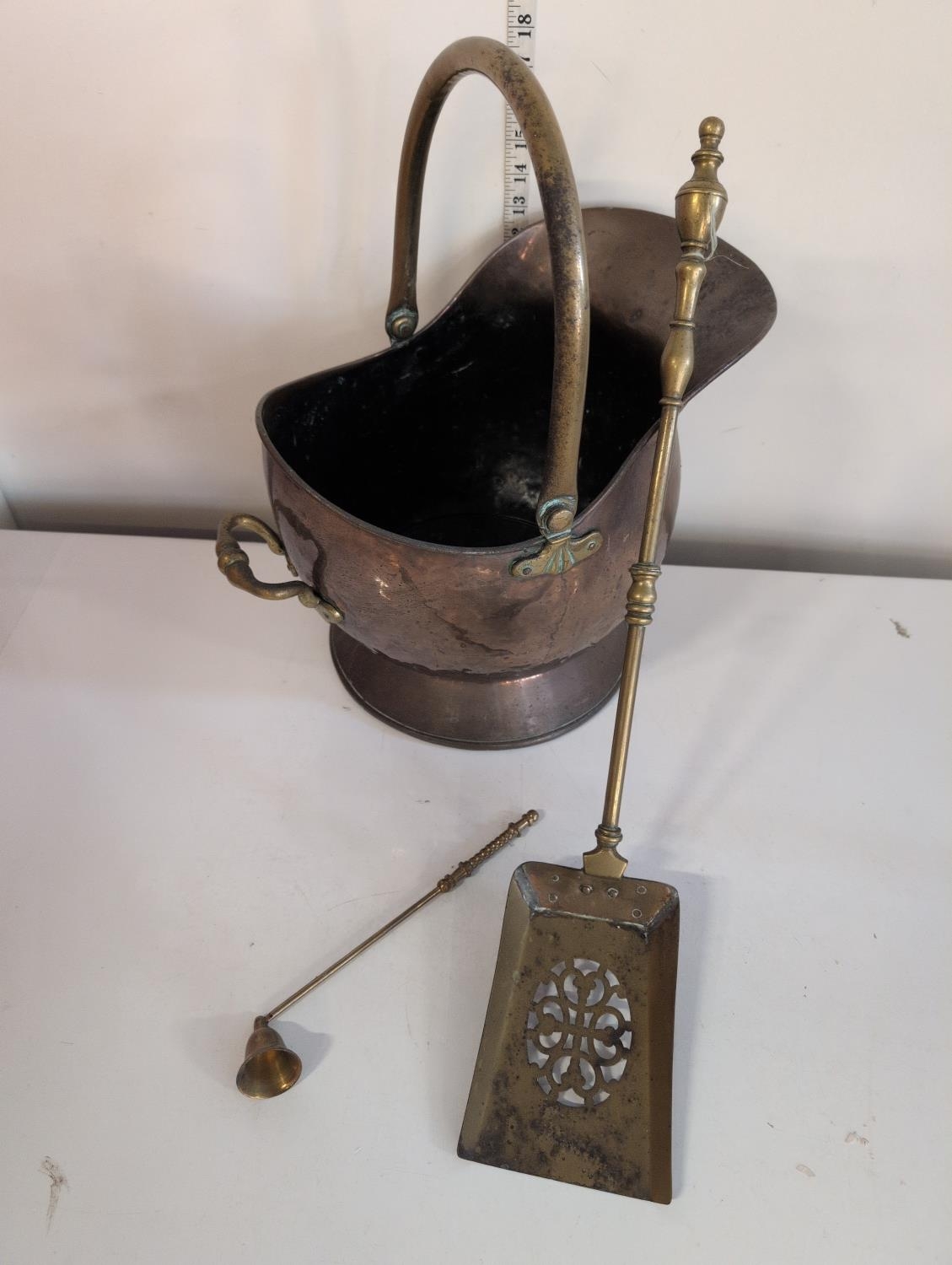 An Antique Victorian Copper Coal Scuttle and Two Brass Fireplace Tools, shipping unavailable