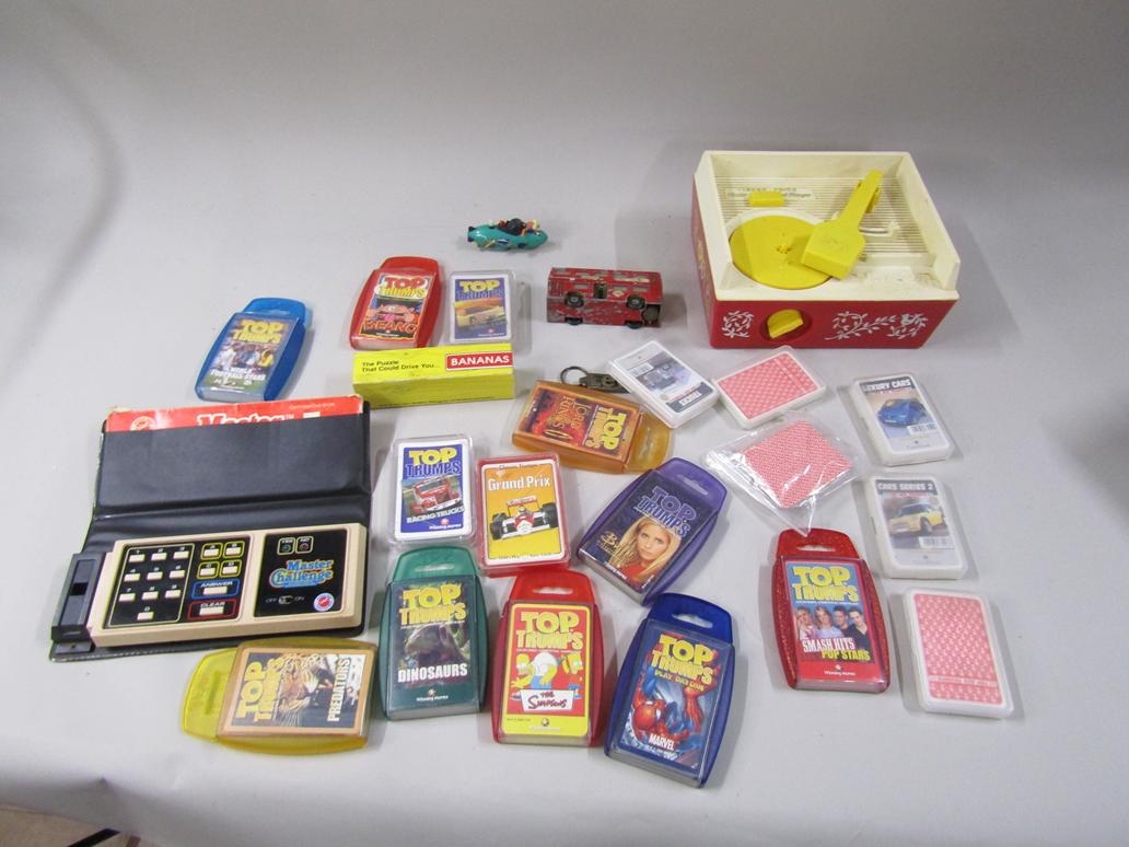BOX OF TOP TRUMPS, FISHER PRICE MUSICAL BOX RECORD PLAYER